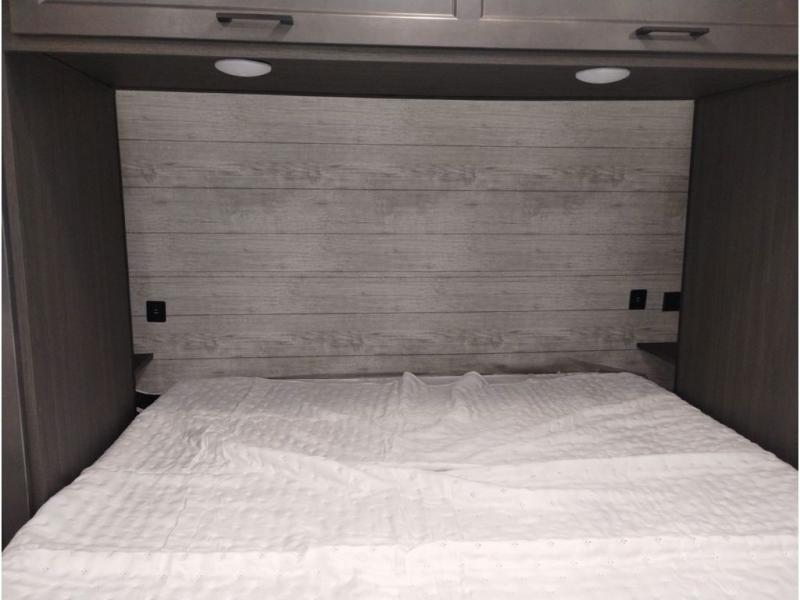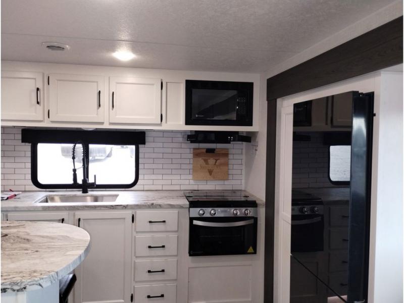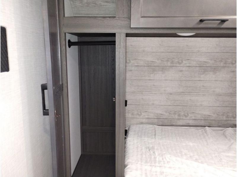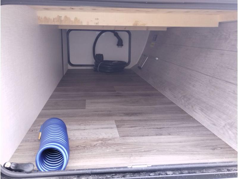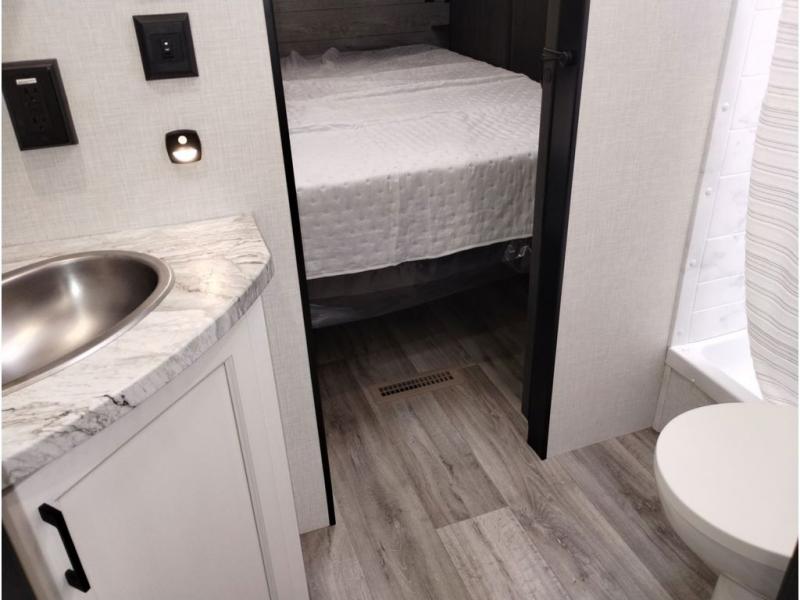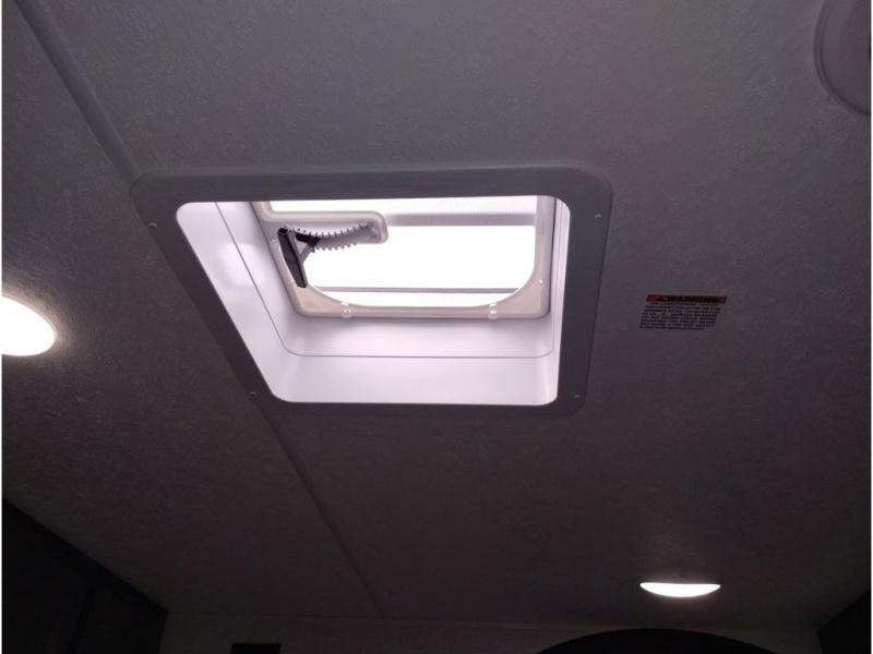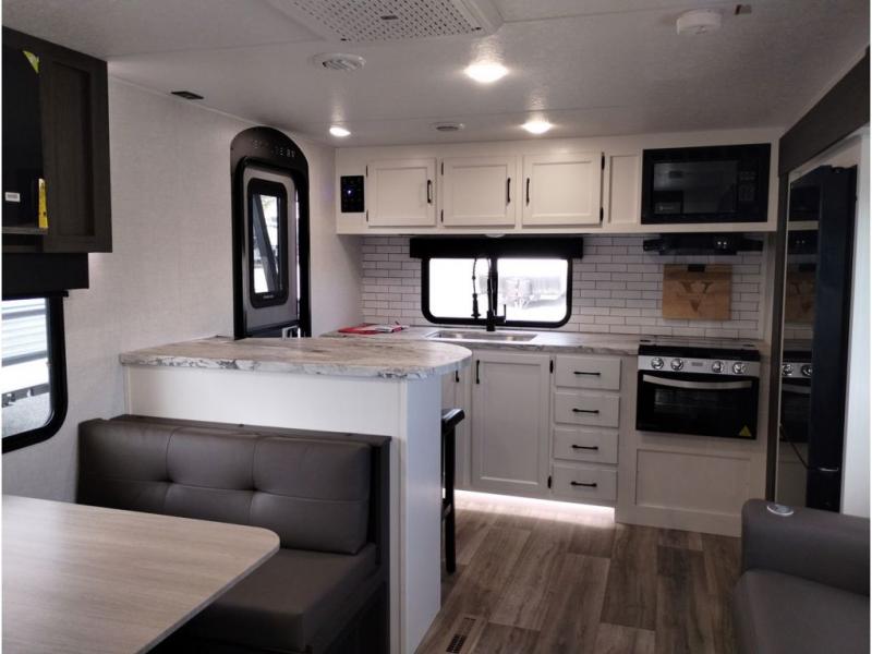 Sleep tight on the road! This travel trailer is special for four. First we have the 60" x 80" queen bed, and two people can easily fit on the sit n' slide dinette. Cook delicious dinner in the incredible kitchen. The counter includes a stainless steel sink with cover and dish drying racks, three cooktop burner, and an overhead cabinet. There is also a 10 cu. fridge and pantry for food storage. You can also have a relaxing time on the theater seating with USB port on each side. Store your belongings in the dual wardrobe beside the bed and also on the pass thru storage. Finally, take a relaxing bath in the walk thru bathroom furnished with a 30" x 36" shower.