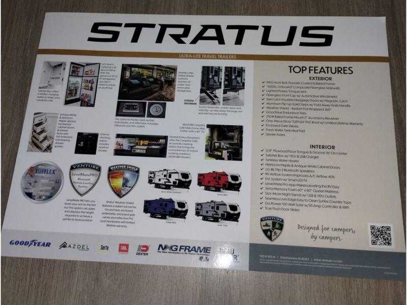 Each one of these Venture RV Stratus Ultra-Lite travel trailers have an eye-catching exterior! The exclusive JBL Flip Bluetooth Speaker is easy and user friendly with your smartphone at the touch of a button. Azdel composite panels are 50% lighter than wood, prevent mold, mildew, rotting, and warping, are unaffected by temperature and humidity changes, have a superior thermal insulation, and superior sound absorption, plus there is no formaldehyde. Experience the next generation in RV frame technology with the NXG frame which is constructed with high strength low alloy prime steel and has been track tested to prove its durability. These units also have an award winning NXG slide technology for years of trouble-free performance!