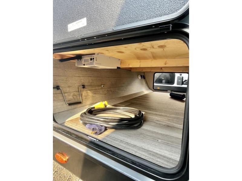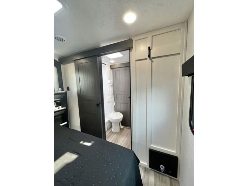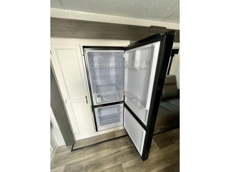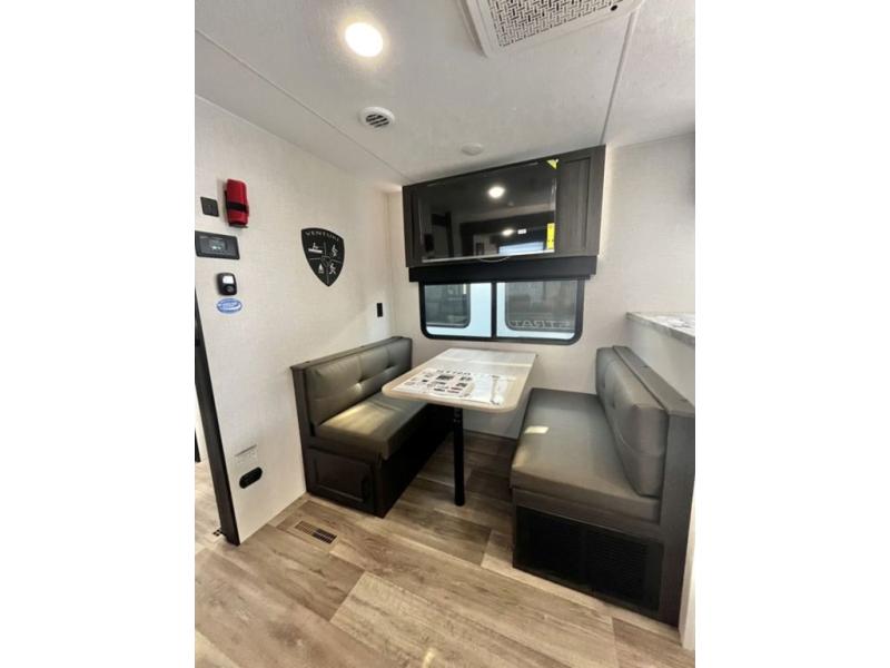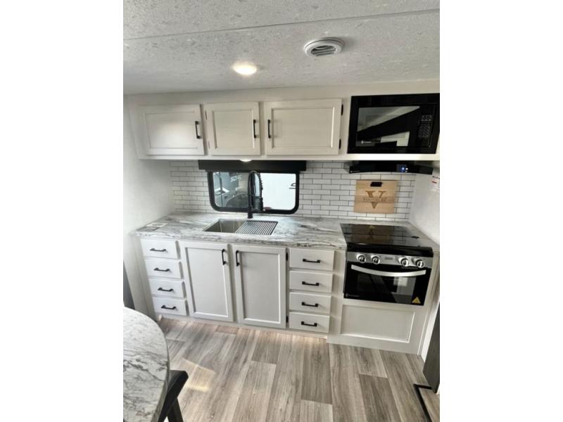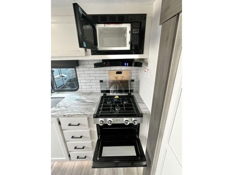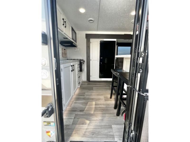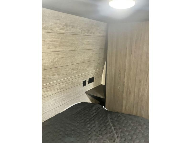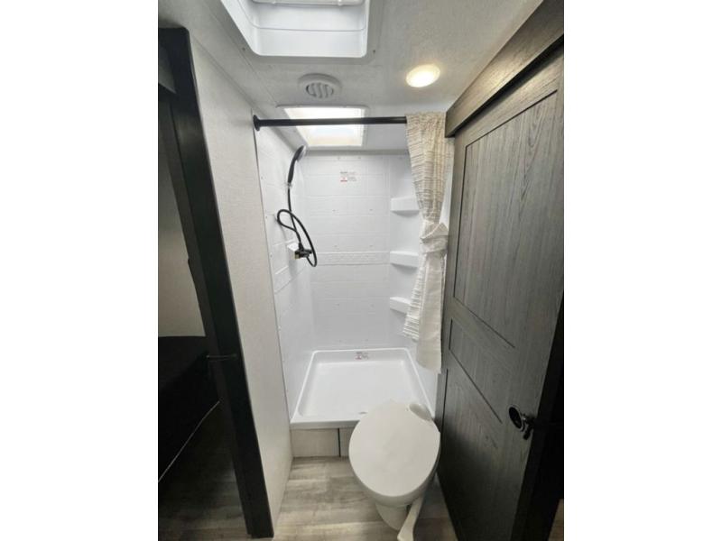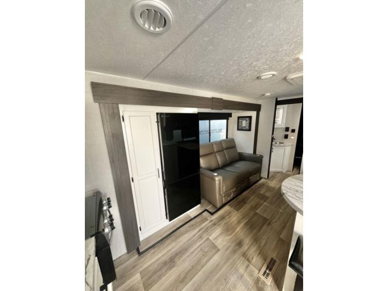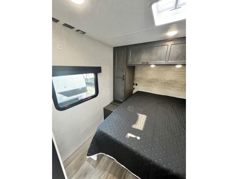Sleep tight on the road! This travel trailer is special for four. First we have the 60" x 80" queen bed, and two people can easily fit on the sit n' slide dinette. Cook delicious dinner in the incredible kitchen. The counter includes a stainless steel sink with cover and dish drying racks, three cooktop burner, and an overhead cabinet. There is also a 10 cu. fridge and pantry for food storage. You can also have a relaxing time on the theater seating with USB port on each side. Store your belongings in the dual wardrobe beside the bed and also on the pass thru storage. Finally, take a relaxing bath in the walk thru bathroom furnished with a 30" x 36" shower.