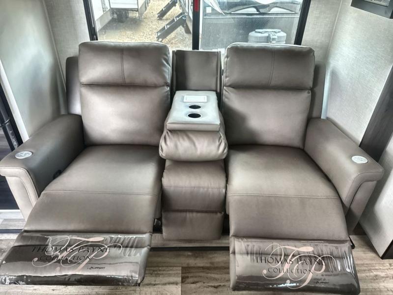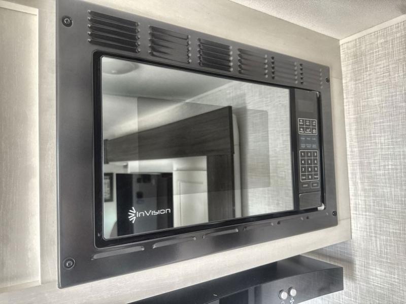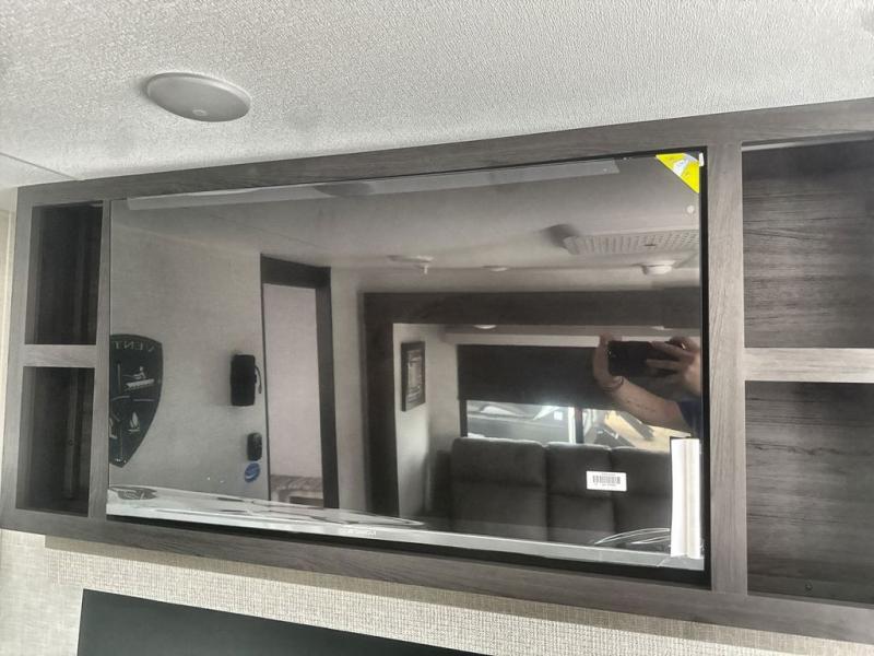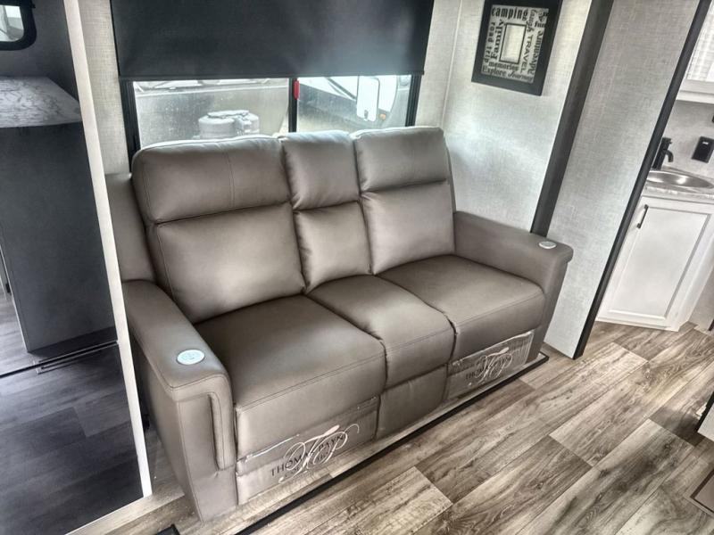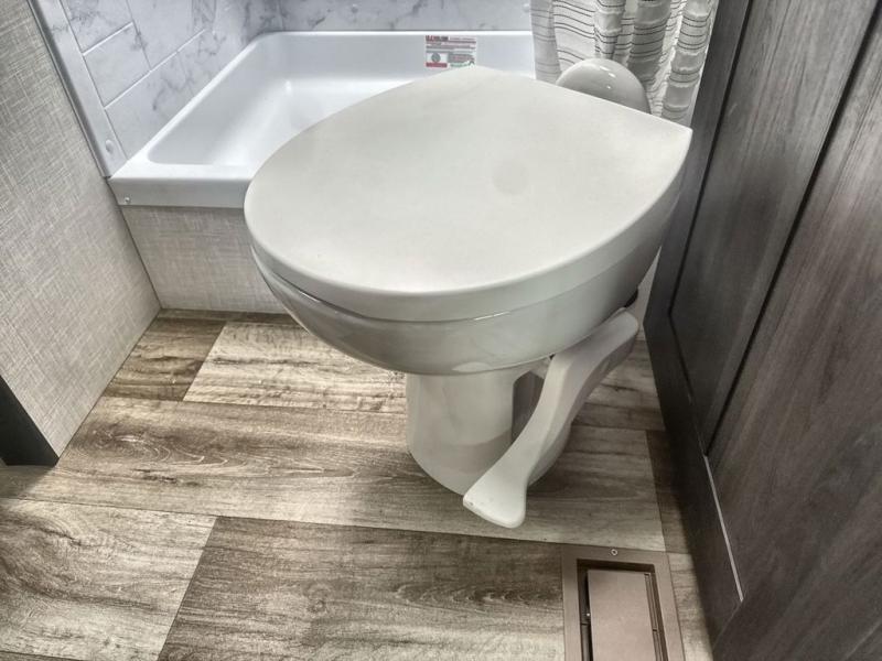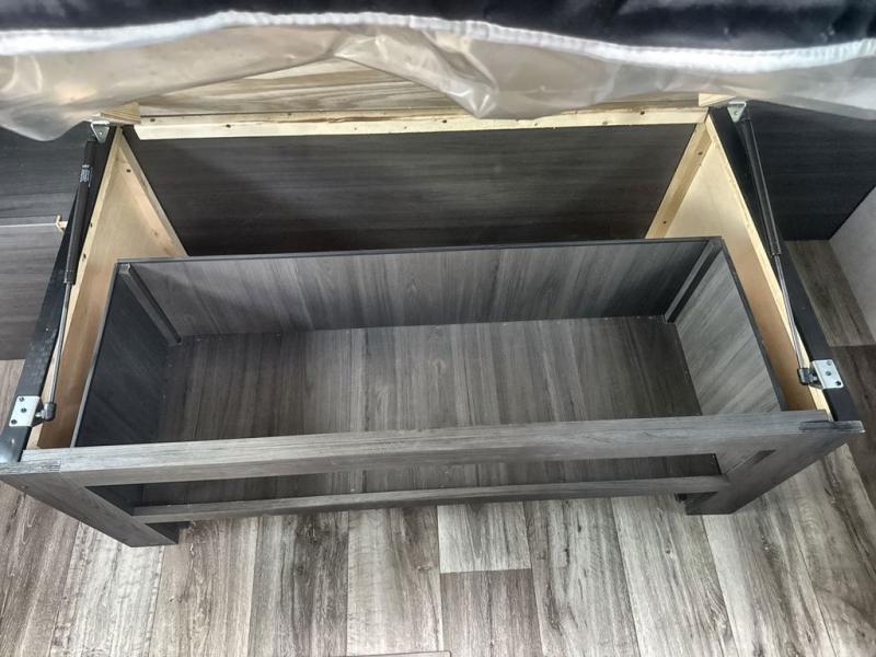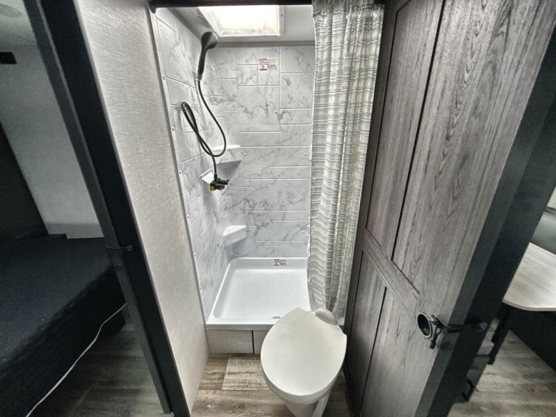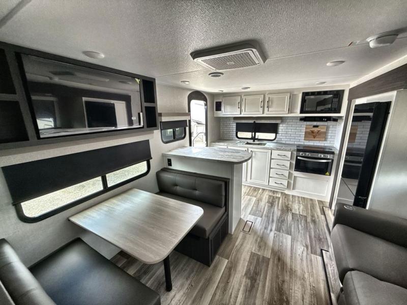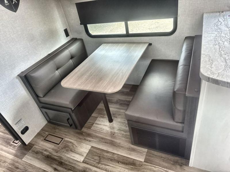 Sleep tight on the road! This travel trailer is special for four. First we have the 60" x 80" queen bed, and two people can easily fit on the sit n' slide dinette. Cook delicious dinner in the incredible kitchen. The counter includes a stainless steel sink with cover and dish drying racks, three cooktop burner, and an overhead cabinet. There is also a 10 cu. fridge and pantry for food storage. You can also have a relaxing time on the theater seating with USB port on each side. Store your belongings in the dual wardrobe beside the bed and also on the pass thru storage. Finally, take a relaxing bath in the walk thru bathroom furnished with a 30" x 36" shower.