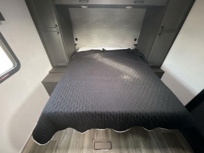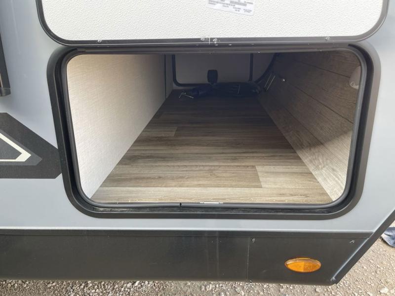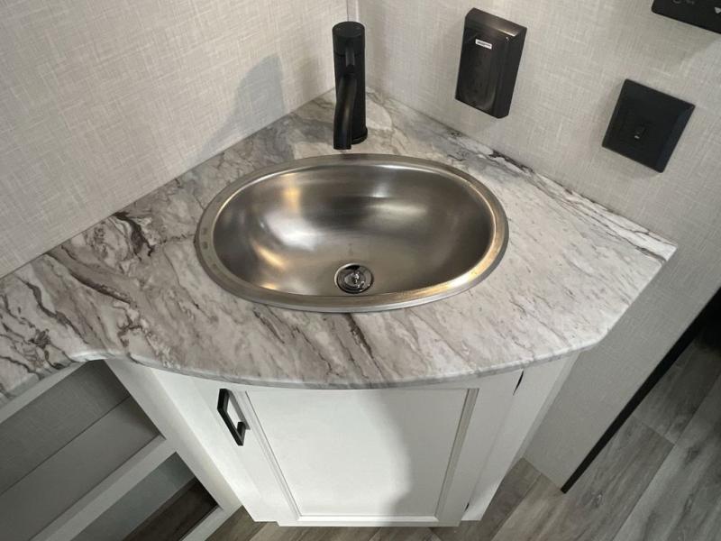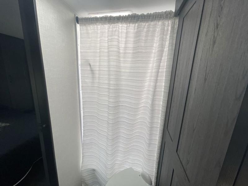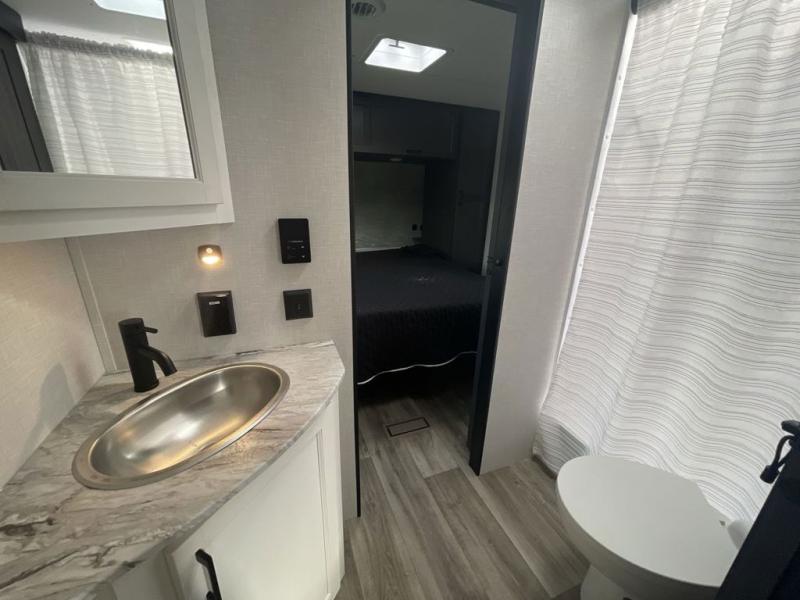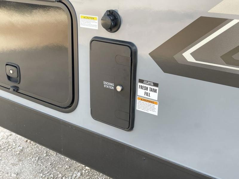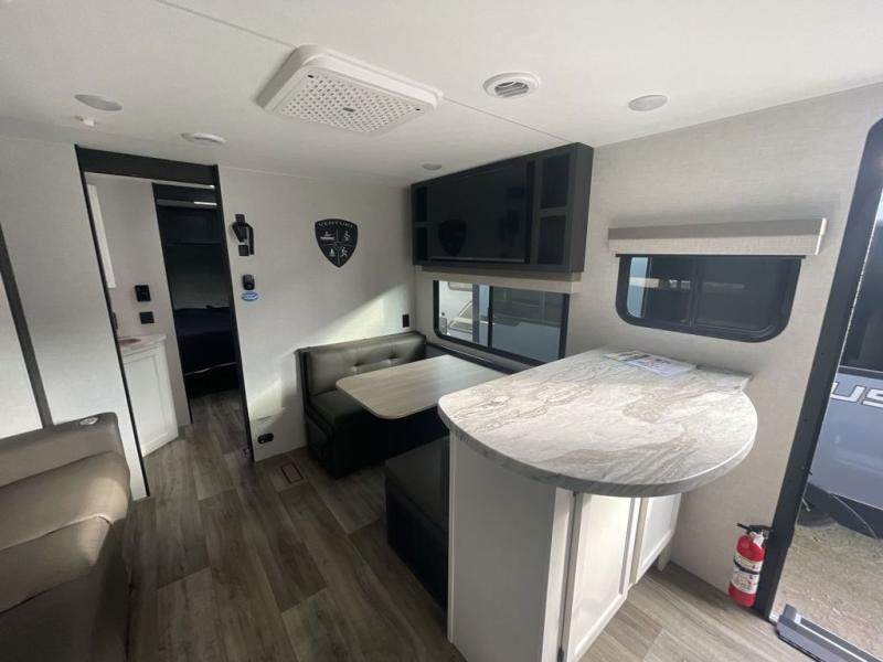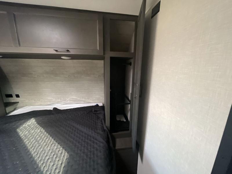 Sleep tight on the road! This travel trailer is special for four. First we have the 60" x 80" queen bed, and two people can easily fit on the sit n' slide dinette. Cook delicious dinner in the incredible kitchen. The counter includes a stainless steel sink with cover and dish drying racks, three cooktop burner, and an overhead cabinet. There is also a 10 cu. fridge and pantry for food storage. You can also have a relaxing time on the theater seating with USB port on each side. Store your belongings in the dual wardrobe beside the bed and also on the pass thru storage. Finally, take a relaxing bath in the walk thru bathroom furnished with a 30" x 36" shower.