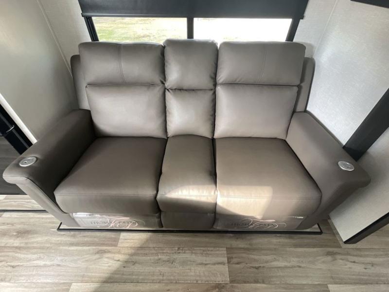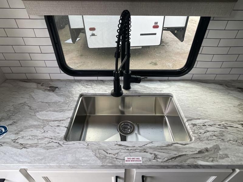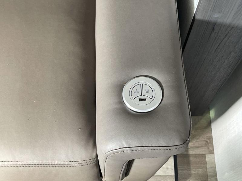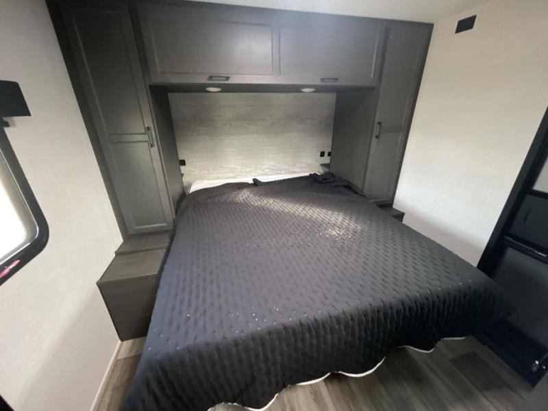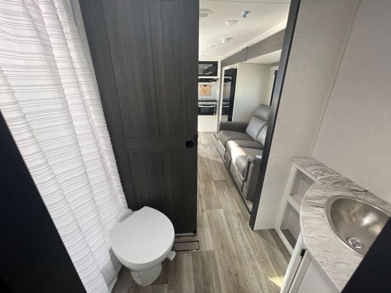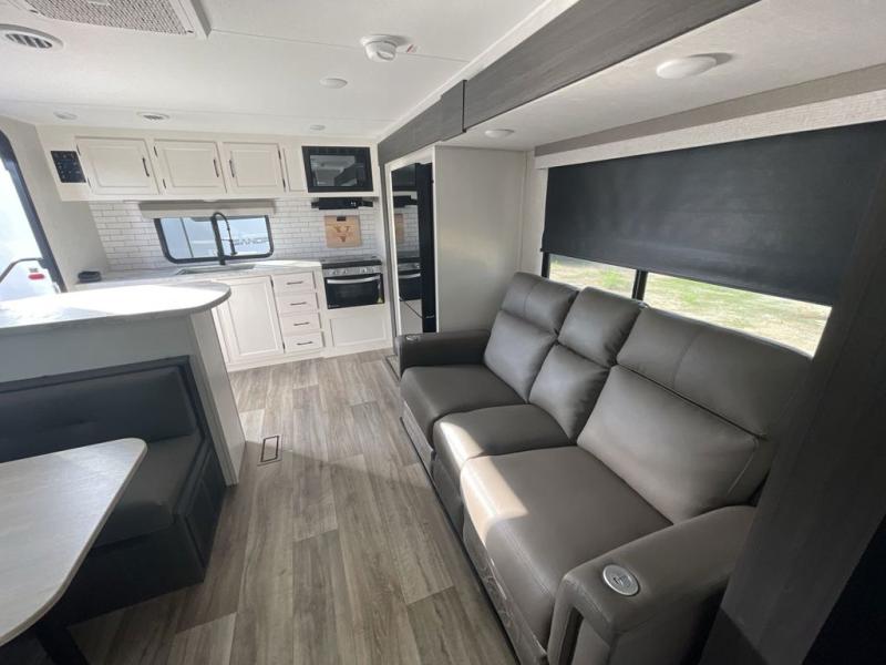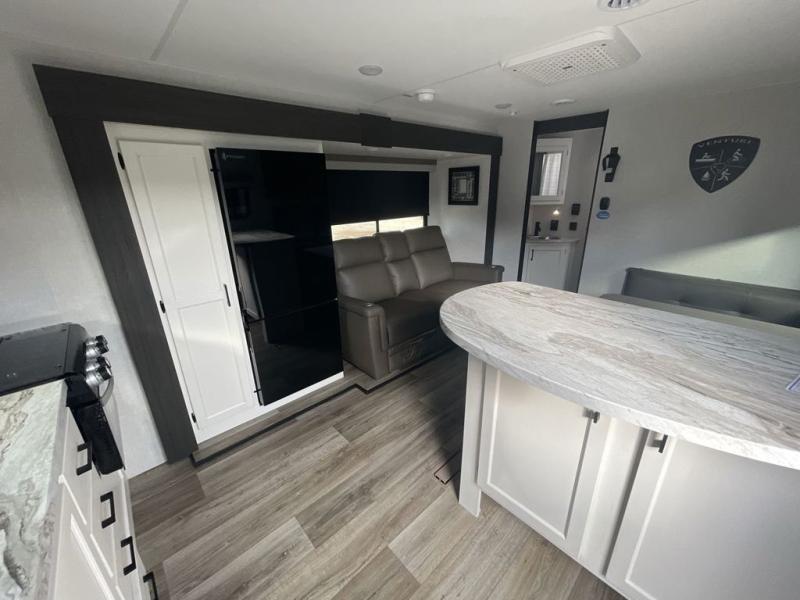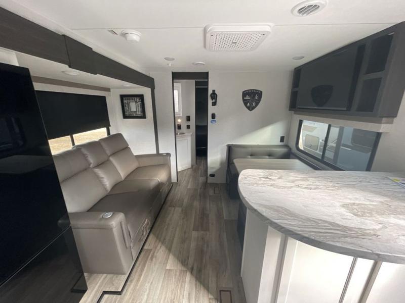 Sleep tight on the road! This travel trailer is special for four. First we have the 60" x 80" queen bed, and two people can easily fit on the sit n' slide dinette. Cook delicious dinner in the incredible kitchen. The counter includes a stainless steel sink with cover and dish drying racks, three cooktop burner, and an overhead cabinet. There is also a 10 cu. fridge and pantry for food storage. You can also have a relaxing time on the theater seating with USB port on each side. Store your belongings in the dual wardrobe beside the bed and also on the pass thru storage. Finally, take a relaxing bath in the walk thru bathroom furnished with a 30" x 36" shower.