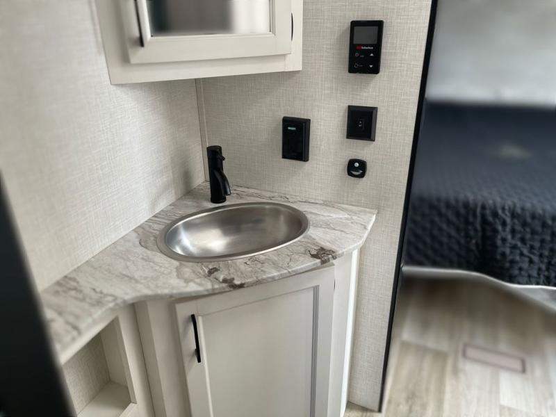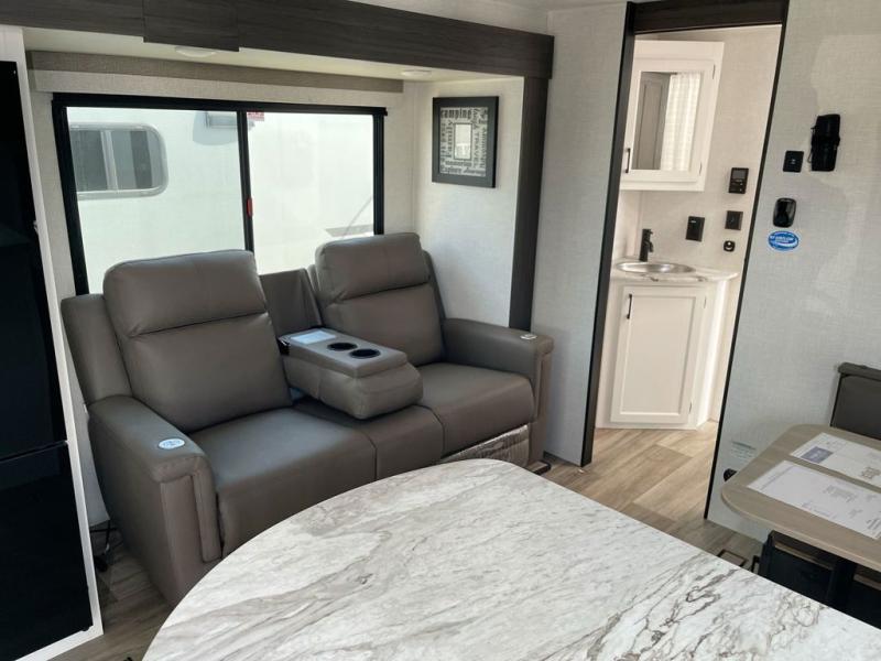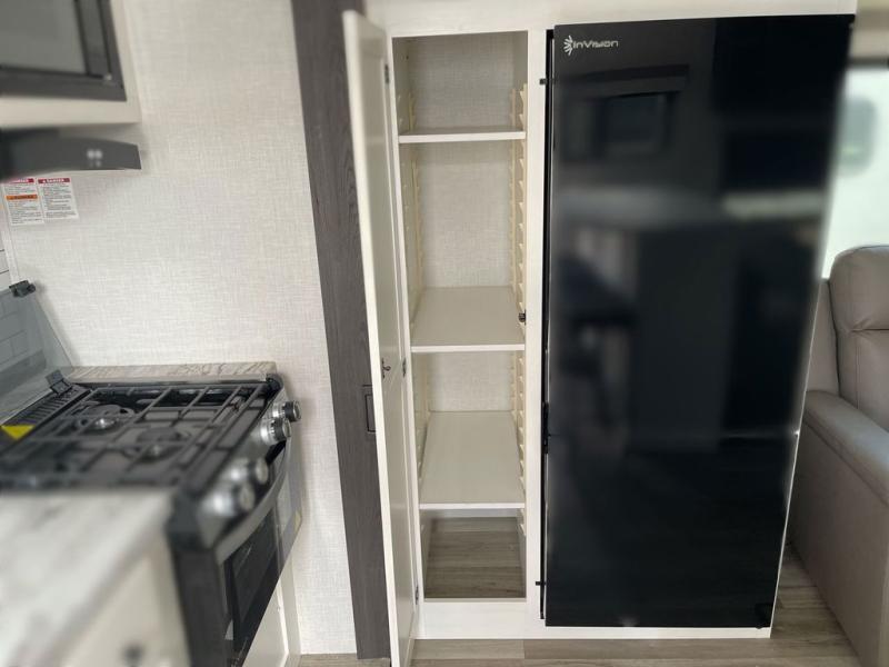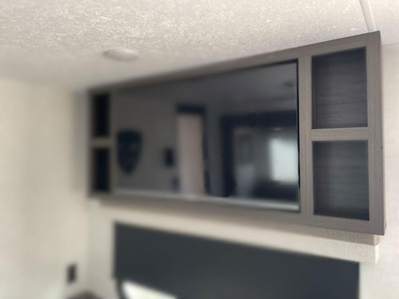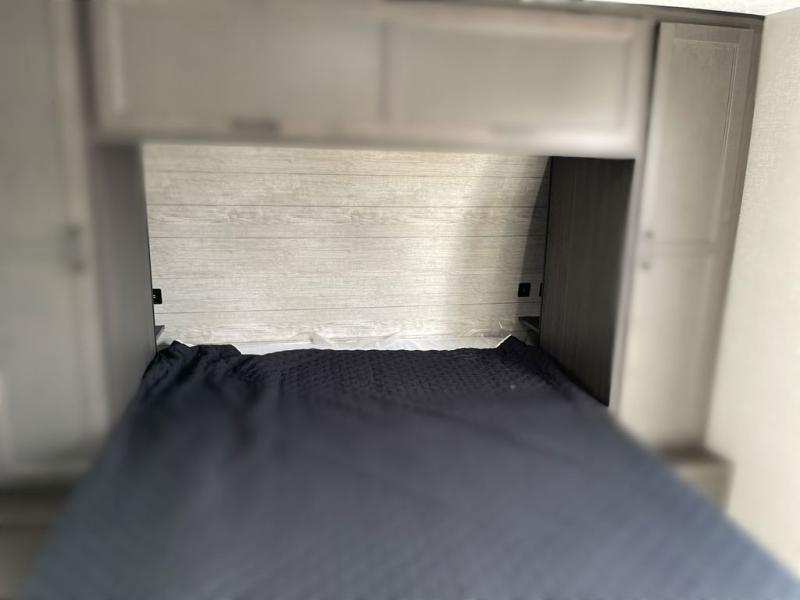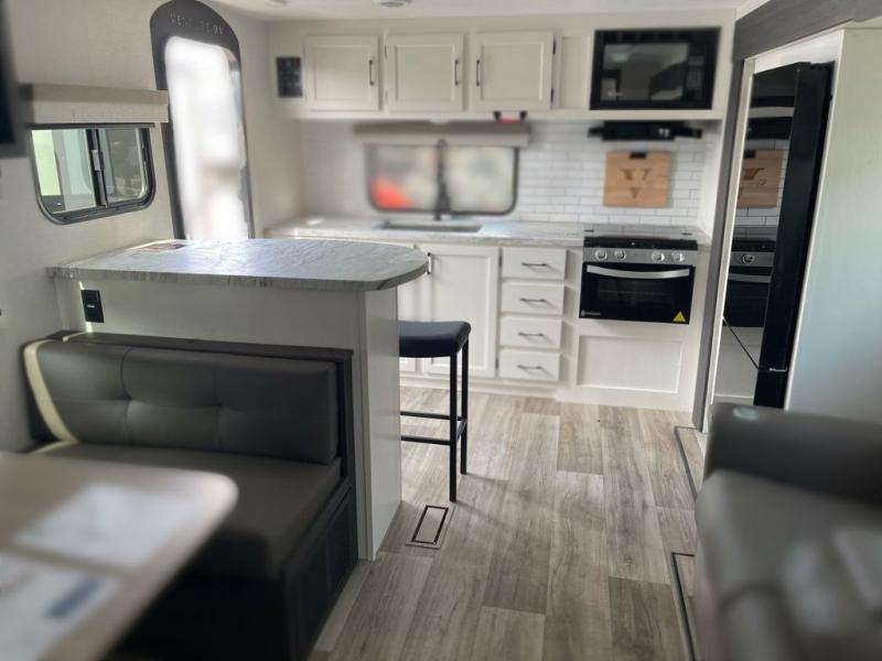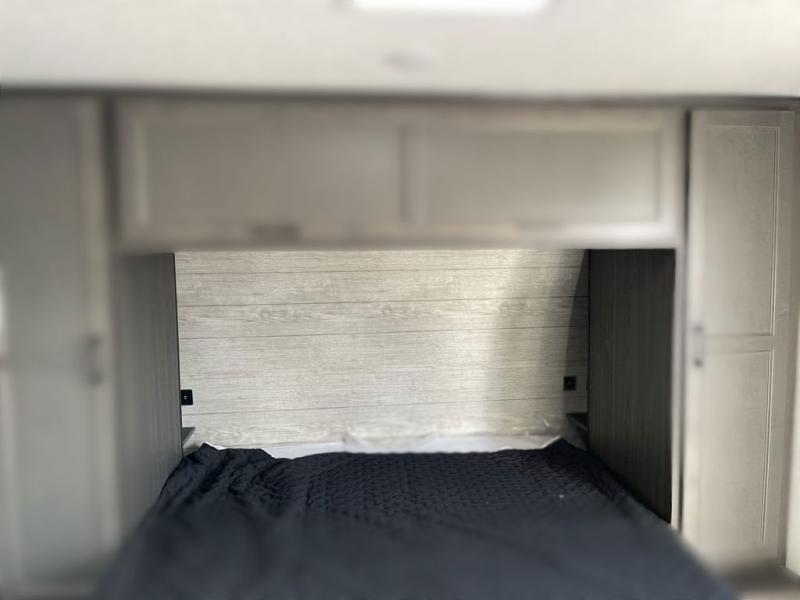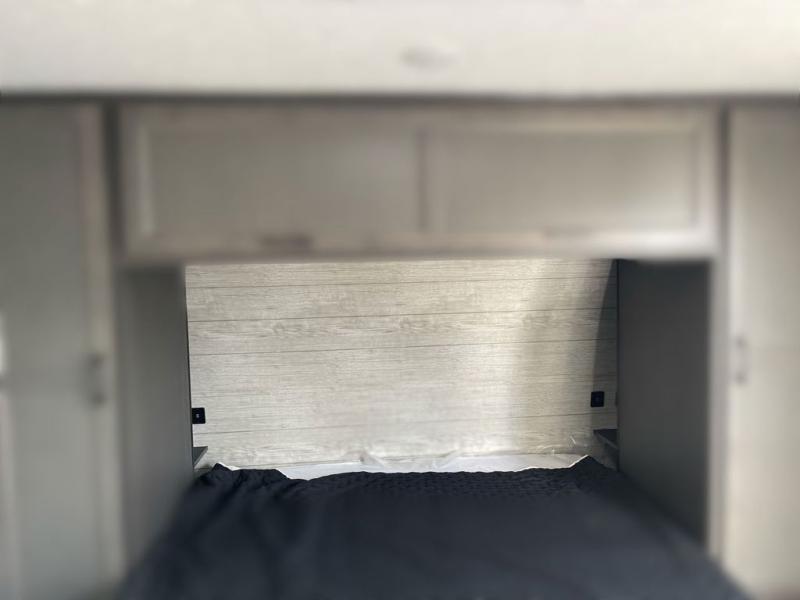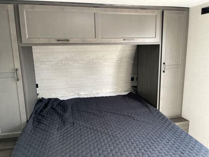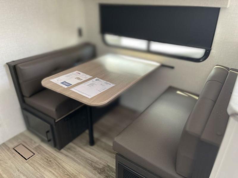 Sleep tight on the road! This travel trailer is special for four. First we have the 60" x 80" queen bed, and two people can easily fit on the sit n' slide dinette. Cook delicious dinner in the incredible kitchen. The counter includes a stainless steel sink with cover and dish drying racks, three cooktop burner, and an overhead cabinet. There is also a 10 cu. fridge and pantry for food storage. You can also have a relaxing time on the theater seating with USB port on each side. Store your belongings in the dual wardrobe beside the bed and also on the pass thru storage. Finally, take a relaxing bath in the walk thru bathroom furnished with a 30" x 36" shower.