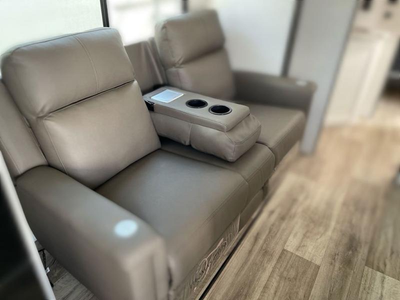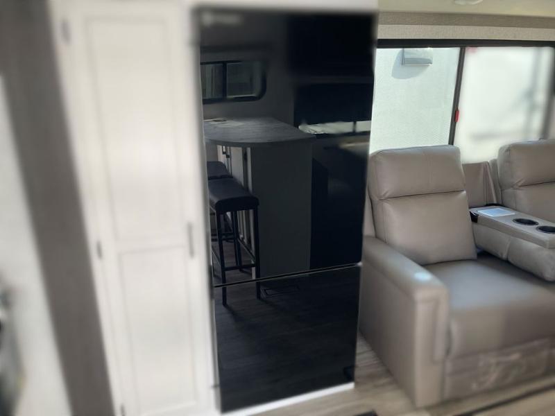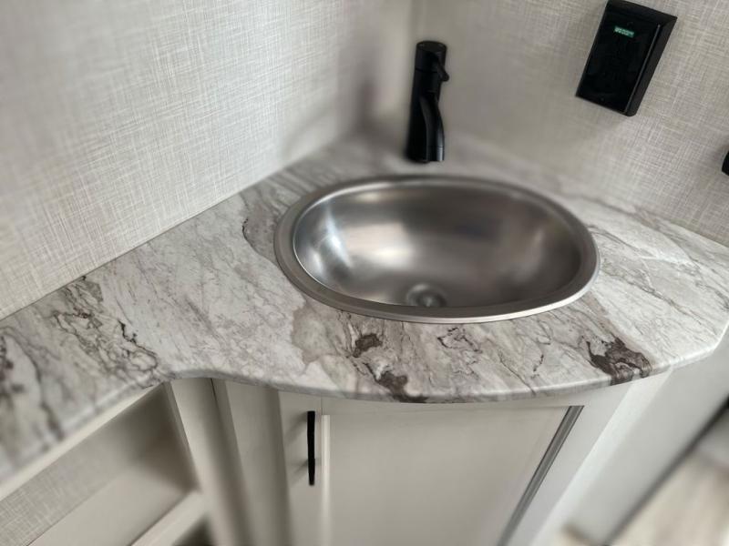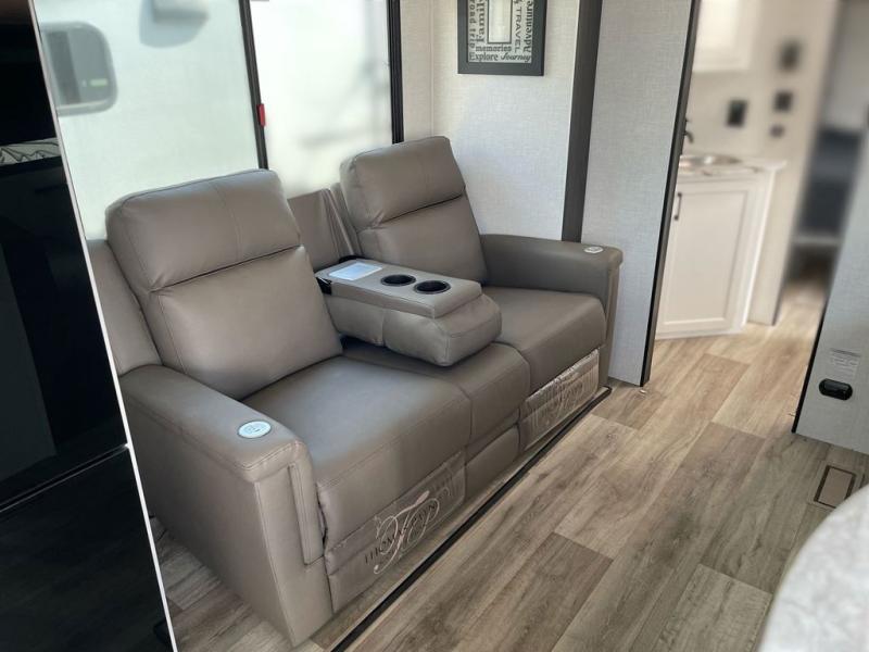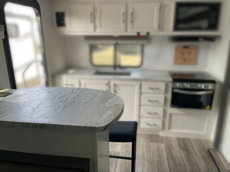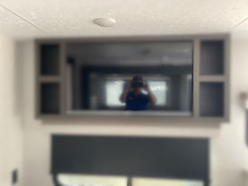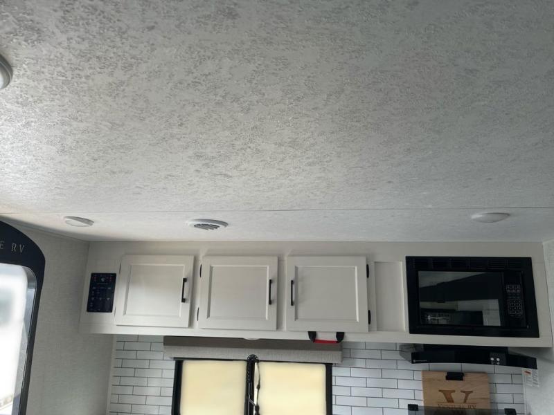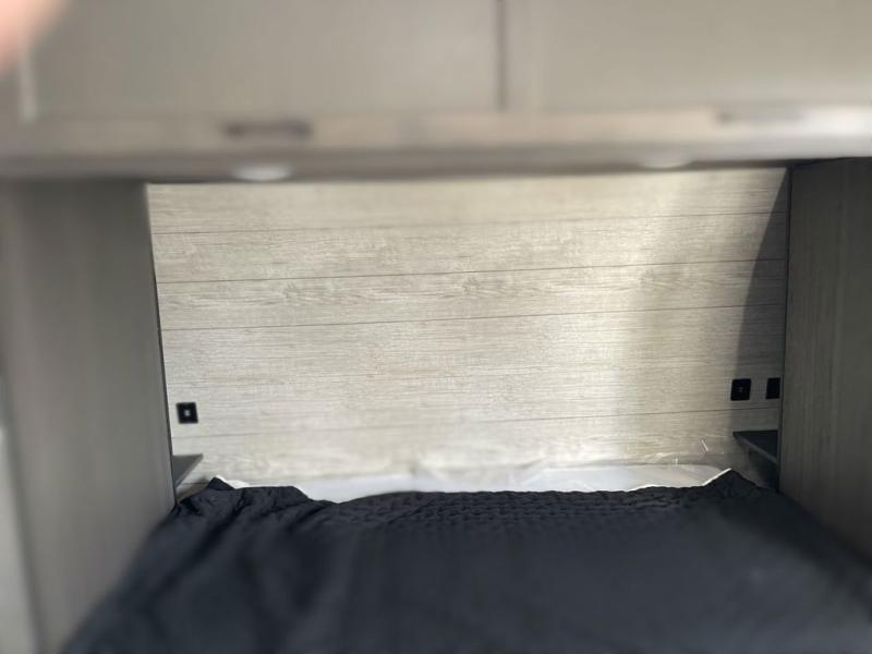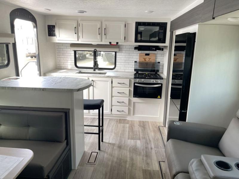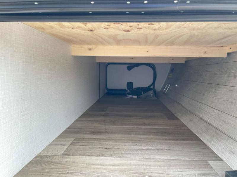 Sleep tight on the road! This travel trailer is special for four. First we have the 60" x 80" queen bed, and two people can easily fit on the sit n' slide dinette. Cook delicious dinner in the incredible kitchen. The counter includes a stainless steel sink with cover and dish drying racks, three cooktop burner, and an overhead cabinet. There is also a 10 cu. fridge and pantry for food storage. You can also have a relaxing time on the theater seating with USB port on each side. Store your belongings in the dual wardrobe beside the bed and also on the pass thru storage. Finally, take a relaxing bath in the walk thru bathroom furnished with a 30" x 36" shower.
