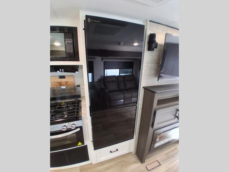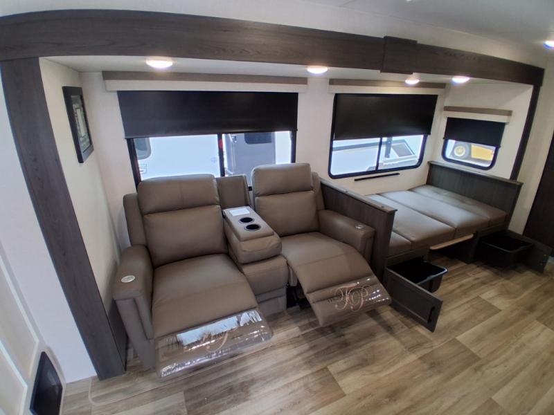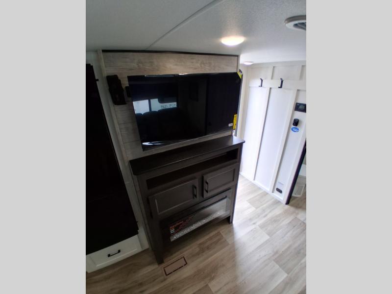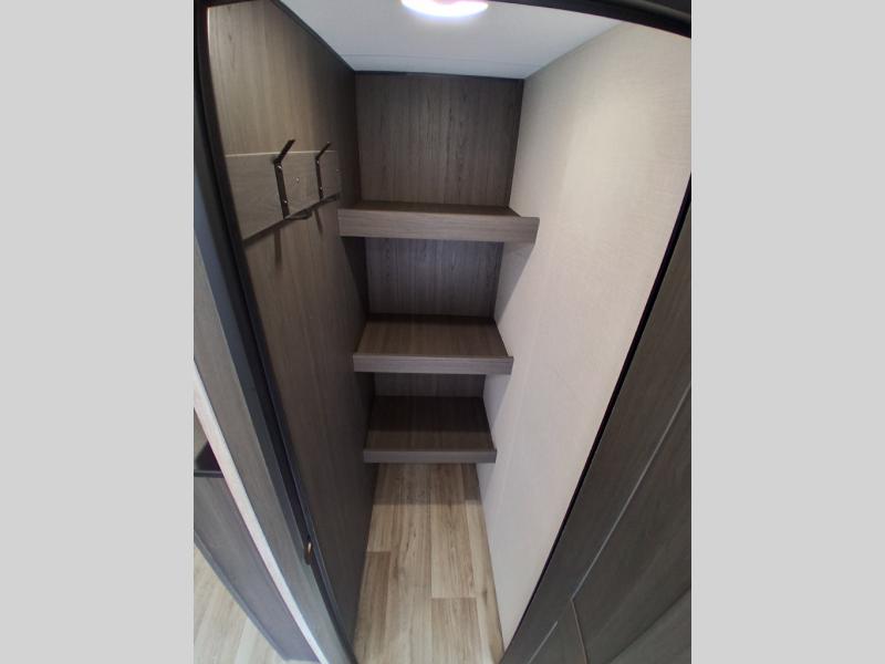You're going to feel right at home in this Stratus single slide unit! There is not only a fully equipped kitchen with a three burner cooktop, but also an outside campfire café with a griddle, refrigerator, sink, and even an exterior 40" TV for your entertainment. As you enter the unit, you will notice to the right a walk-in pantry with coat hooks, and to the left is the full rear bathroom with a 30" x 36" shower, a three door linen closet, and a cabinet prepped to add an optional washer and dryer. If mother nature rains on your parade then relax inside on either the 70" sofa or the sit n' slide table dinette across from the entertainment center.