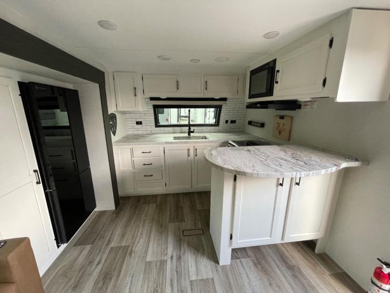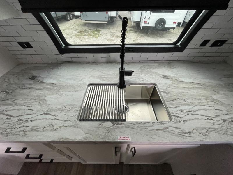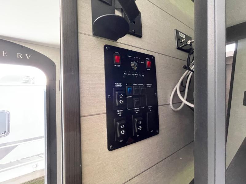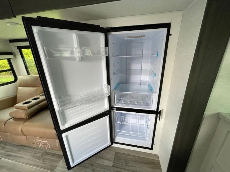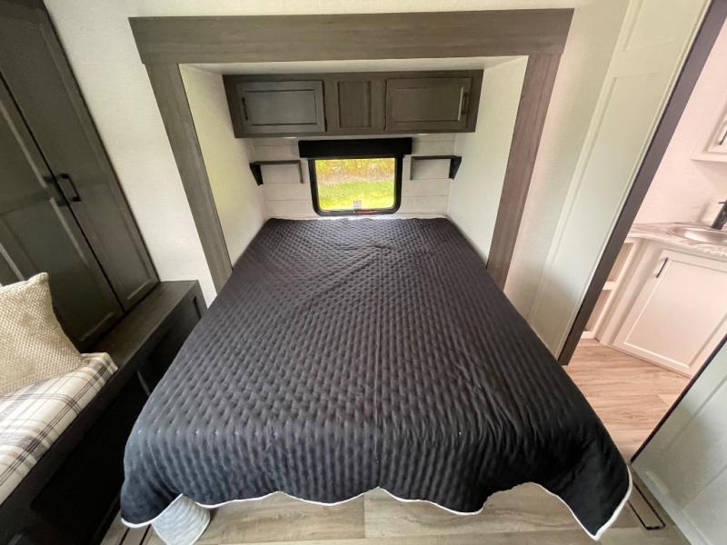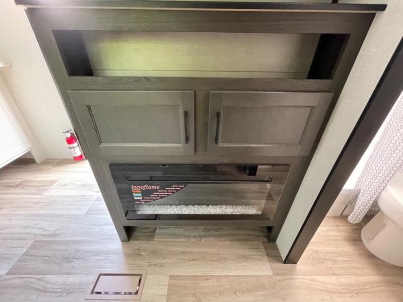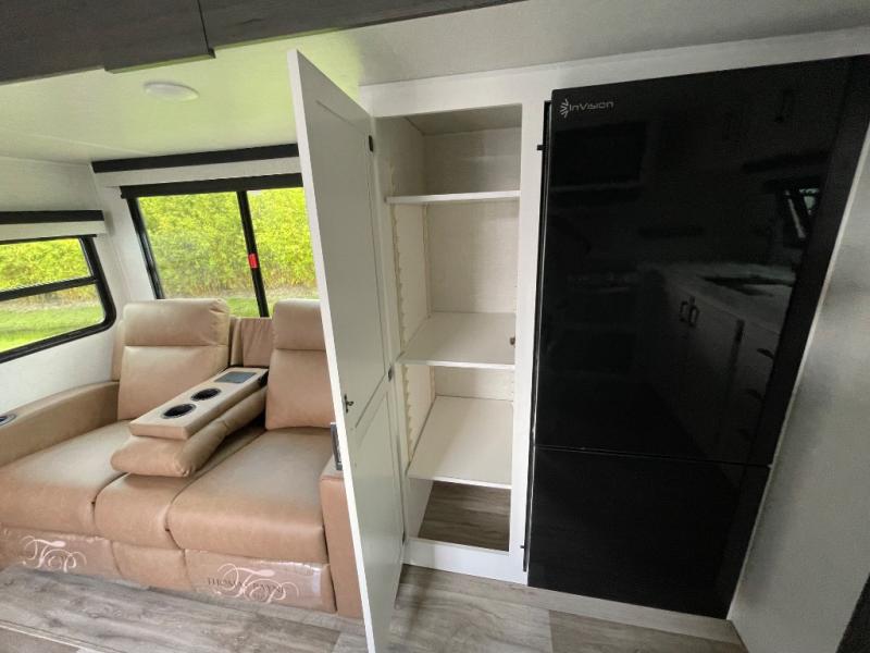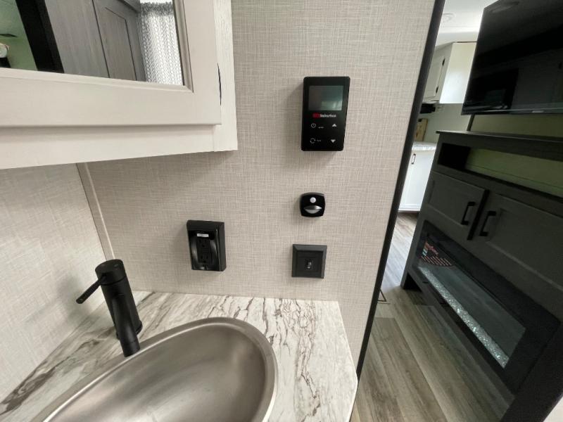 This travel trailer is special for two. Sleep tight in the bedroom on the 60" x 80" queen bed also, store your belongings inside the dresser, and closet, this last one has a bench with sit for added comfort plus, delight yourself with the astonishing panoramic view window. Cook delicious dinner in the incredible spacious front kitchen. It includes stainless steel sink with cover and dish drying racks, three cooktop burner, refrigerator, pantry, bar with stools and an over head cabinet. In addition, experience a fun moment in the living room thanks to the 40" TV, theater sitting with USB ports on each side of it and fireplace for full coziness. Finally, take a relaxing bath in the walk thru bathroom furnished with a 30" x 36" shower.