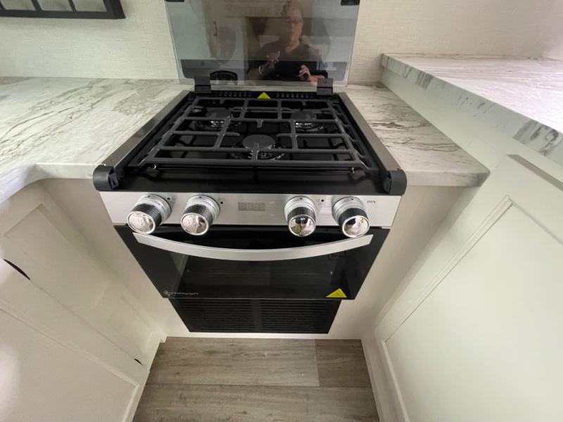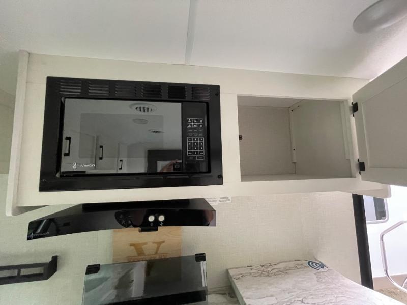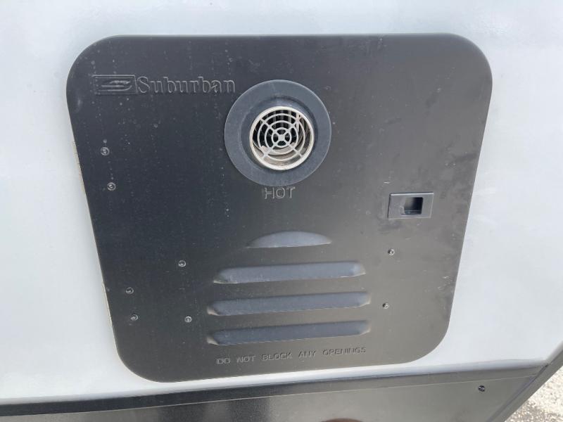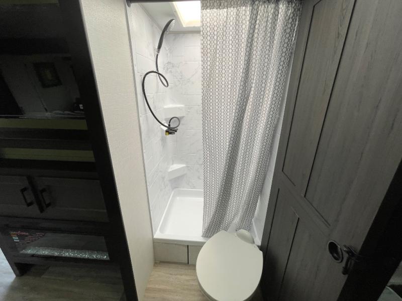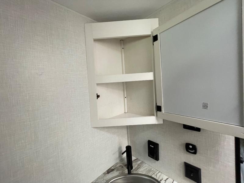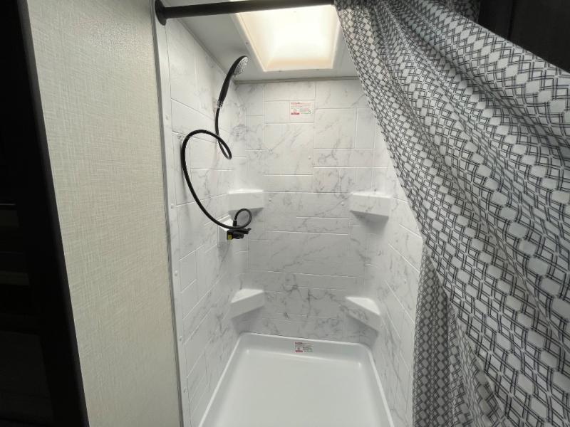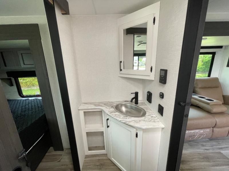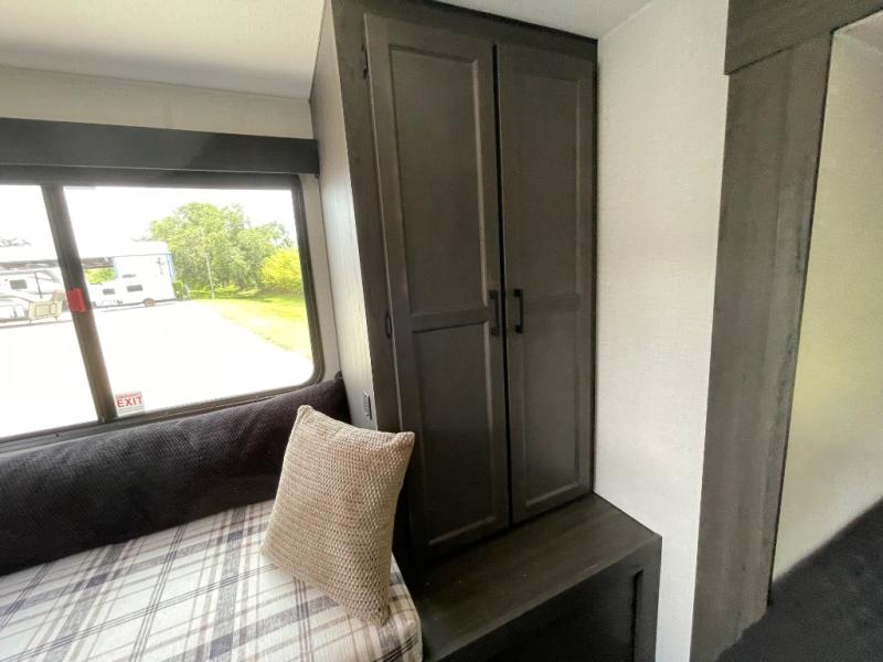 This travel trailer is special for two. Sleep tight in the bedroom on the 60" x 80" queen bed also, store your belongings inside the dresser, and closet, this last one has a bench with sit for added comfort plus, delight yourself with the astonishing panoramic view window. Cook delicious dinner in the incredible spacious front kitchen. It includes stainless steel sink with cover and dish drying racks, three cooktop burner, refrigerator, pantry, bar with stools and an over head cabinet. In addition, experience a fun moment in the living room thanks to the 40" TV, theater sitting with USB ports on each side of it and fireplace for full coziness. Finally, take a relaxing bath in the walk thru bathroom furnished with a 30" x 36" shower.