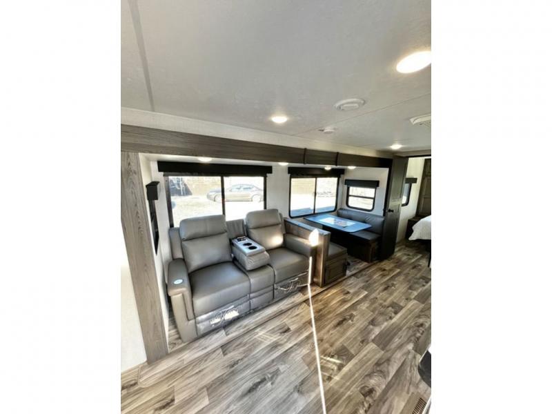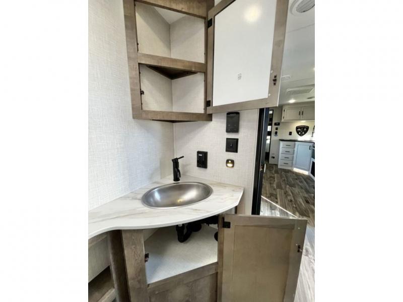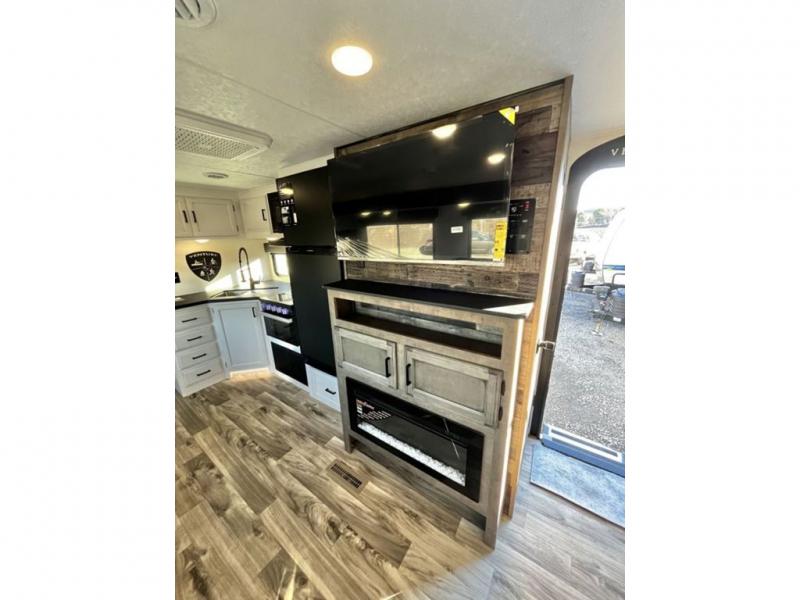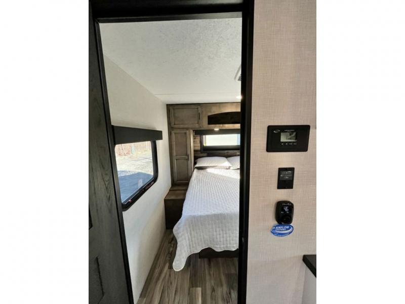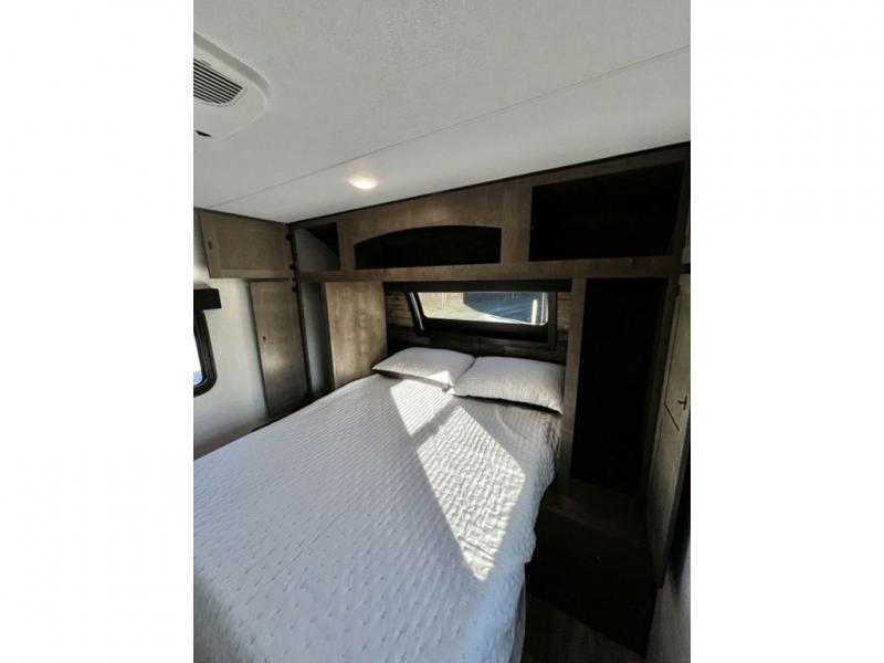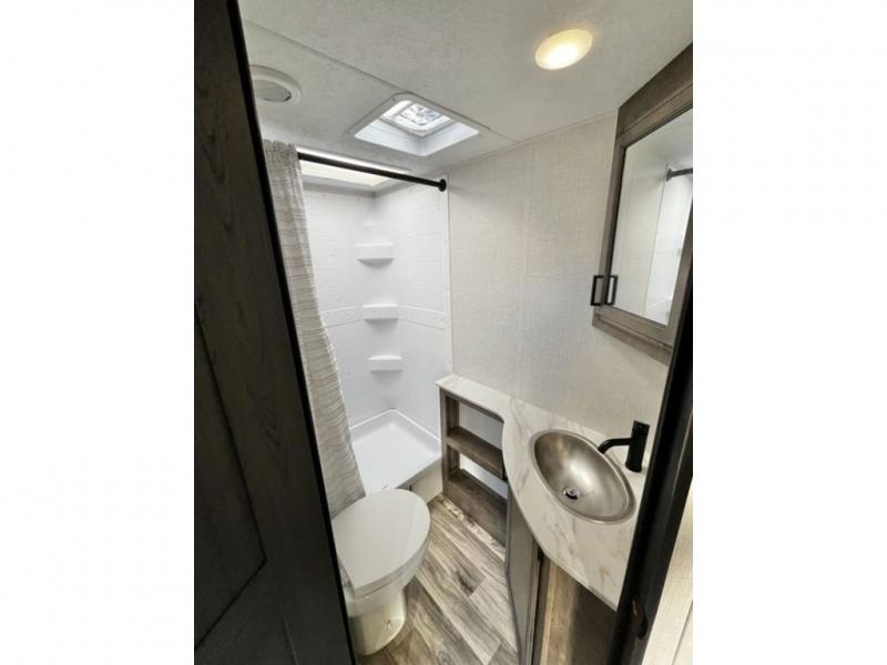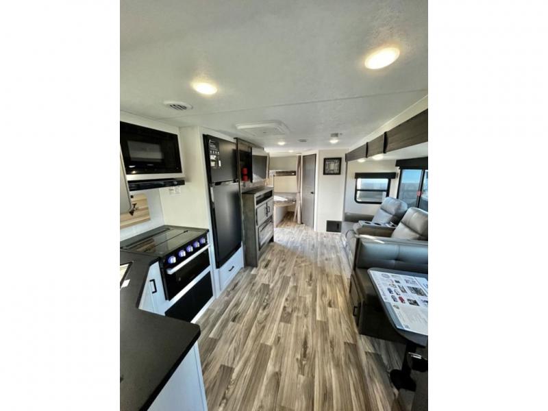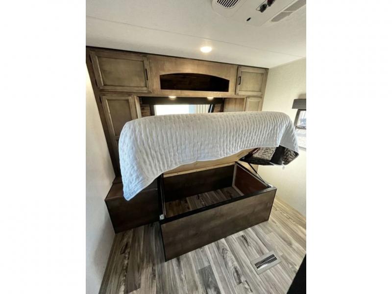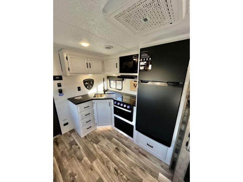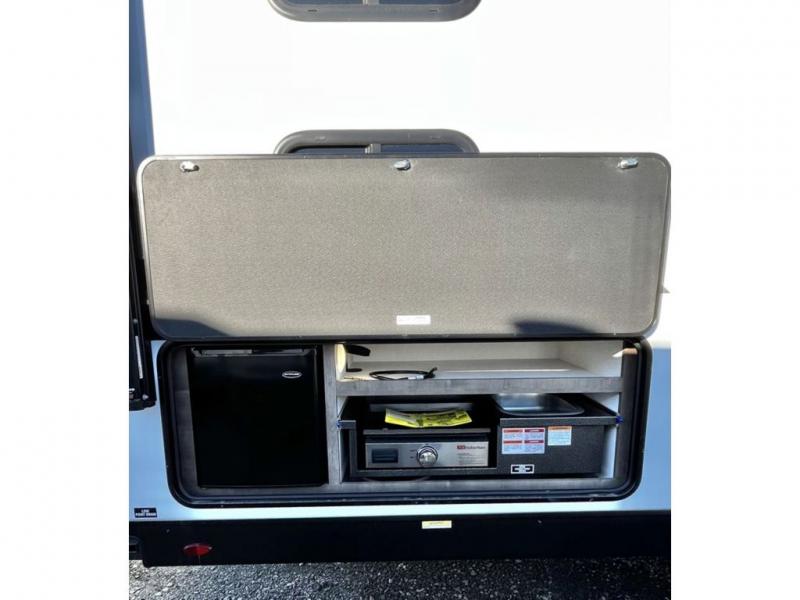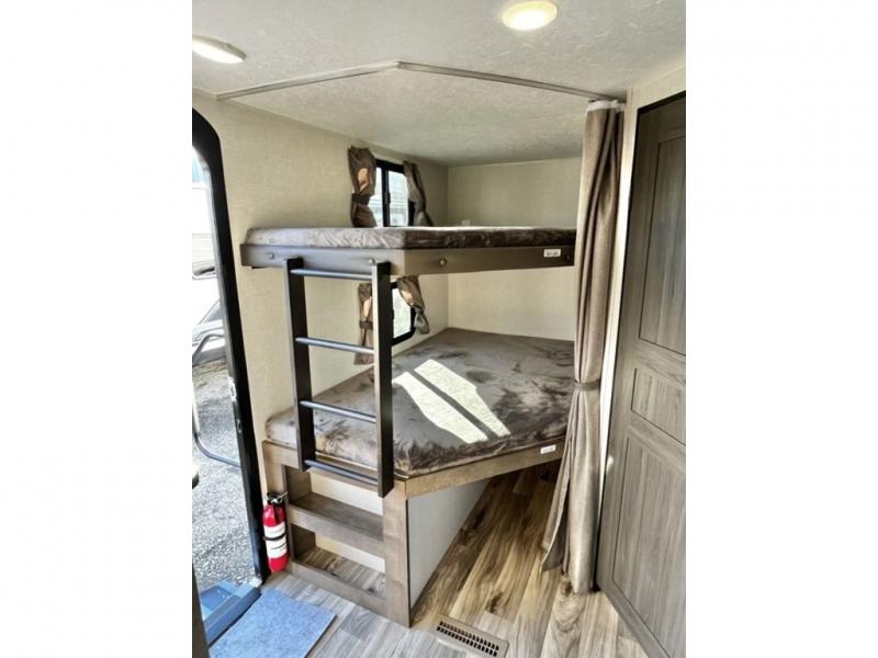The whole family will have a fun time camping in this travel trailer! You will appreciate having your own space with the front private bedroom that has a sleep tight queen bed to lay your head on at night, and wardrobes on either side to hang your clothes. The kids can sleep on the set of 51" x 75" double bed bunks and can even invite a friend or two to tag along and sleep on either the 70" sofa or the 42" booth dinette once they are converted. Everyone can freshen up in the rear corner bathroom featuring a 30" x 36" shower. Behind the entertainment center is a walk-in pantry with coat hooks so you can store your jacket and groceries. The chef will enjoy cooking at the outside campfire café on the griddle, plus there is a refrigerator, and a sink for cleaning up!