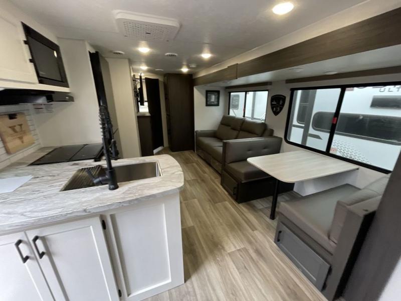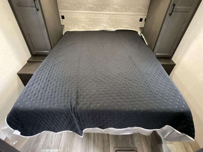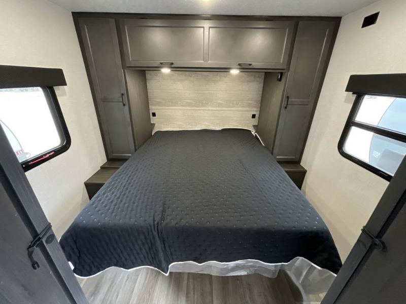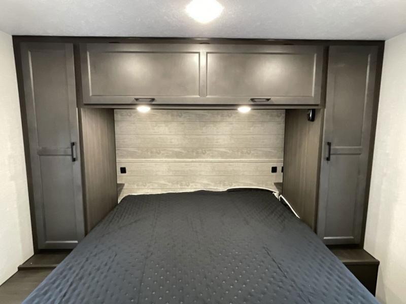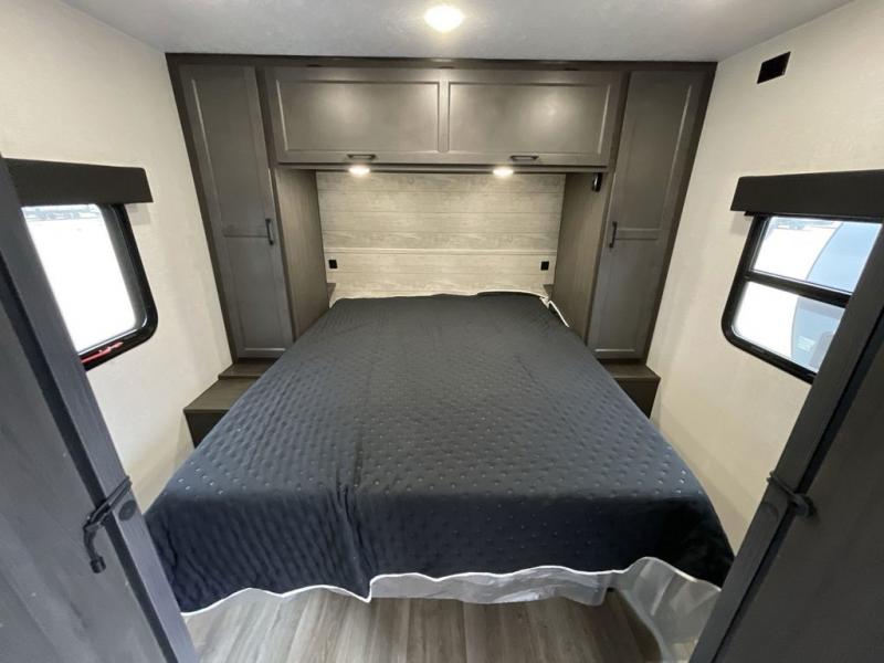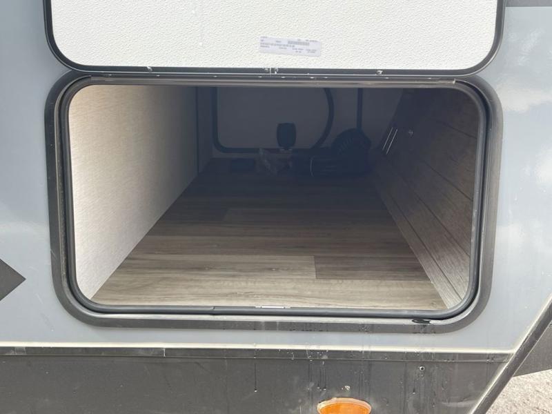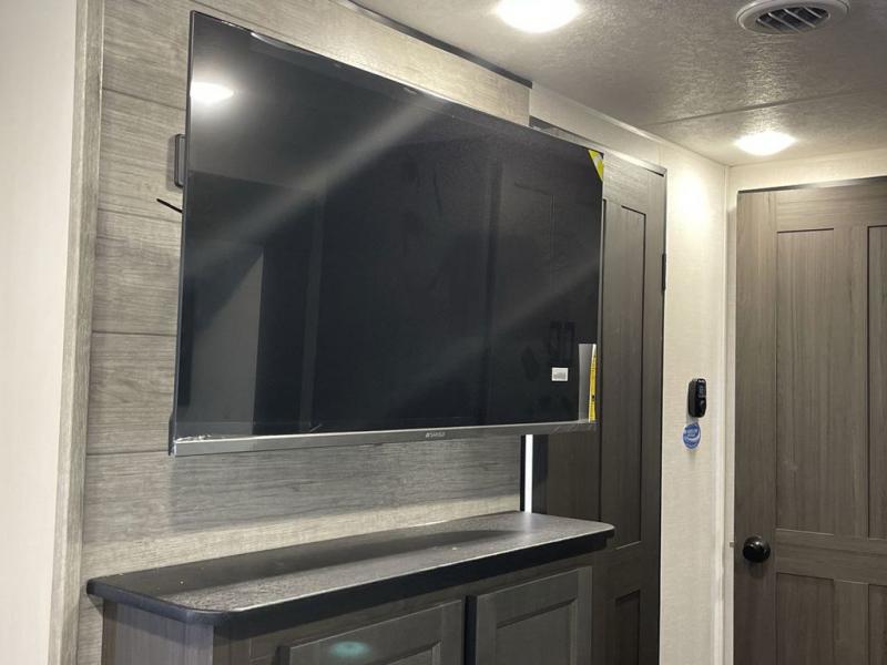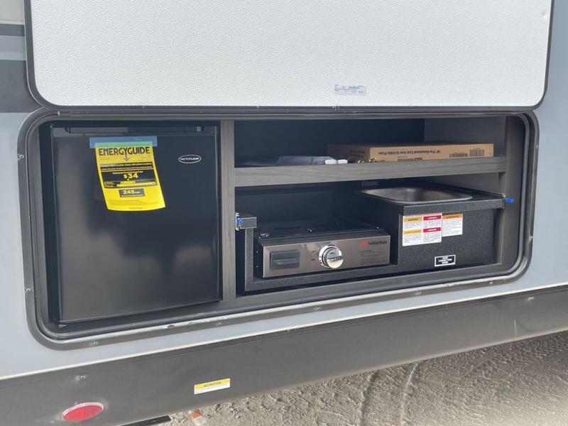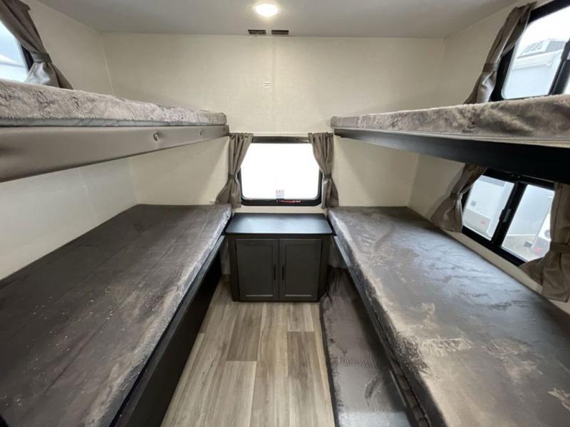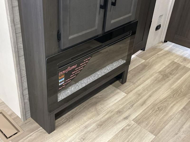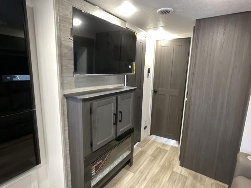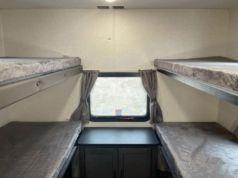 You, your kids and/or friends, and your pets can all have a relaxing camping trip in this travel trailer! The unique rear private bunkhouse has a set of 32" x 70" bunk beds, and a set of 28" x 70" bunks where the top bunk flips up, and its ability to convert into a desk, king bed, storage, or a pet palace. Just outside the bunkhouse is a full bathroom with a 30" x 36" shower to freshen up in each morning. Everyone can gather together at the 70" sofa and 42" booth dinette while watching a movie and enjoying the fireplace at the entertainment center. The front private bedroom has sliding doors to shut when you're ready to sleep on the sleep tight queen bed. Prepare your meals either indoors with the three burner cooktop or at the outside campfire café with the griddle, refrigerator, and sink!