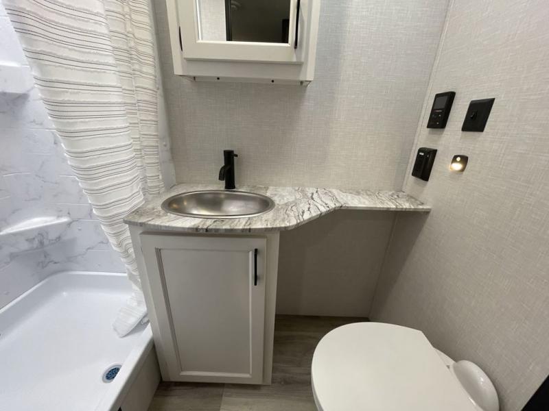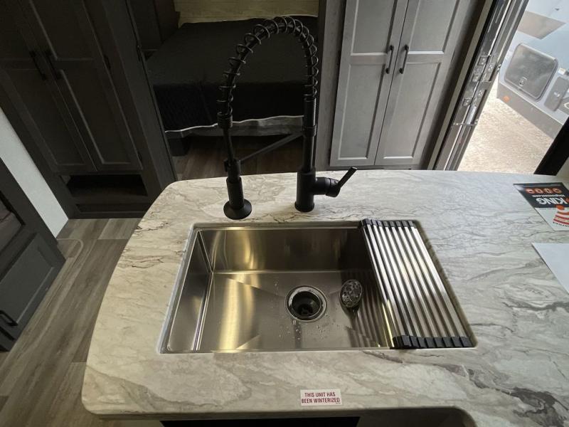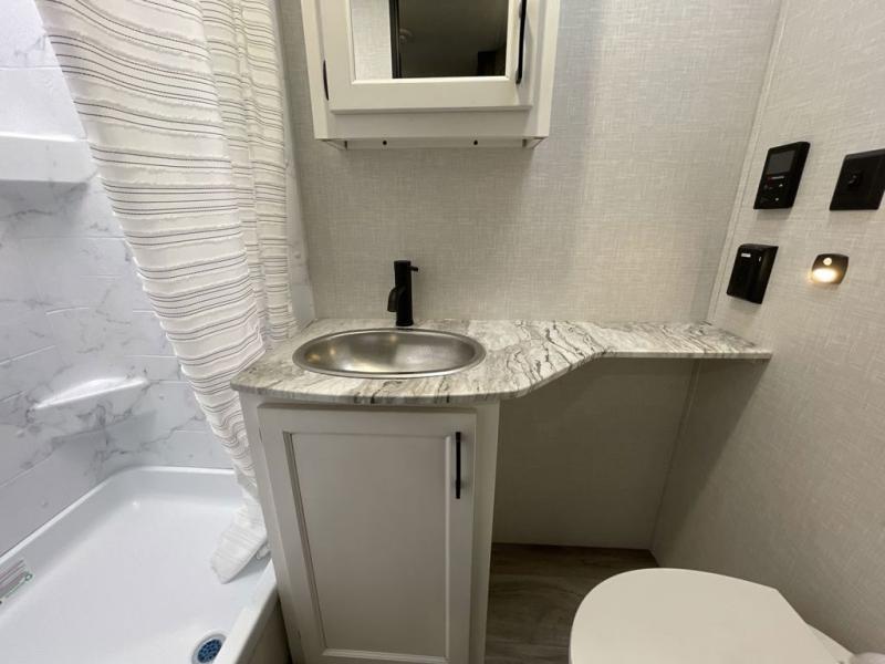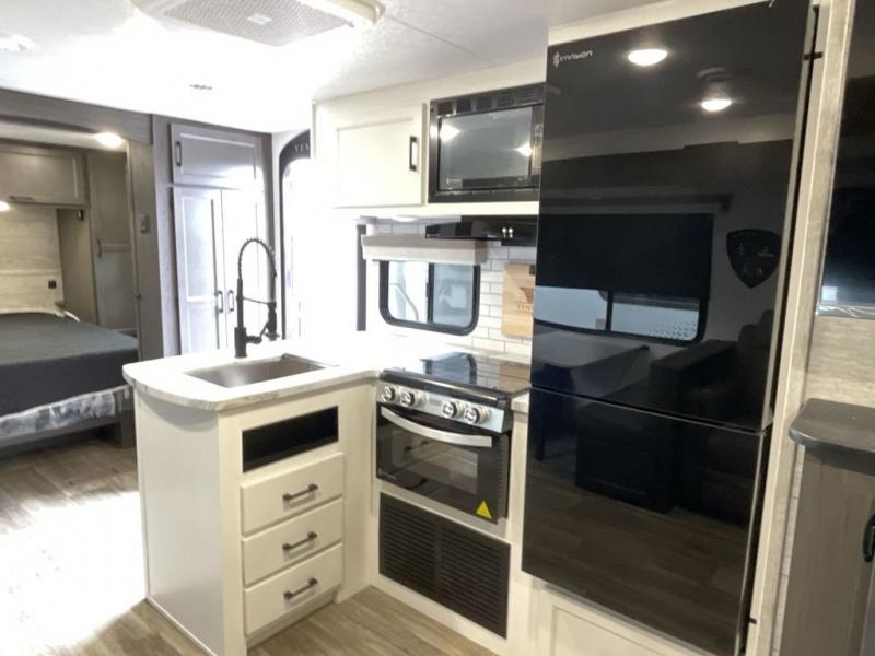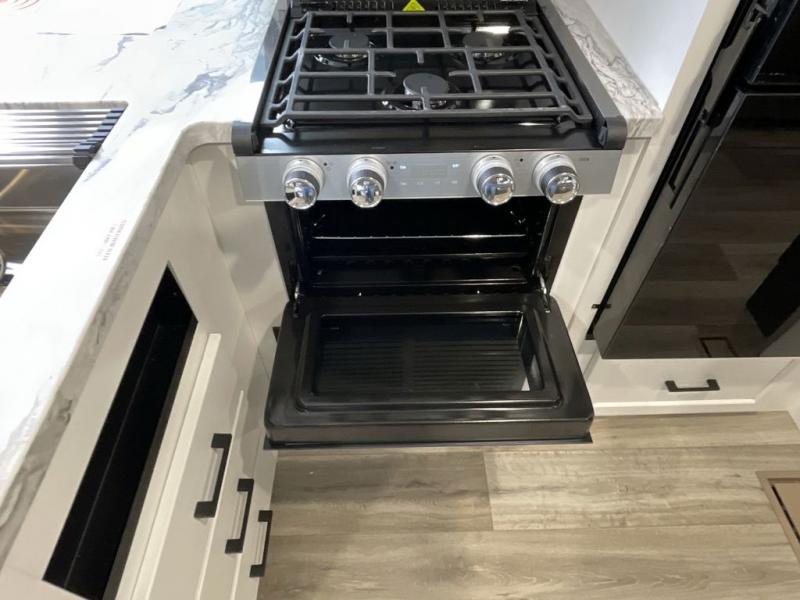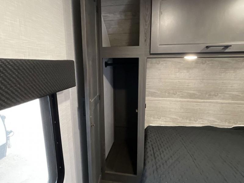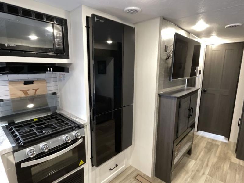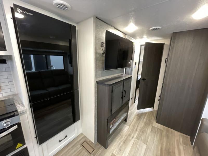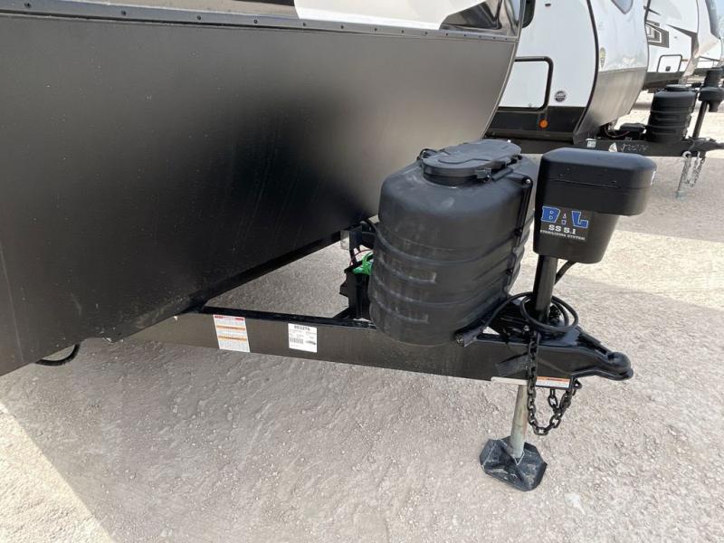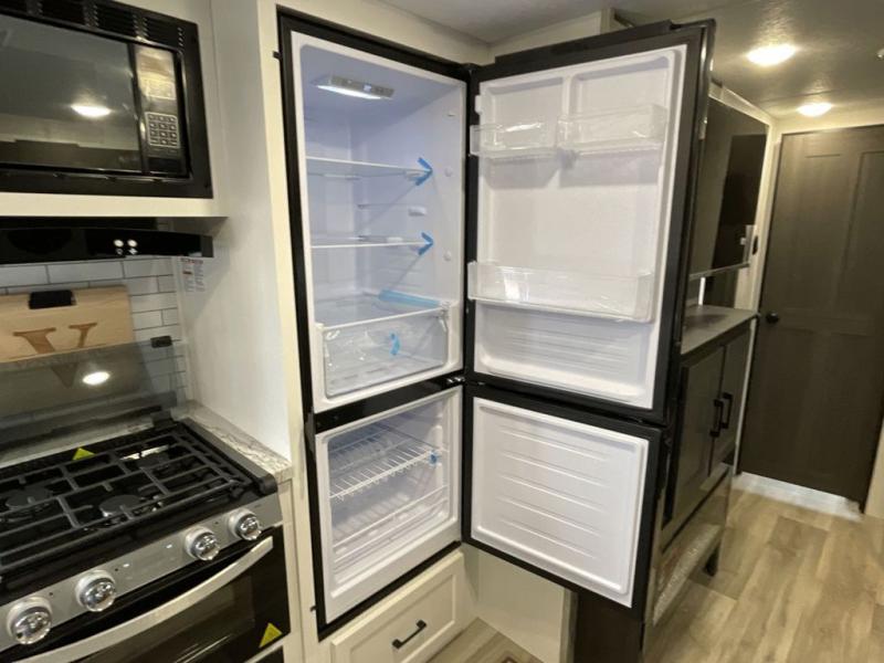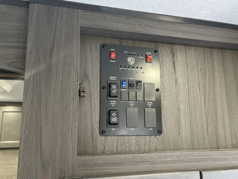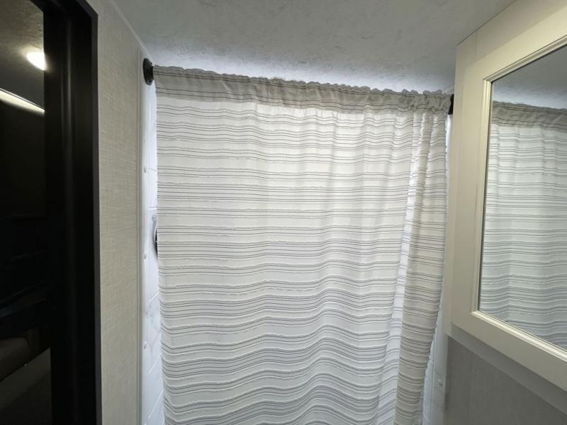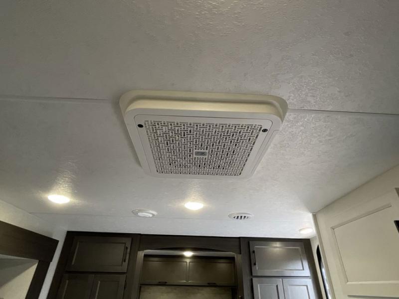 You, your kids and/or friends, and your pets can all have a relaxing camping trip in this travel trailer! The unique rear private bunkhouse has a set of 32" x 70" bunk beds, and a set of 28" x 70" bunks where the top bunk flips up, and its ability to convert into a desk, king bed, storage, or a pet palace. Just outside the bunkhouse is a full bathroom with a 30" x 36" shower to freshen up in each morning. Everyone can gather together at the 70" sofa and 42" booth dinette while watching a movie and enjoying the fireplace at the entertainment center. The front private bedroom has sliding doors to shut when you're ready to sleep on the sleep tight queen bed. Prepare your meals either indoors with the three burner cooktop or at the outside campfire café with the griddle, refrigerator, and sink!