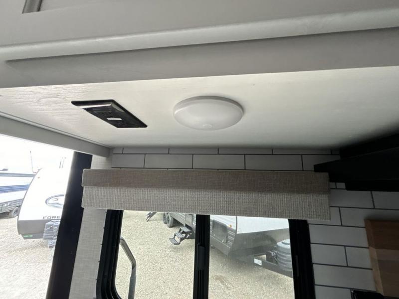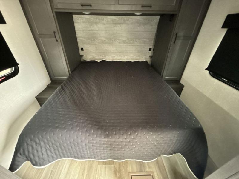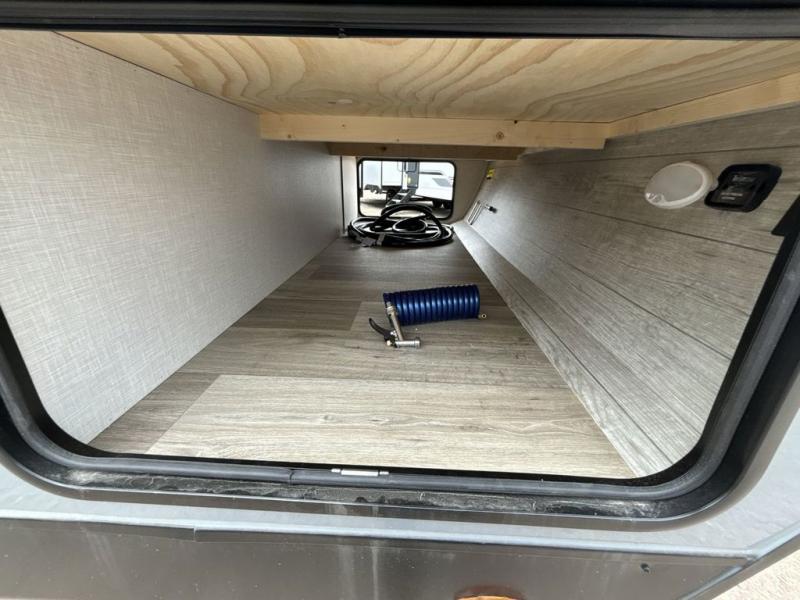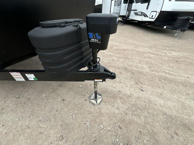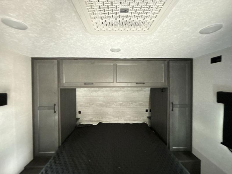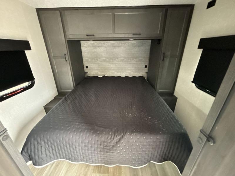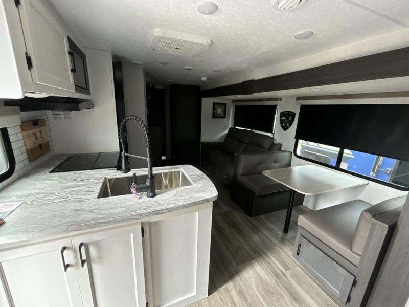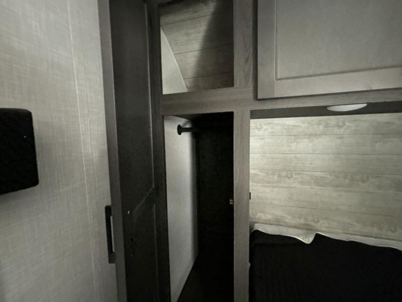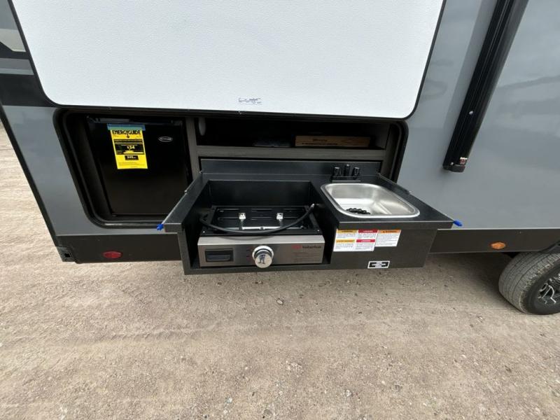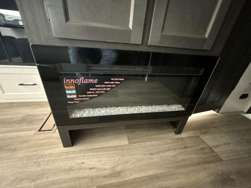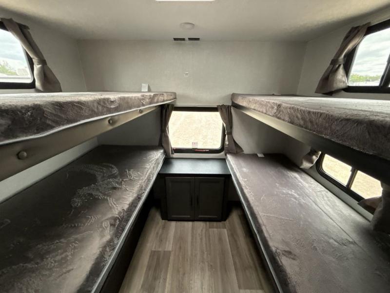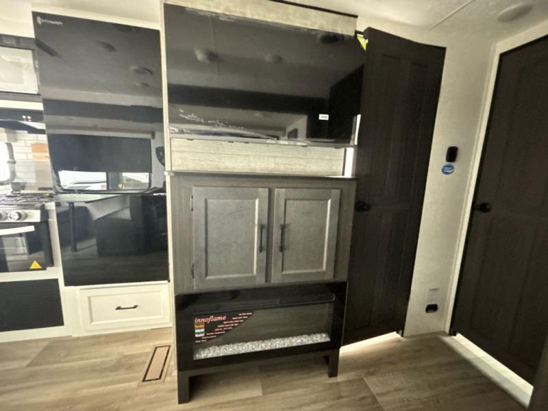 You, your kids and/or friends, and your pets can all have a relaxing camping trip in this travel trailer! The unique rear private bunkhouse has a set of 32" x 70" bunk beds, and a set of 28" x 70" bunks where the top bunk flips up, and its ability to convert into a desk, king bed, storage, or a pet palace. Just outside the bunkhouse is a full bathroom with a 30" x 36" shower to freshen up in each morning. Everyone can gather together at the 70" sofa and 42" booth dinette while watching a movie and enjoying the fireplace at the entertainment center. The front private bedroom has sliding doors to shut when you're ready to sleep on the sleep tight queen bed. Prepare your meals either indoors with the three burner cooktop or at the outside campfire café with the griddle, refrigerator, and sink!