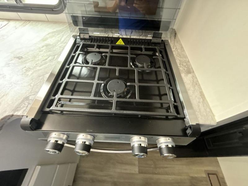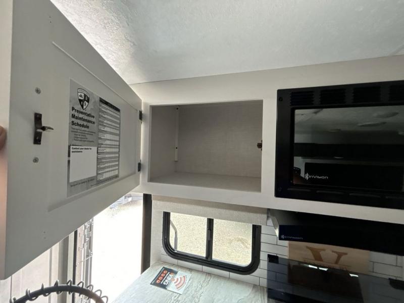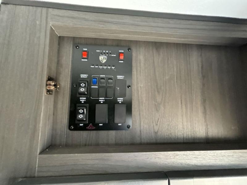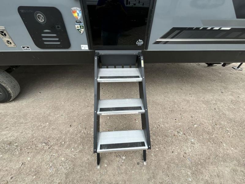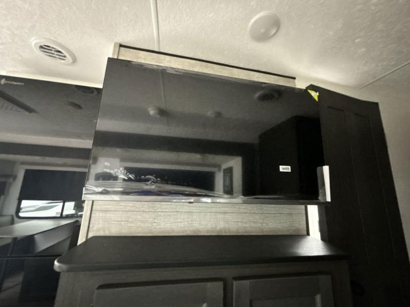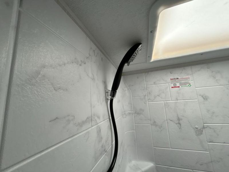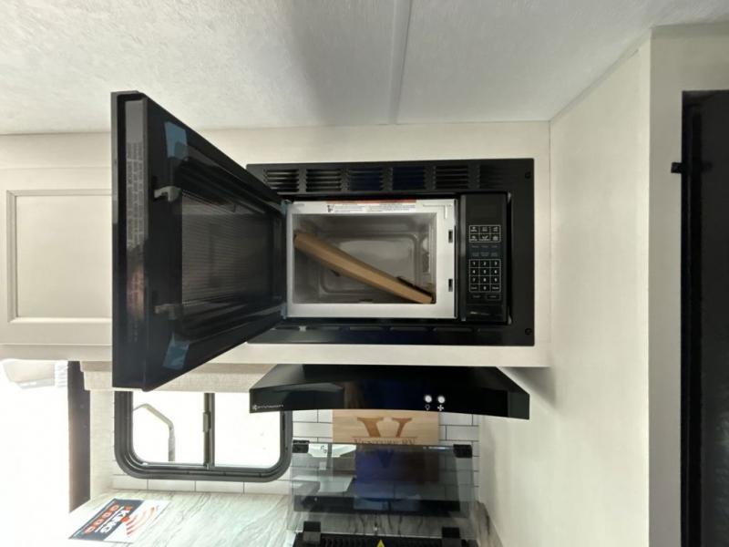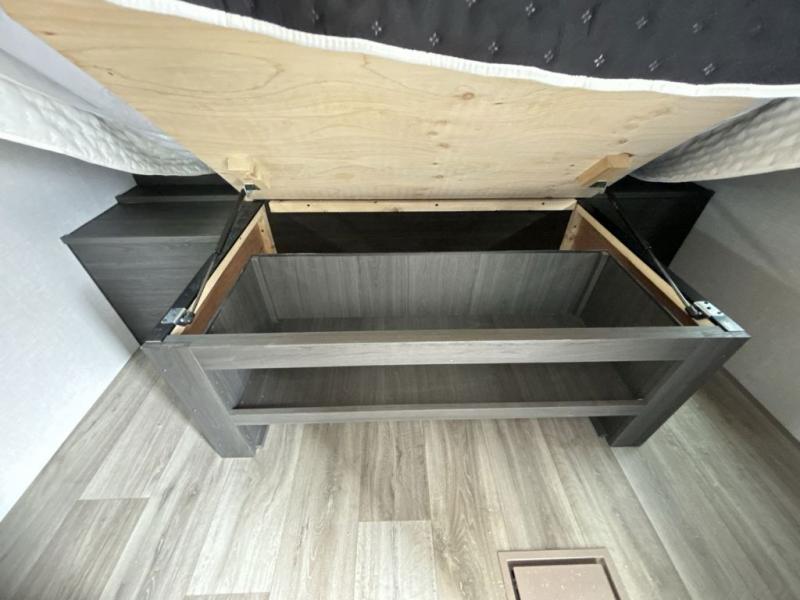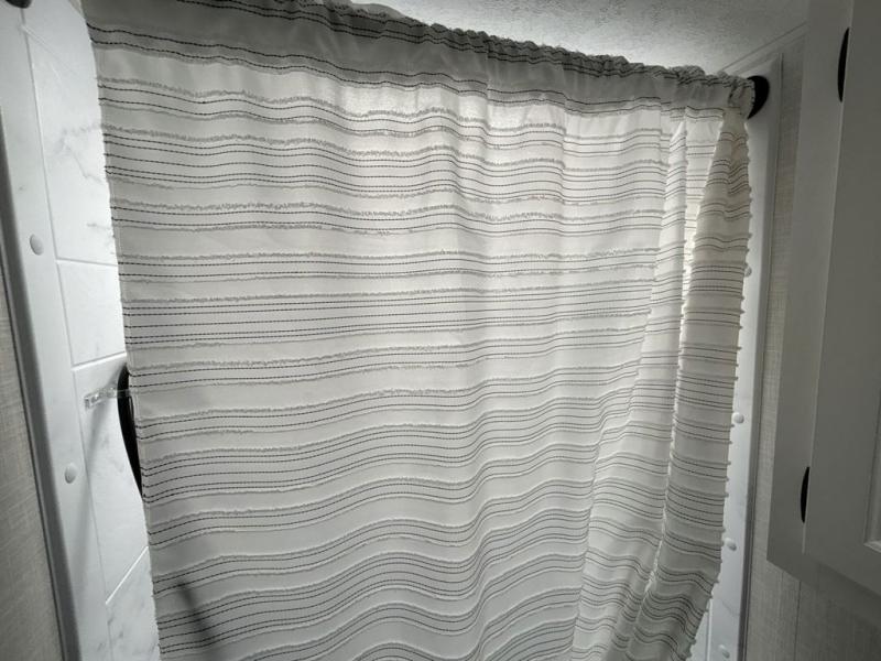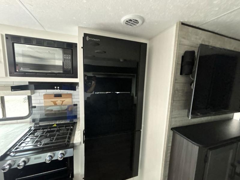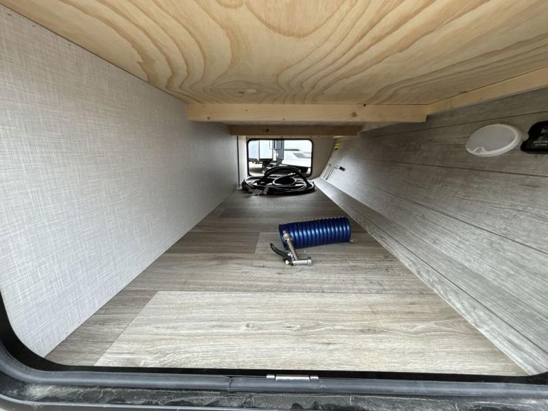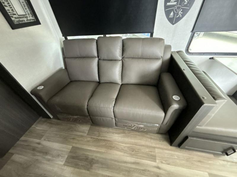 You, your kids and/or friends, and your pets can all have a relaxing camping trip in this travel trailer! The unique rear private bunkhouse has a set of 32" x 70" bunk beds, and a set of 28" x 70" bunks where the top bunk flips up, and its ability to convert into a desk, king bed, storage, or a pet palace. Just outside the bunkhouse is a full bathroom with a 30" x 36" shower to freshen up in each morning. Everyone can gather together at the 70" sofa and 42" booth dinette while watching a movie and enjoying the fireplace at the entertainment center. The front private bedroom has sliding doors to shut when you're ready to sleep on the sleep tight queen bed. Prepare your meals either indoors with the three burner cooktop or at the outside campfire café with the griddle, refrigerator, and sink!