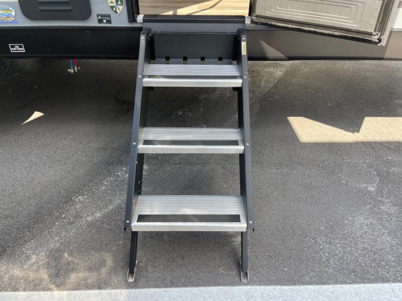 You, your kids and/or friends, and your pets can all have a relaxing camping trip in this travel trailer! The unique rear private bunkhouse has a set of 32" x 70" bunk beds, and a set of 28" x 70" bunks where the top bunk flips up, and its ability to convert into a desk, king bed, storage, or a pet palace. Just outside the bunkhouse is a full bathroom with a 30" x 36" shower to freshen up in each morning. Everyone can gather together at the 70" sofa and 42" booth dinette while watching a movie and enjoying the fireplace at the entertainment center. The front private bedroom has sliding doors to shut when you're ready to sleep on the sleep tight queen bed. Prepare your meals either indoors with the three burner cooktop or at the outside campfire café with the griddle, refrigerator, and sink!