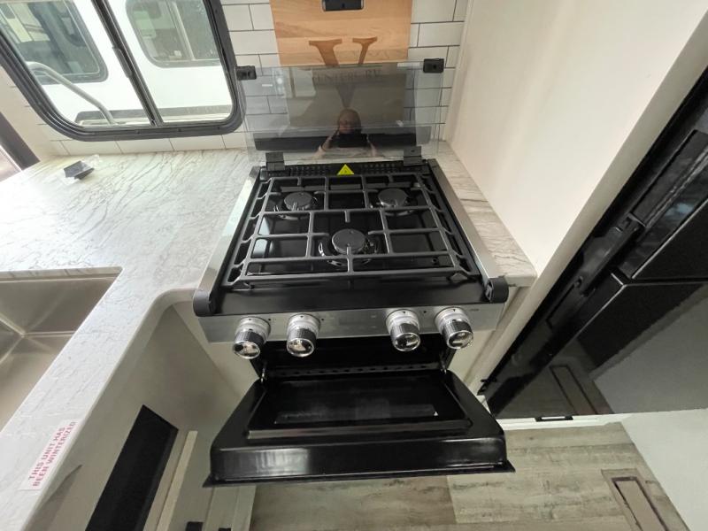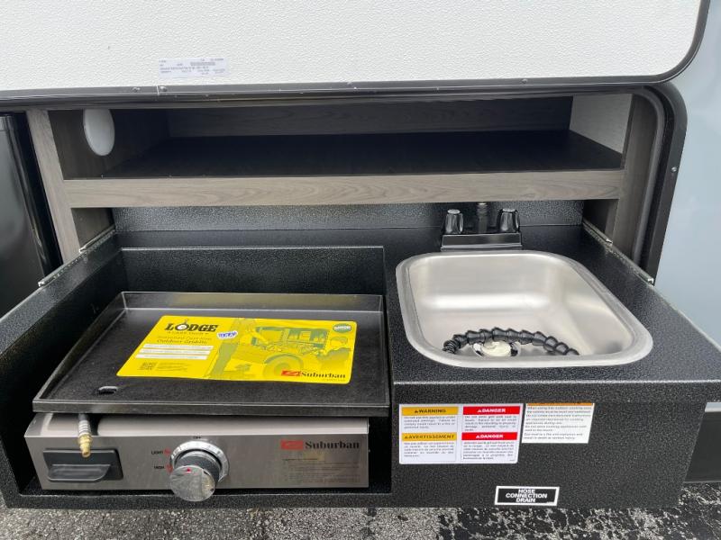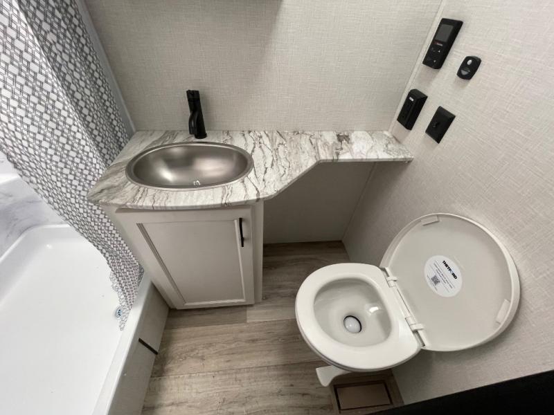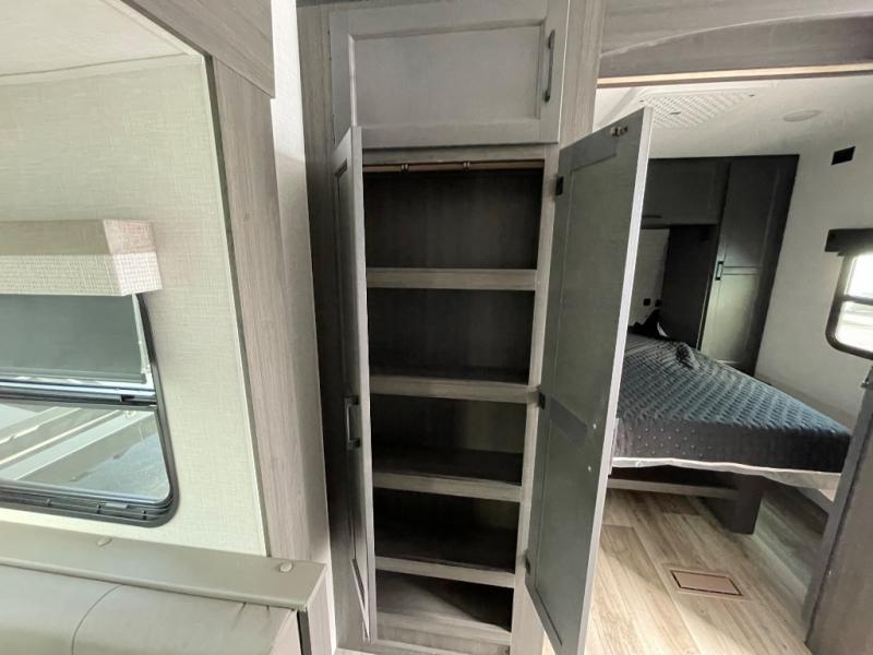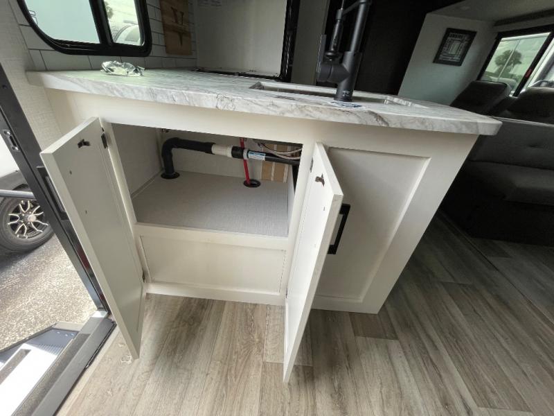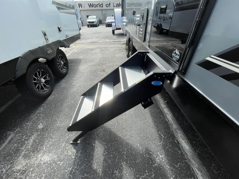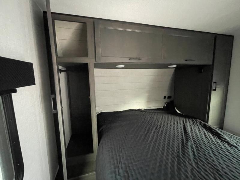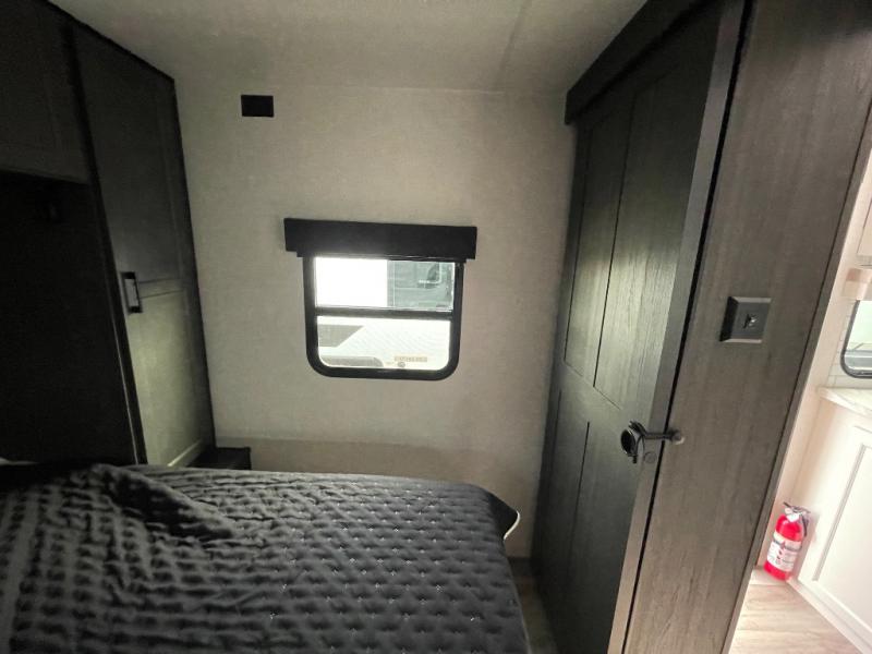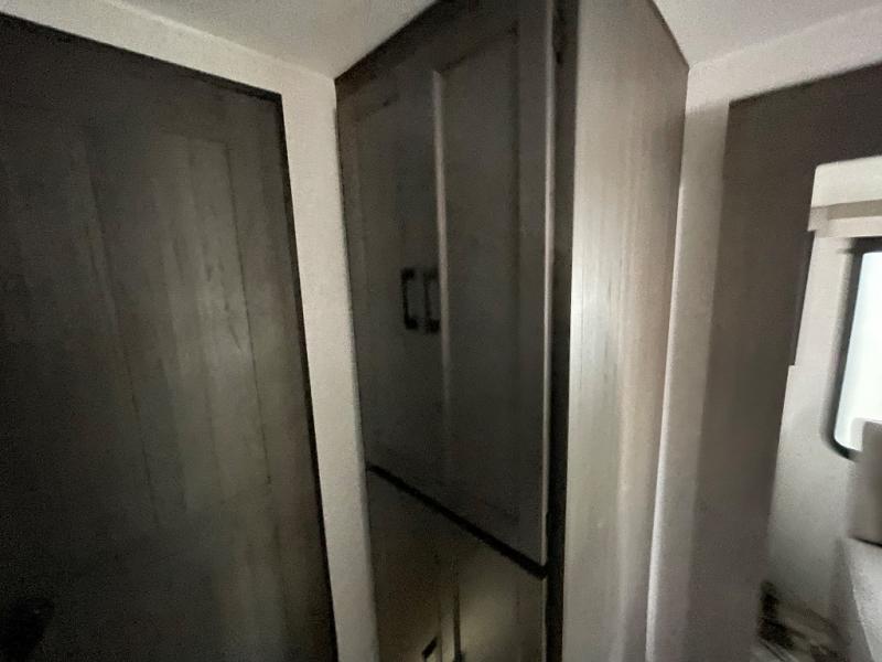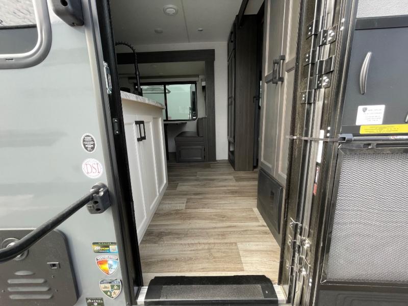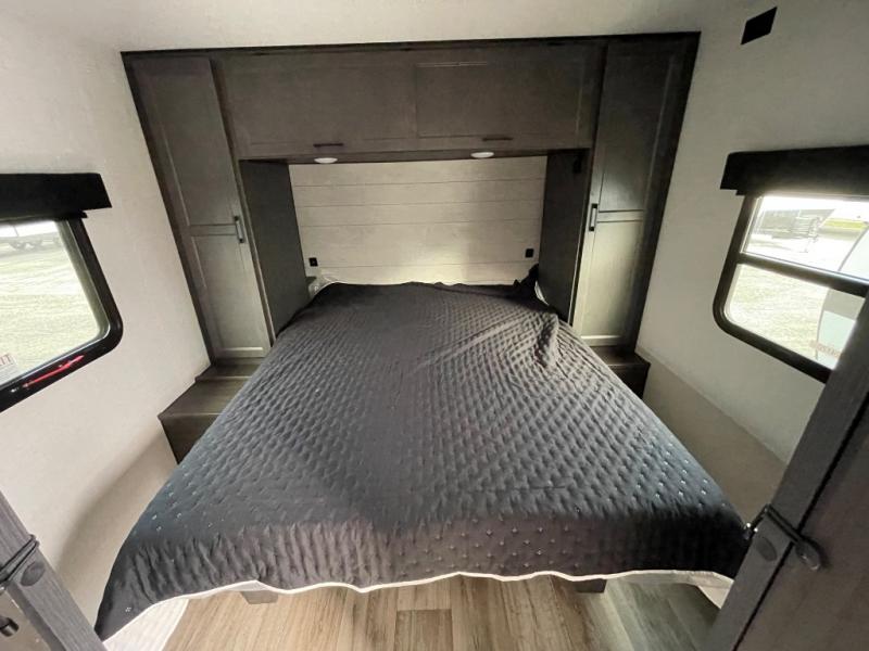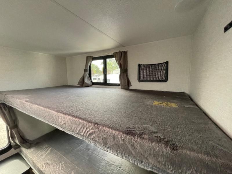 You, your kids and/or friends, and your pets can all have a relaxing camping trip in this travel trailer! The unique rear private bunkhouse has a set of 32" x 70" bunk beds, and a set of 28" x 70" bunks where the top bunk flips up, and its ability to convert into a desk, king bed, storage, or a pet palace. Just outside the bunkhouse is a full bathroom with a 30" x 36" shower to freshen up in each morning. Everyone can gather together at the 70" sofa and 42" booth dinette while watching a movie and enjoying the fireplace at the entertainment center. The front private bedroom has sliding doors to shut when you're ready to sleep on the sleep tight queen bed. Prepare your meals either indoors with the three burner cooktop or at the outside campfire café with the griddle, refrigerator, and sink!