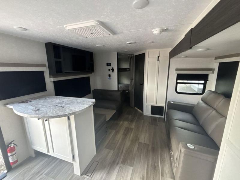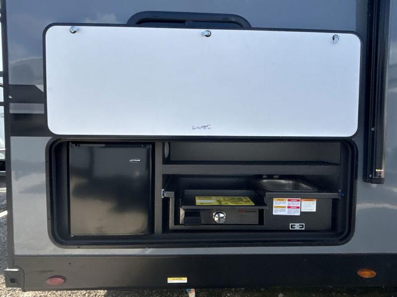 Sleep tight with your family on the road! This travel trailer is special for the whole family since it has plenty of space for sleep. First we have the 60" x 80" queen bed, the 51" x 75" double size bunk bed, you can also two people on the sit n' slide dinette and one more on the 70" sofa. Cook delicious dinner in the incredible kitchen. It includes stainless steel sink with cover and dish drying racks, three cooktop burner, 10 cu. refrigerator, pantry and an over head cabinet. However you can also have an amazing cooking time outside thanks to the outdoor kitchen, ideal ideal to share a meal with your family while enjoying nature and its surroundings. Store your belongings in the large closet beside the bed and also in the pass thru storage. Finally, take a relaxing bath in the full bathroom furnished with a 30" x 36" shower.