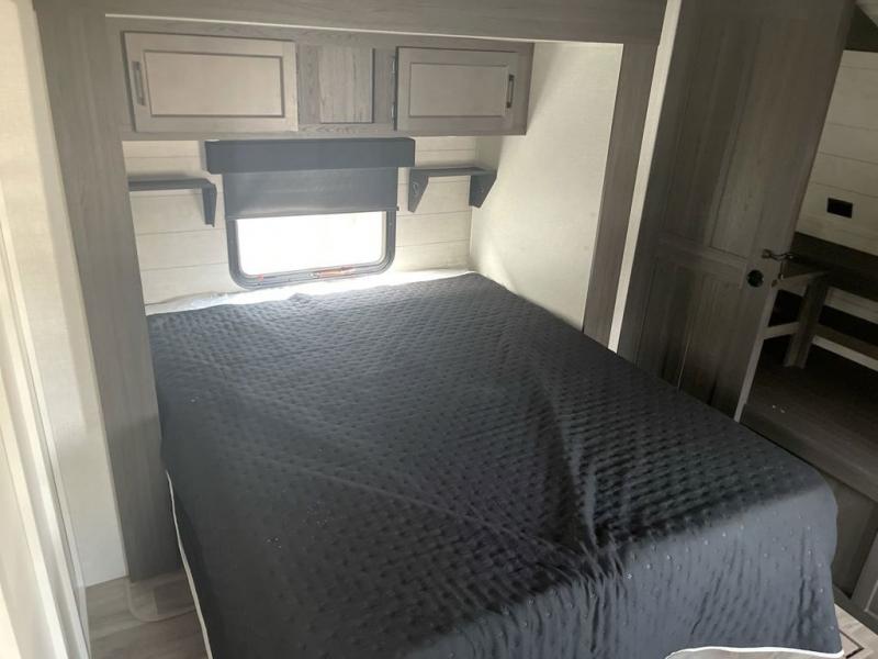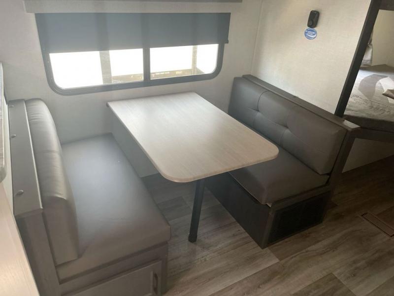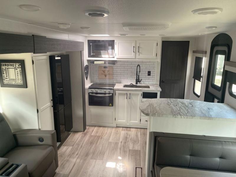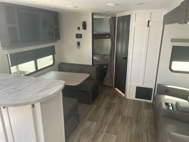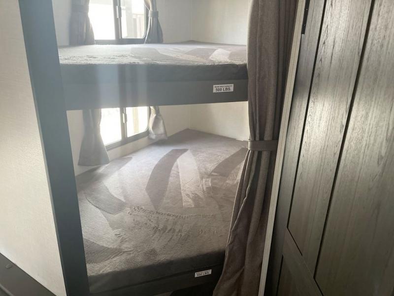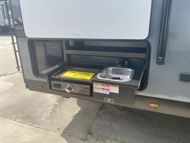 Sleep tight with your family on the road! This travel trailer is special for the whole family since it has plenty of space for sleep. First we have the 60" x 80" queen bed, the 51" x 75" double size bunk bed, you can also two people on the sit n' slide dinette and one more on the 70" sofa. Cook delicious dinner in the incredible kitchen. It includes stainless steel sink with cover and dish drying racks, three cooktop burner, 10 cu. refrigerator, pantry and an over head cabinet. However you can also have an amazing cooking time outside thanks to the outdoor kitchen, ideal ideal to share a meal with your family while enjoying nature and its surroundings. Store your belongings in the large closet beside the bed and also in the pass thru storage. Finally, take a relaxing bath in the full bathroom furnished with a 30" x 36" shower.