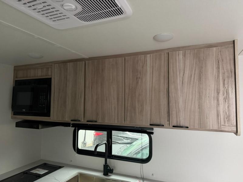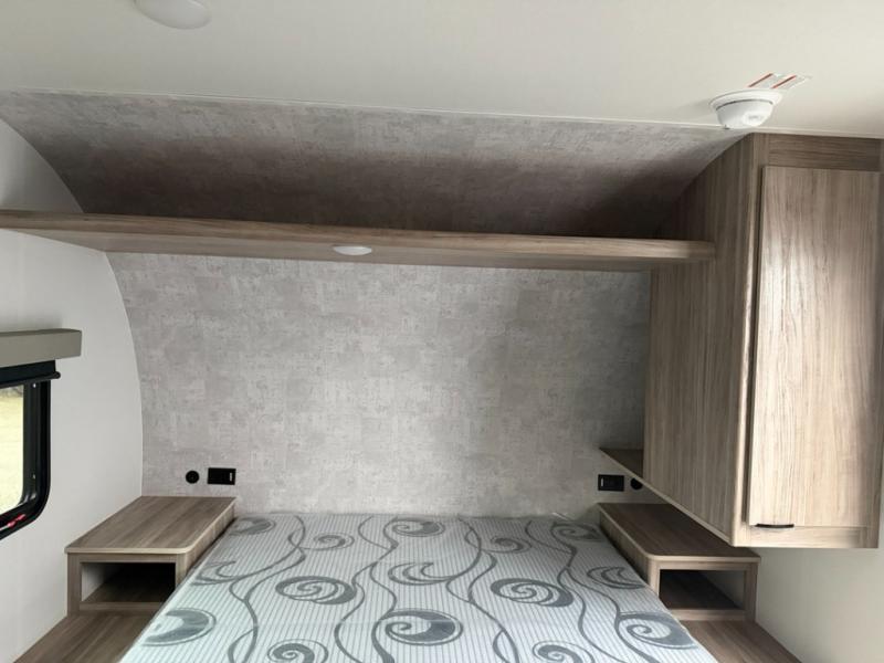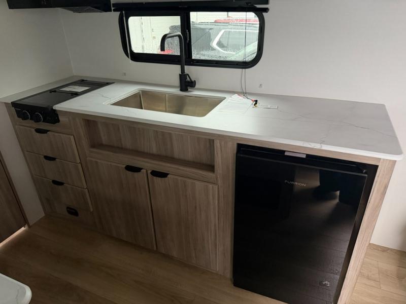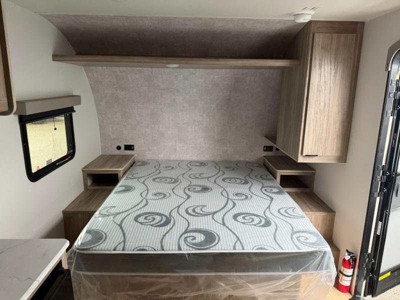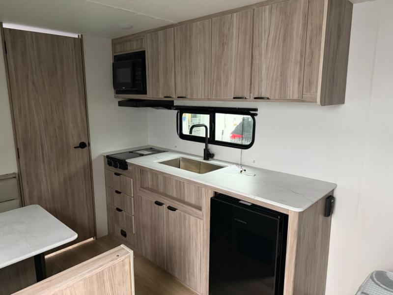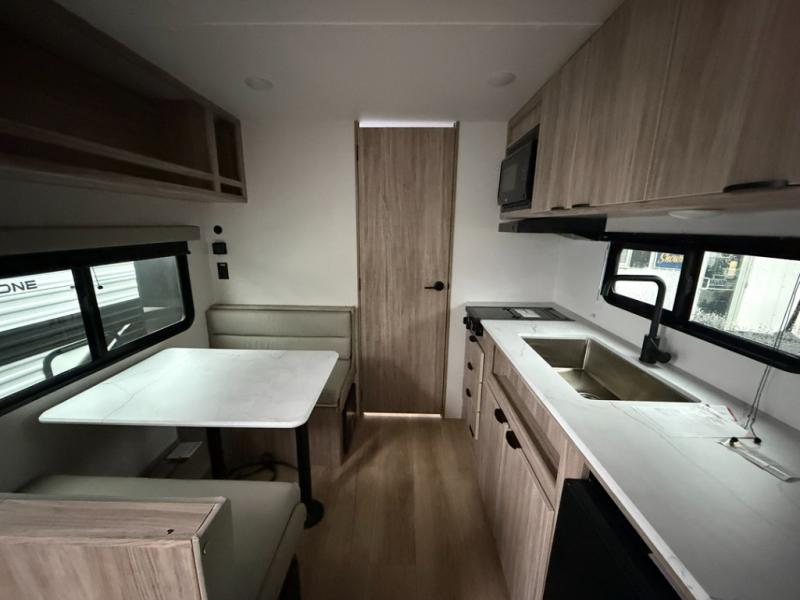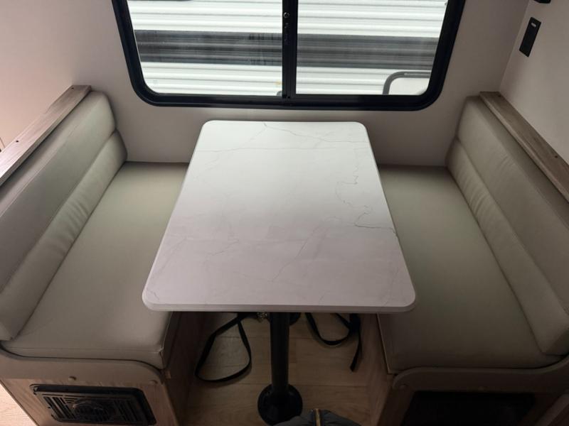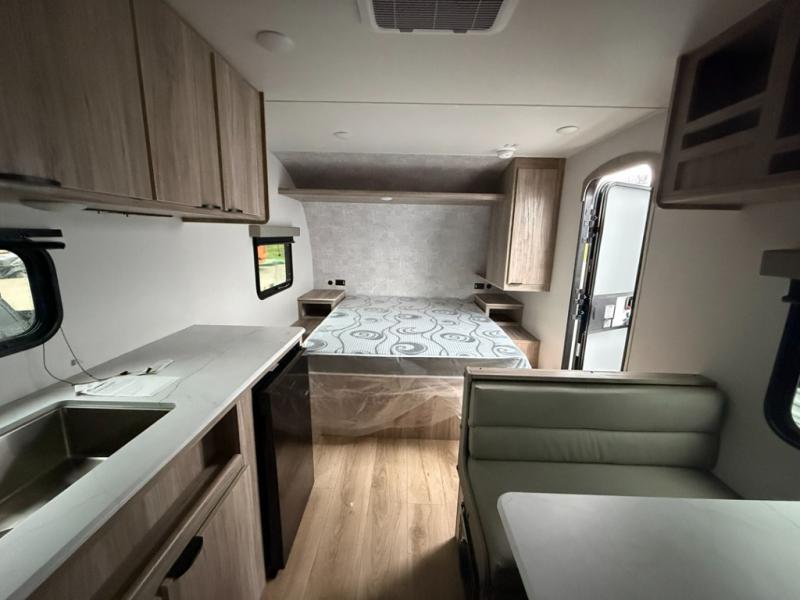 This is the perfect couple's trailer or for those who enjoy solo camping. Once you've unloaded the exterior baggage doors, you can put out the 12' power awning, then head inside to make lunch on the two burner cooktop. There is also a microwave oven and a 3.3 cu. ft. 12V refrigerator for perishables. A booth dinette will provide a place to enjoy your meal at, and an additional guest can sleep here if need be. After a day of exploring outdoors, you can freshen up in the full rear bath that includes a 30" x 36" shower with a skylight and a linen closet for clean towels!