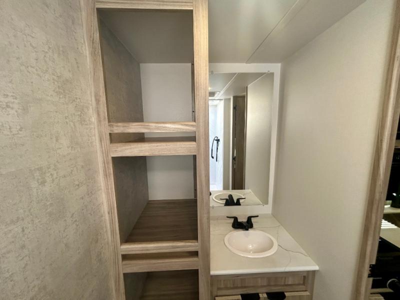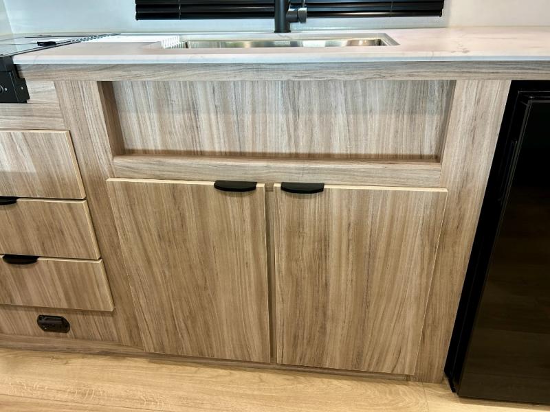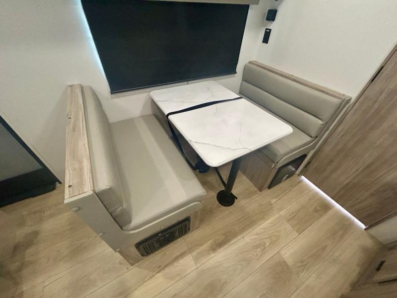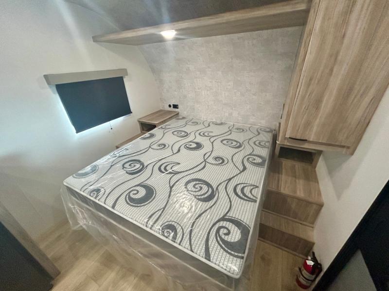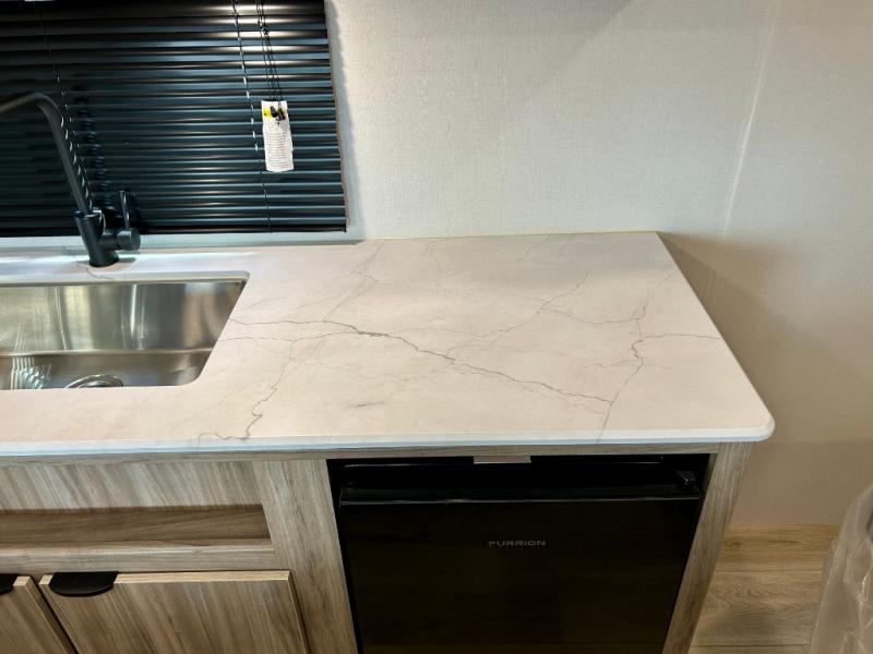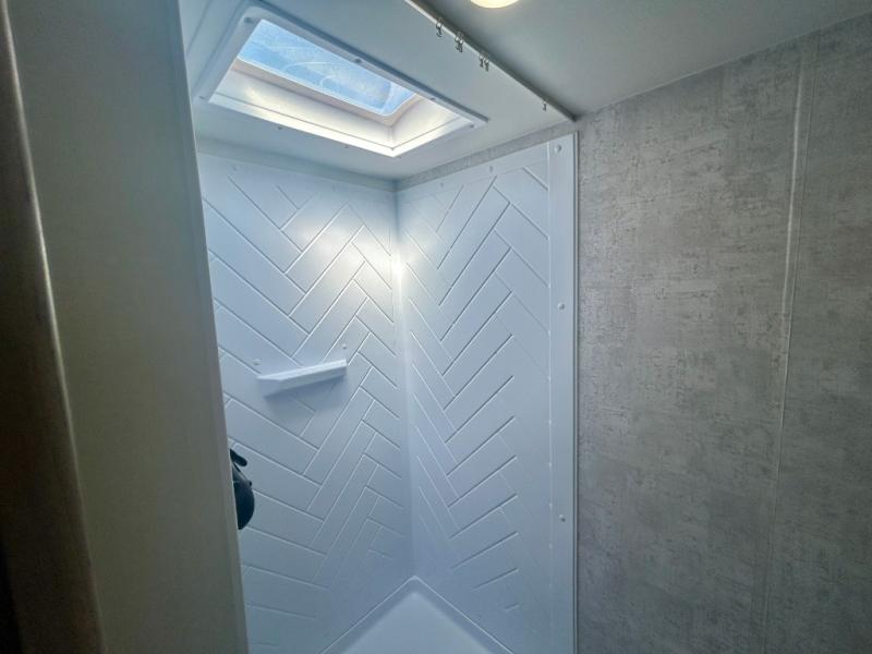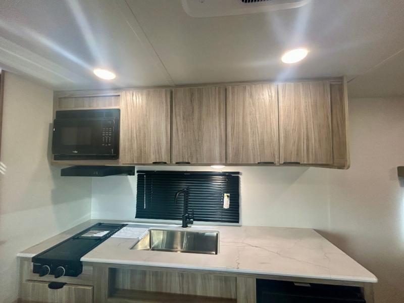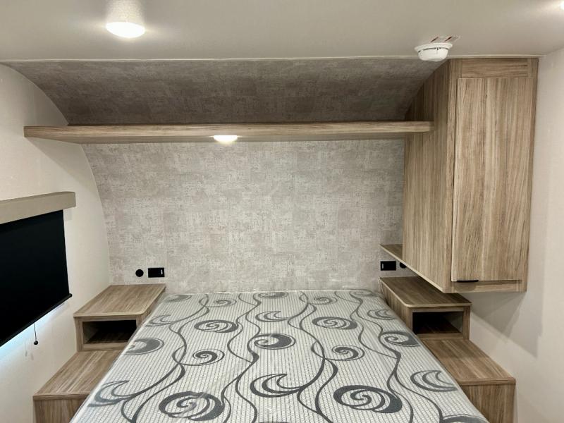 This is the perfect couple's trailer or for those who enjoy solo camping. Once you've unloaded the exterior baggage doors, you can put out the 12' power awning, then head inside to make lunch on the two burner cooktop. There is also a microwave oven and a 3.3 cu. ft. 12V refrigerator for perishables. A booth dinette will provide a place to enjoy your meal at, and an additional guest can sleep here if need be. After a day of exploring outdoors, you can freshen up in the full rear bath that includes a 30" x 36" shower with a skylight and a linen closet for clean towels!