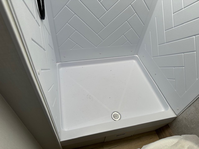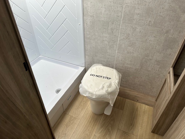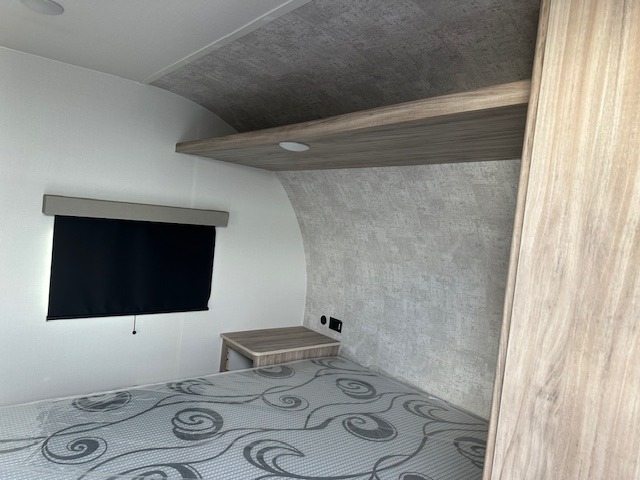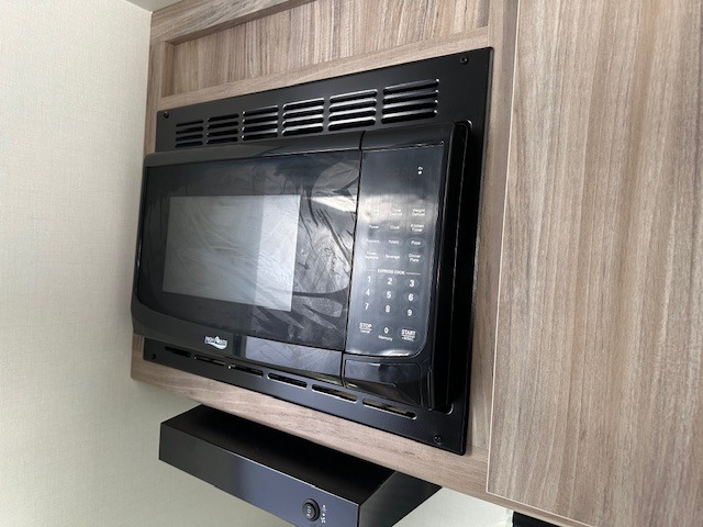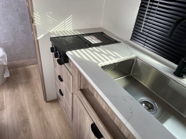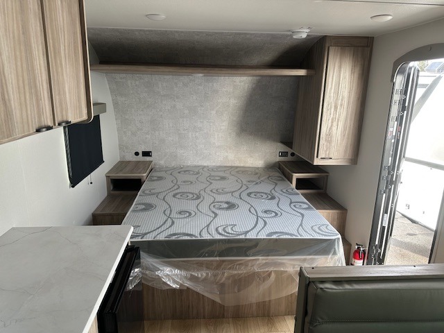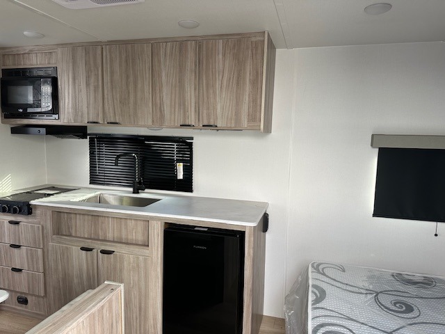 This is the perfect couple's trailer or for those who enjoy solo camping. Once you've unloaded the exterior baggage doors, you can put out the 12' power awning, then head inside to make lunch on the two burner cooktop. There is also a microwave oven and a 3.3 cu. ft. 12V refrigerator for perishables. A booth dinette will provide a place to enjoy your meal at, and an additional guest can sleep here if need be. After a day of exploring outdoors, you can freshen up in the full rear bath that includes a 30" x 36" shower with a skylight and a linen closet for clean towels!