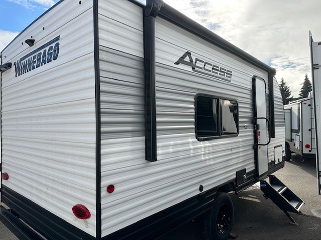 With any Winnebago Access travel trailer you will find thoughtful, clean, and contemporary designs filled with premium features that all have come to expect on any Winnebago towable. You will appreciate the stylish exterior aerodynamic front profile and durable sidewall metal for greater aerodynamics plus strength and durability. With a fully enclosed underbelly that comes with radiant foil insulation, you can easily extend your camping season into the colder months without worrying about having frozen pipes. On the inside, a foot flush toilet, roller shades, abundant storage, and spacious living areas making every camping trip more enjoyable. Make your choice today and Access your next adventure!