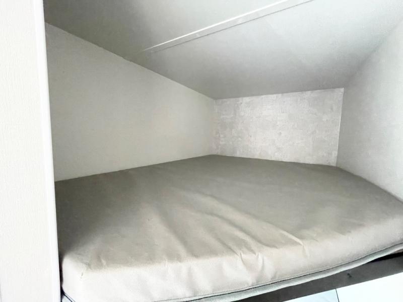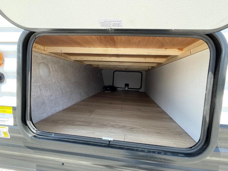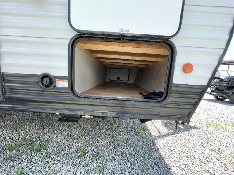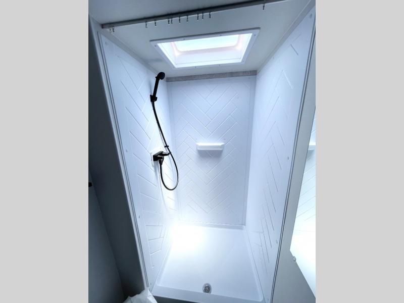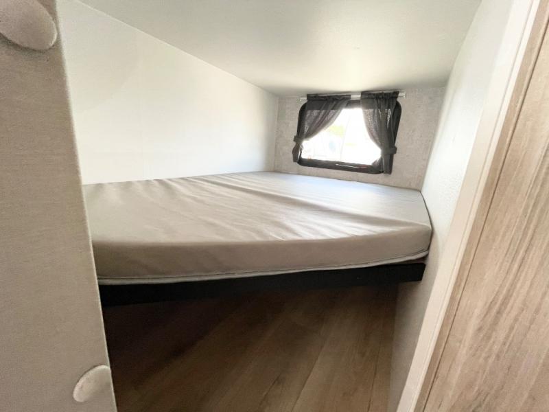 This travel trailer is designed to make camping more comfortable, affordable, and fun for the whole family! The front 60" x 80" queen bed offers a comfortable place to lay your head at night and a shirt closet to hang your clothes. There are a set of 48" x 68" bunk beds for others to sleep, and you can even transform the 38" x 68" booth dinette into extra sleeping space. The fully equipped kitchen has everything you need to prepare a delicious home cooked meal and a 12V refrigerator to store any leftovers. After a fun-filled day, head to the rear corner bathroom to freshen up in the 30" x 36" shower with 14" x 22" skylight to let in some natural lighting!