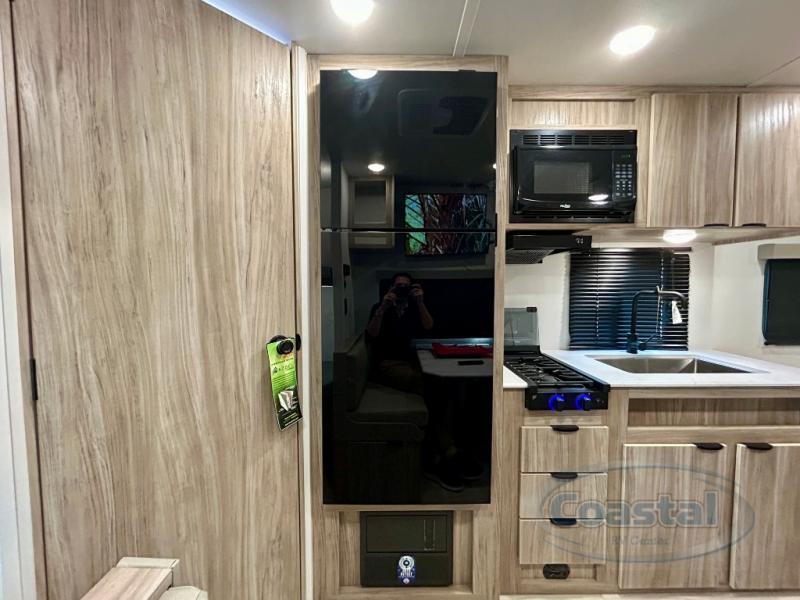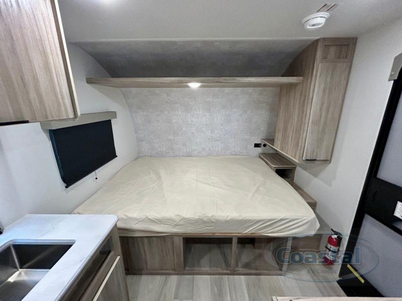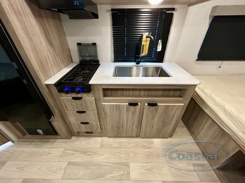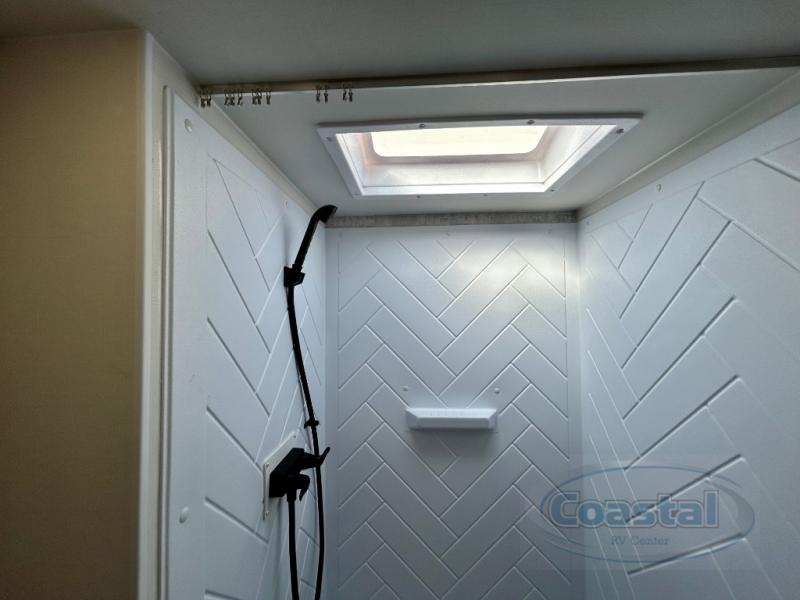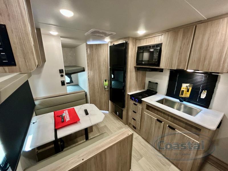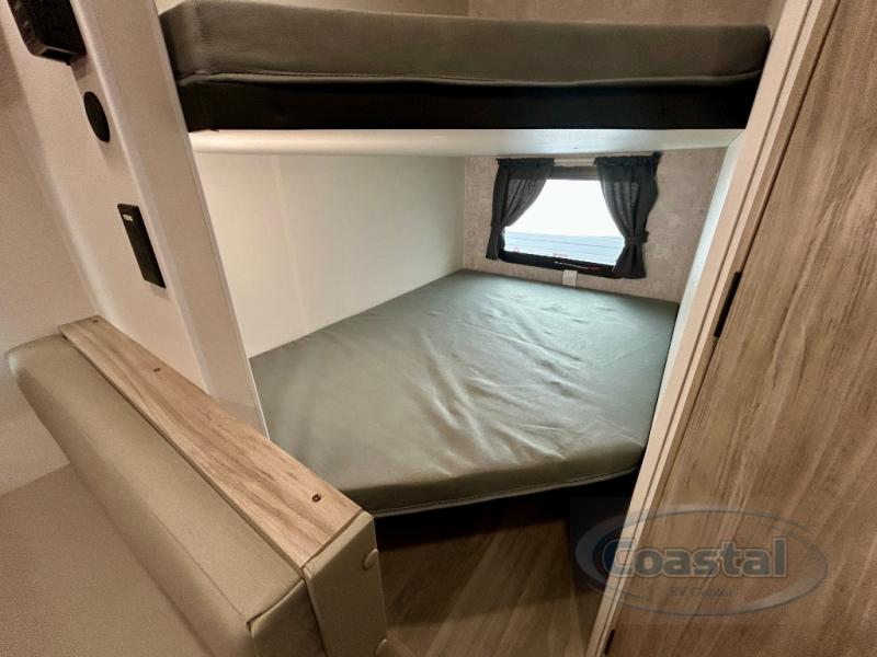 This travel trailer is designed to make camping more comfortable, affordable, and fun for the whole family! The front 60" x 80" queen bed offers a comfortable place to lay your head at night and a shirt closet to hang your clothes. There are a set of 48" x 68" bunk beds for others to sleep, and you can even transform the 38" x 68" booth dinette into extra sleeping space. The fully equipped kitchen has everything you need to prepare a delicious home cooked meal and a 12V refrigerator to store any leftovers. After a fun-filled day, head to the rear corner bathroom to freshen up in the 30" x 36" shower with 14" x 22" skylight to let in some natural lighting!