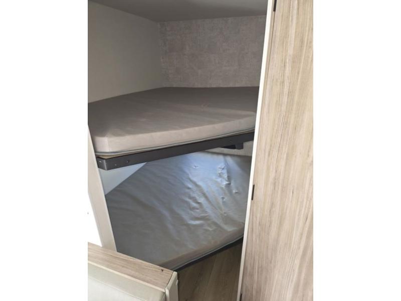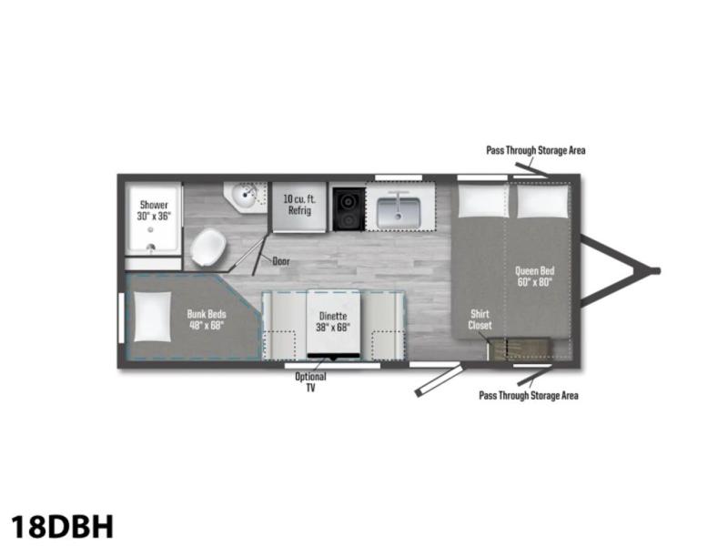 This travel trailer is designed to make camping more comfortable, affordable, and fun for the whole family! The front 60" x 80" queen bed offers a comfortable place to lay your head at night and a shirt closet to hang your clothes. There are a set of 48" x 68" bunk beds for others to sleep, and you can even transform the 38" x 68" booth dinette into extra sleeping space. The fully equipped kitchen has everything you need to prepare a delicious home cooked meal and a 12V refrigerator to store any leftovers. After a fun-filled day, head to the rear corner bathroom to freshen up in the 30" x 36" shower with 14" x 22" skylight to let in some natural lighting!