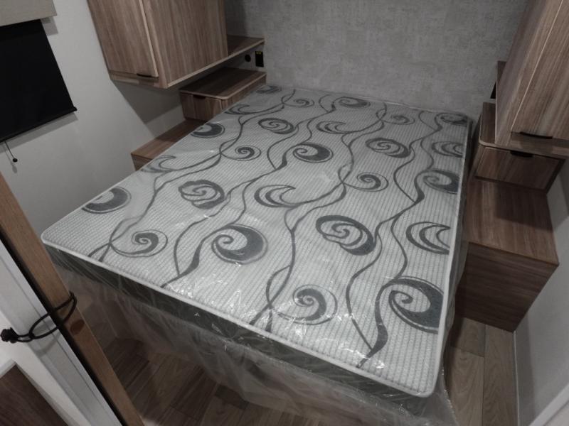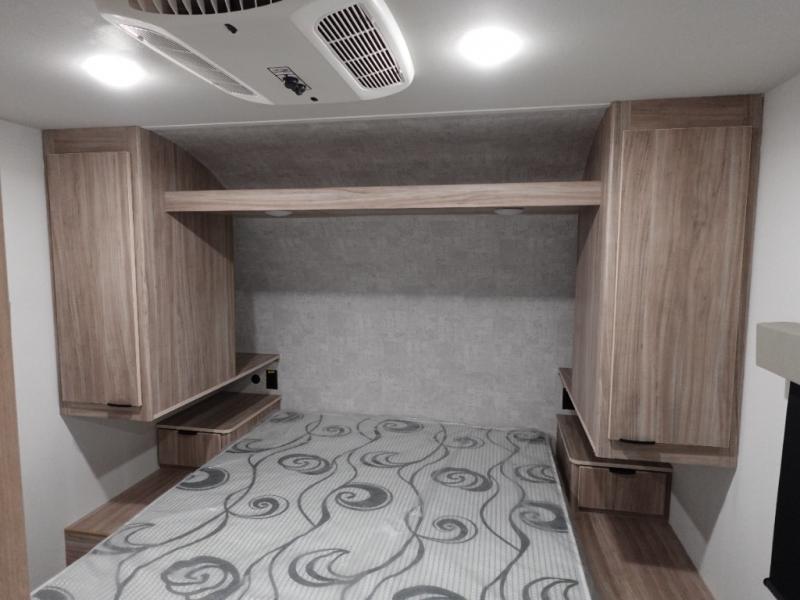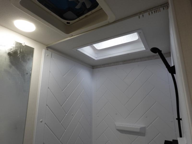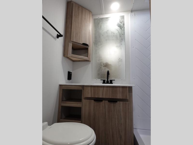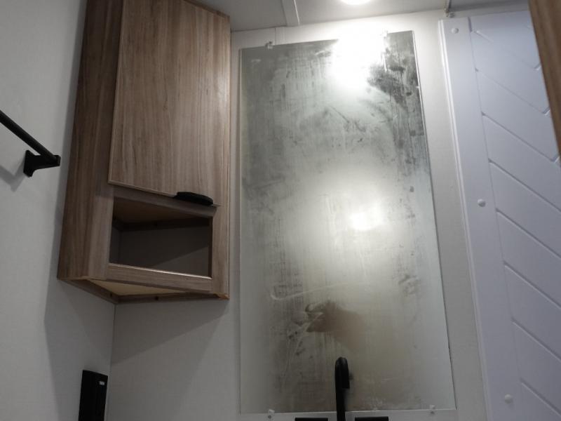 Enjoy your Access in the great outdoors! This unit features a large slide for added interior space inside. There is sleeping for two to six depending on size and furniture choices starting with the front private bedroom featuring a space saving sliding door. You can also sleep two on the optional tri-fold sofa within the slide, and the dinette opposite can be converted for one or two little ones. You will find ample storage throughout in overhead storage cabinets, under bed storage and wardrobes, plus more. The kitchen appliances are also within the large slide, plus you will find a nice size sink in the rear roadside corner with storage both above and below. A convenient rear corner bathroom allows you to skip the use of the camp facilities and enjoy cleaning up in the privacy of your own unit. Here you will find a 30" x 36" shower, porcelain toilet and a vanity with sink and corner medicine cabinet. You will also appreciate the exterior storage door within the slide and there is also convenient pass-through storage for your larger camp items to be neatly tucked away when not in use.