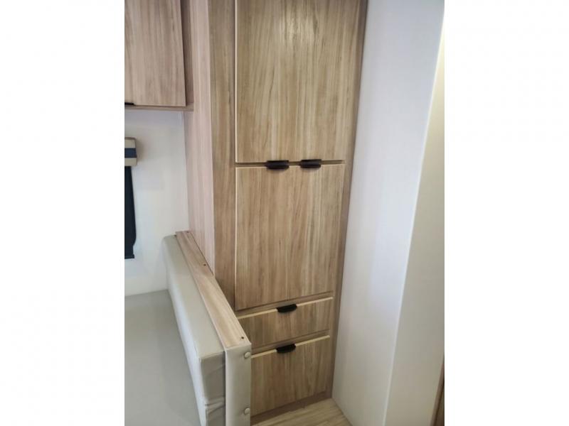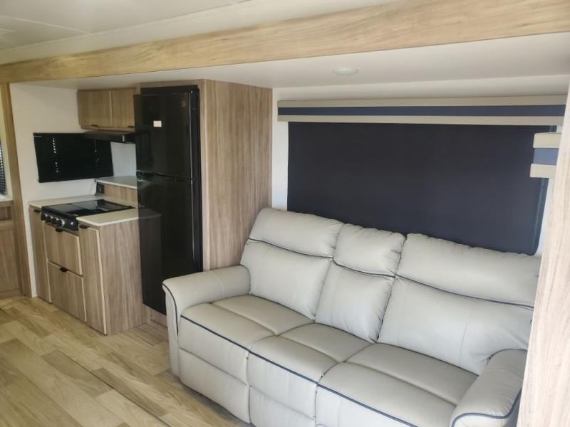 Enjoy your Access in the great outdoors! This unit features a large slide for added interior space inside. There is sleeping for two to six depending on size and furniture choices starting with the front private bedroom featuring a space saving sliding door. You can also sleep two on the optional tri-fold sofa within the slide, and the dinette opposite can be converted for one or two little ones. You will find ample storage throughout in overhead storage cabinets, under bed storage and wardrobes, plus more. The kitchen appliances are also within the large slide, plus you will find a nice size sink in the rear roadside corner with storage both above and below. A convenient rear corner bathroom allows you to skip the use of the camp facilities and enjoy cleaning up in the privacy of your own unit. You will also appreciate the exterior storage door within the slide and there is also convenient pass-through storage for your larger camp items to be neatly tucked away when not in use.