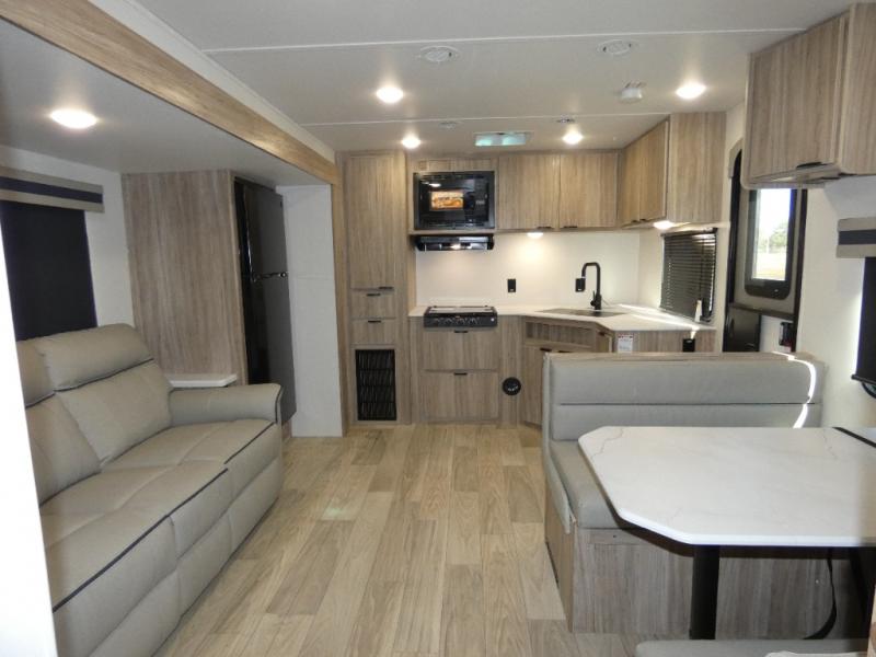 This single slide Access travel trailer features a front kitchen layout, a large roadside slide, and a private bedroom beyond a walk-through full bath. It also features both front and rear pass-through storage, as well as dual entry doors! You will find the main combined living area and kitchen open and spacious thanks to the slide. Cook your family their favorite meals with the appliances inside, dine at the 72" x 41" dinette where you can add an optional TV above to enjoy from the theater seating opposite. A convenient walk-through bath is spacious enough for two to get ready at once since it is the full width of the trailer. Next, head through space saving sliding doors to the rear private bedroom with its own access to the outside through the second entry. Here, a queen bed awaits for a great nights rest. This bedroom offers plenty of storage with bedside wardrobes, a closet just off the foot of the bed, under bed storage for extra blankets and larger items, plus so much more!