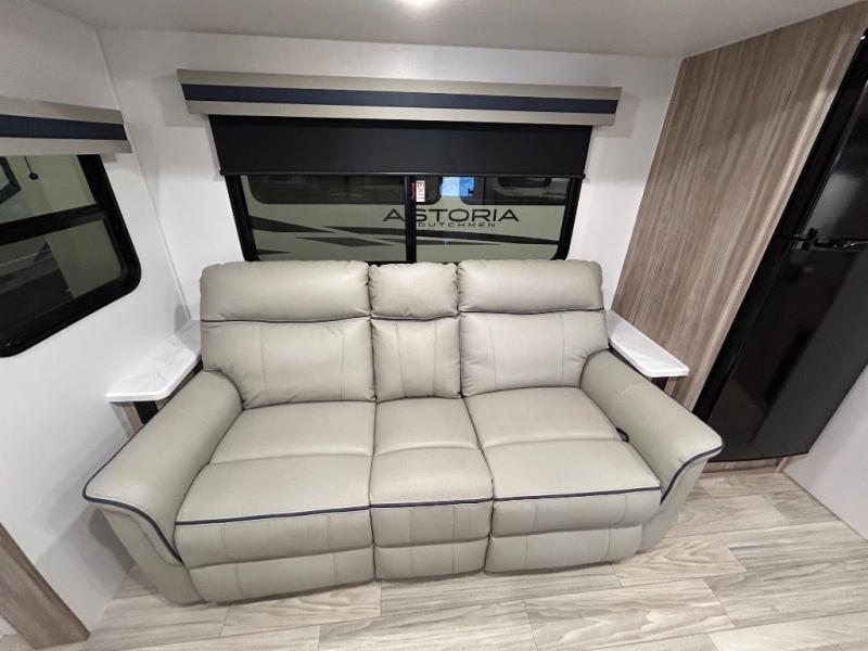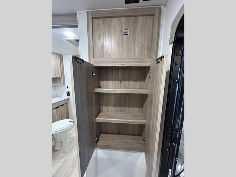 This single slide Access travel trailer features a front kitchen layout, a large roadside slide, and a private bedroom beyond a walk-through full bath. It also features both front and rear pass-through storage, as well as dual entry doors! You will find the main combined living area and kitchen open and spacious thanks to the slide. Cook your family their favorite meals with the appliances inside, dine at the 72" x 41" dinette where you can add an optional TV above to enjoy from the theater seating opposite. A convenient walk-through bath is spacious enough for two to get ready at once since it is the full width of the trailer. Next, head through space saving sliding doors to the rear private bedroom with its own access to the outside through the second entry. Here, a queen bed awaits for a great nights rest. This bedroom offers plenty of storage with bedside wardrobes, a closet just off the foot of the bed, under bed storage for extra blankets and larger items, plus so much more!