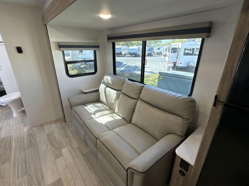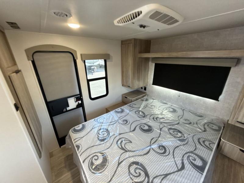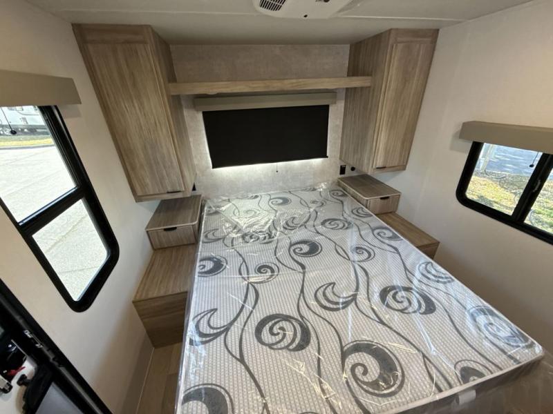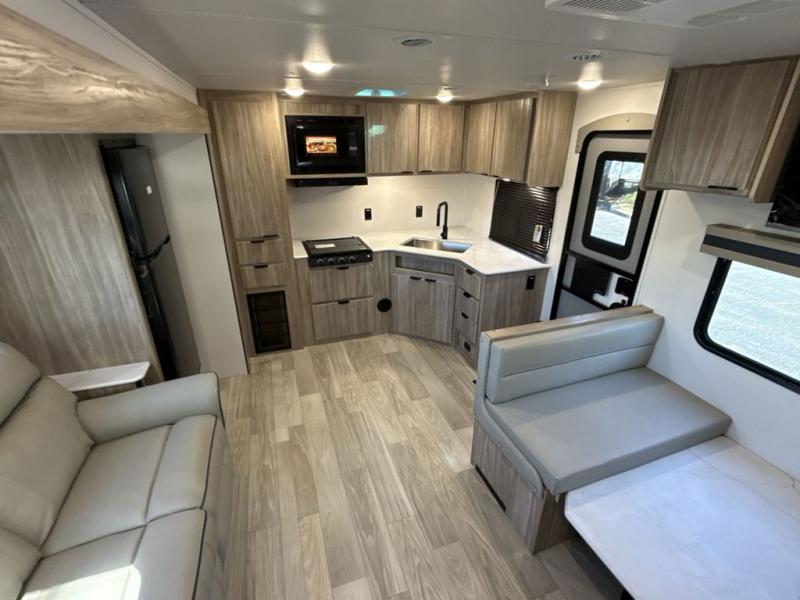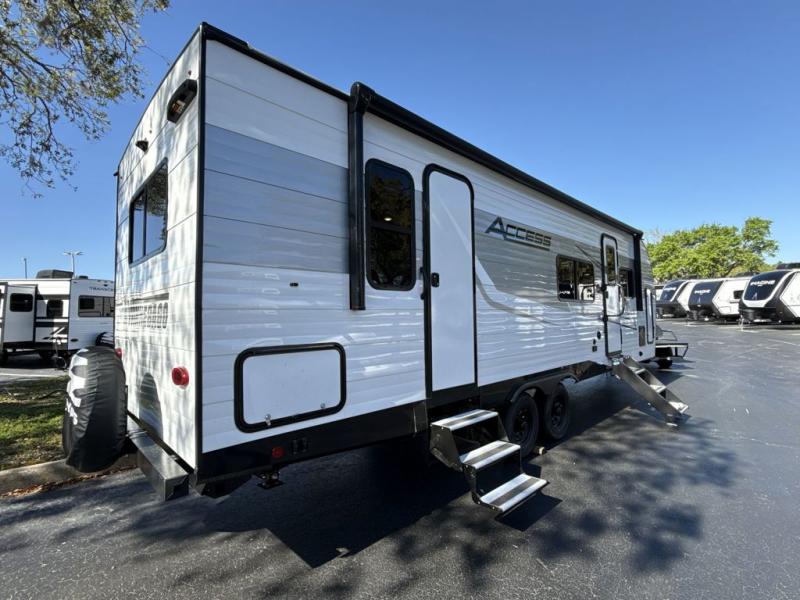 This single slide Access travel trailer features a front kitchen layout, a large roadside slide, and a private bedroom beyond a walk-through full bath. It also features both front and rear pass-through storage, as well as dual entry doors! You will find the main combined living area and kitchen open and spacious thanks to the slide. Cook your family their favorite meals with the appliances inside, dine at the 72" x 41" dinette where you can add an optional TV above to enjoy from the theater seating opposite. A convenient walk-through bath is spacious enough for two to get ready at once since it is the full width of the trailer. Next, head through space saving sliding doors to the rear private bedroom with its own access to the outside through the second entry. Here, a queen bed awaits for a great nights rest. This bedroom offers plenty of storage with bedside wardrobes, a closet just off the foot of the bed, under bed storage for extra blankets and larger items, plus so much more!