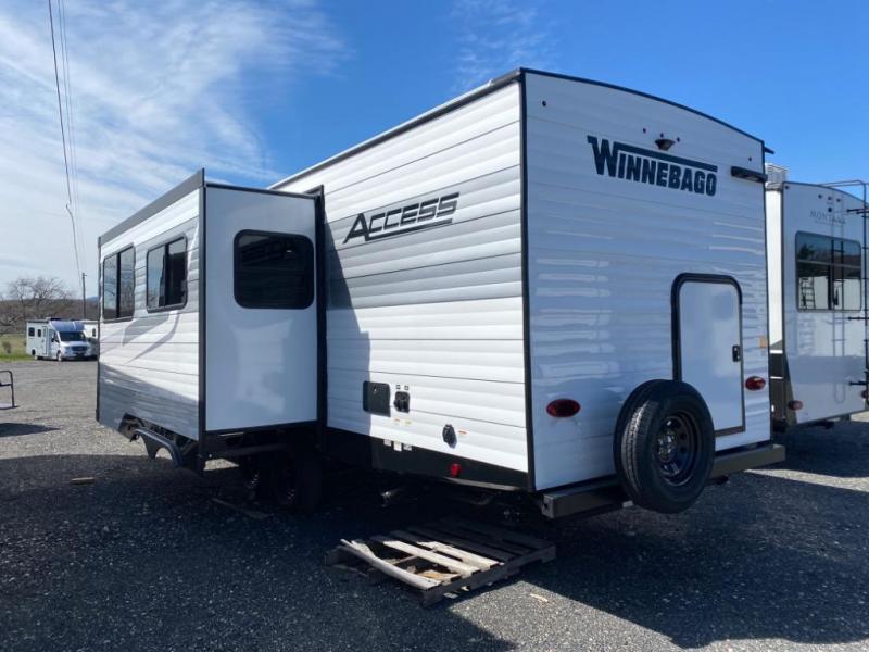 With any Winnebago Access travel trailer you will find thoughtful, clean, and contemporary designs filled with premium features that all have come to expect on any Winnebago towable. The powered stabilizer jacks make setting up camp easy with just the touch of a single button. You will appreciate the stylish exterior front profile and thicker sidewall metal for greater aerodynamics plus strength and durability. With a fully enclosed underbelly you can extend your camping season into the colder months, and the 12 volt tank pad heaters will keep you from having frozen pipes. On the inside, a porcelain toilet, larger skylights for more natural lighting, abundant storage, and spacious living areas make every camping trip more enjoyable. And, the 200 watt solar power reduces the need for shore power which makes it easy to go off-grid. Make your choice today and Access your next adventure.