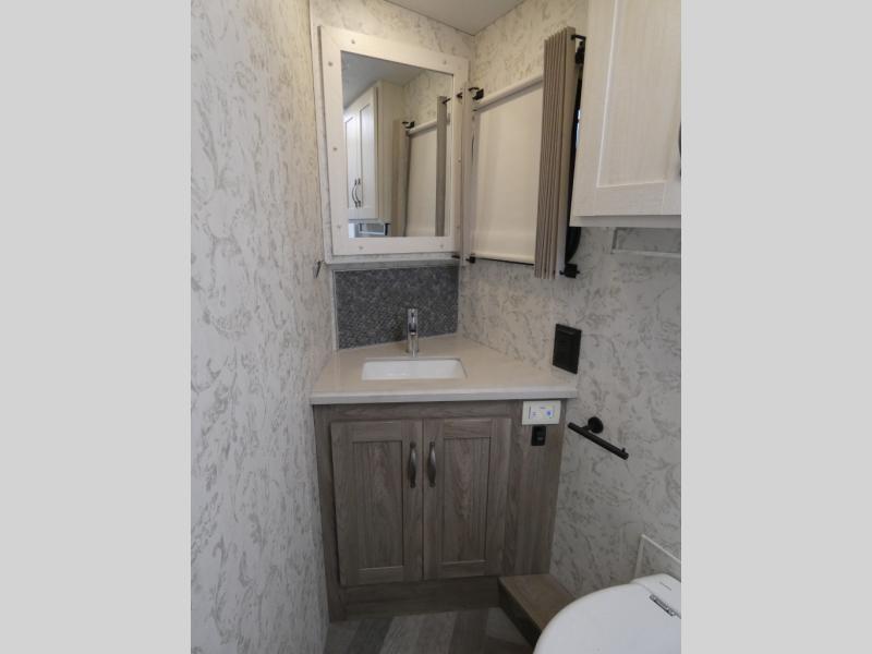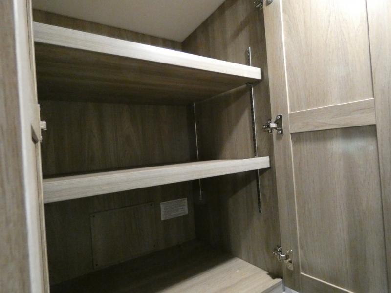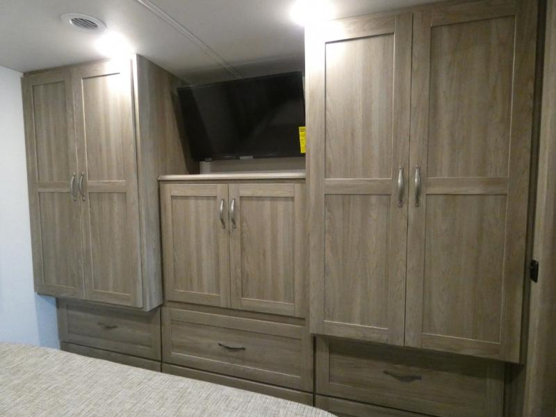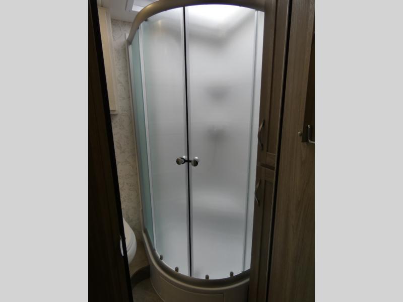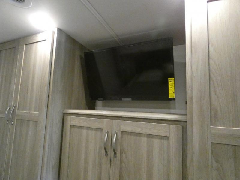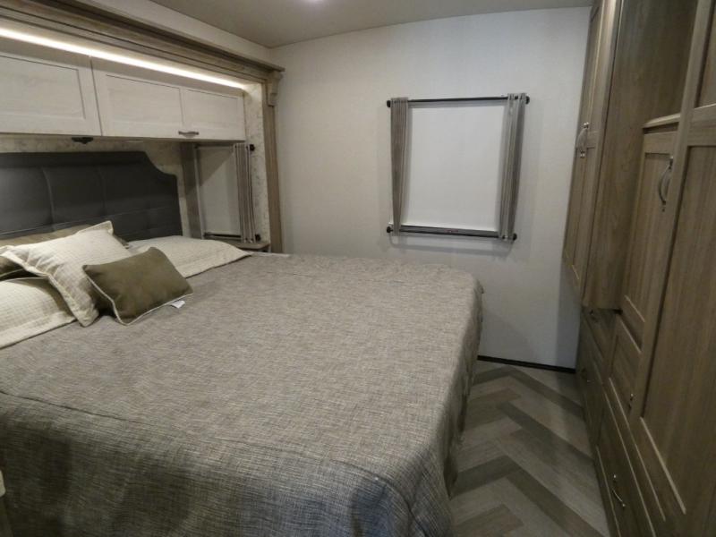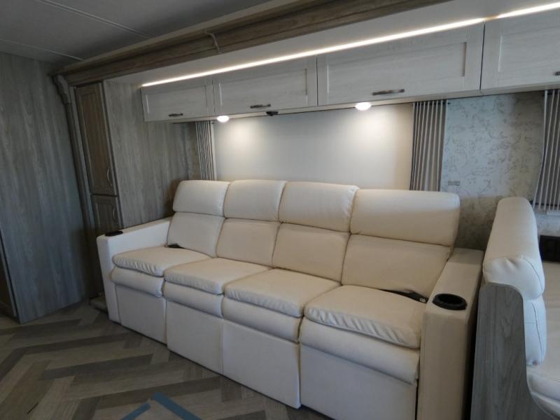 You'll love traveling across the country or your home state in this double slide out coach! The swivel captain's seats can become a part of the living area once you're parked, and the removable pedestal table here will be perfect for your coffee or a card game. You'll find additional seating on the powered theater seat/sofa and the dinette with a Hi-Lo table, all in great view of the 50" HDTV. Your guests can sleep on the furniture at night. Head to the kitchen to prepare lunch on the gas/induction range or in the convection microwave, and you'll love the stainless steel residential refrigerator with an ice maker and water dispenser for added luxury. Staying fresh throughout your trip will be easier than ever with the full bath that includes a textured glass shower door, a flexible showerhead, a skylight, and more! The rear private bedroom will feel just like home with its king bed slide out, dual nightstands and wardrobes, plus a bedroom 32" HDTV for movies in bed!