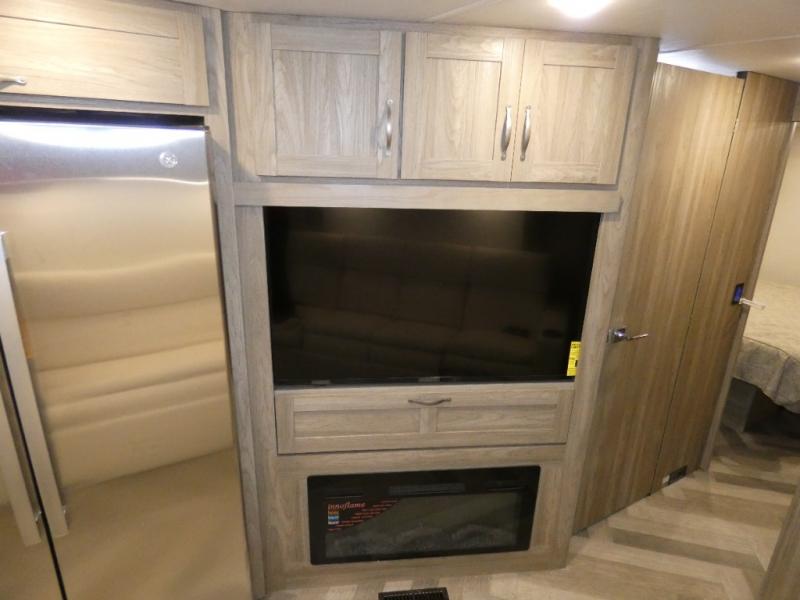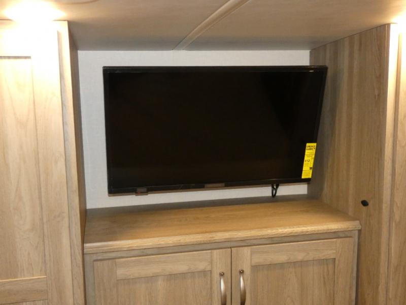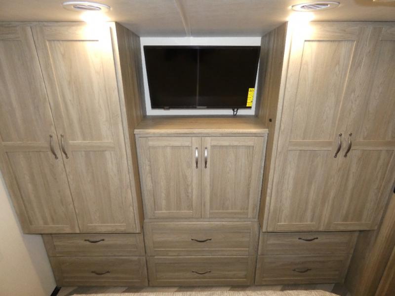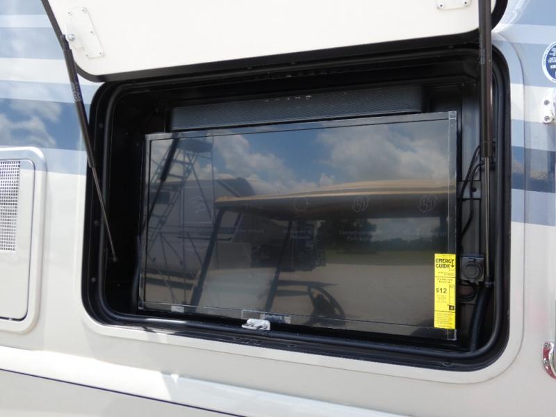 You'll love traveling across the country or your home state in this double slide out coach! The swivel captain's seats can become a part of the living area once you're parked, and the removable pedestal table here will be perfect for your coffee or a card game. You'll find additional seating on the powered theater seat/sofa and the dinette with a Hi-Lo table, all in great view of the 50" HDTV. Your guests can sleep on the furniture at night, or you can use the StudioLoft bed. Head to the kitchen to prepare lunch on the gas/induction range or in the convection microwave, and you'll love the stainless steel residential refrigerator with an ice maker and water dispenser for added luxury. Staying fresh throughout your trip will be easier than ever with the full bath that includes a textured glass shower door, a flexible showerhead, a skylight, and more! The rear private bedroom will feel just like home with its king bed slide out, dual nightstands and wardrobes, plus a bedroom 32" HDTV for movies in bed!