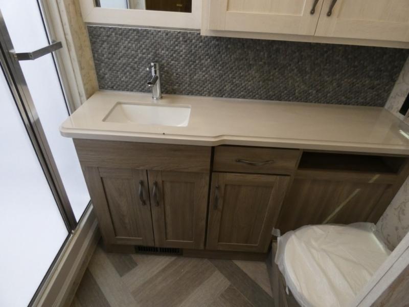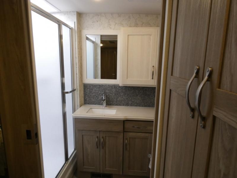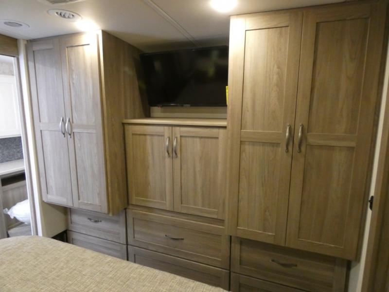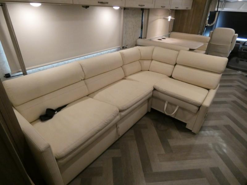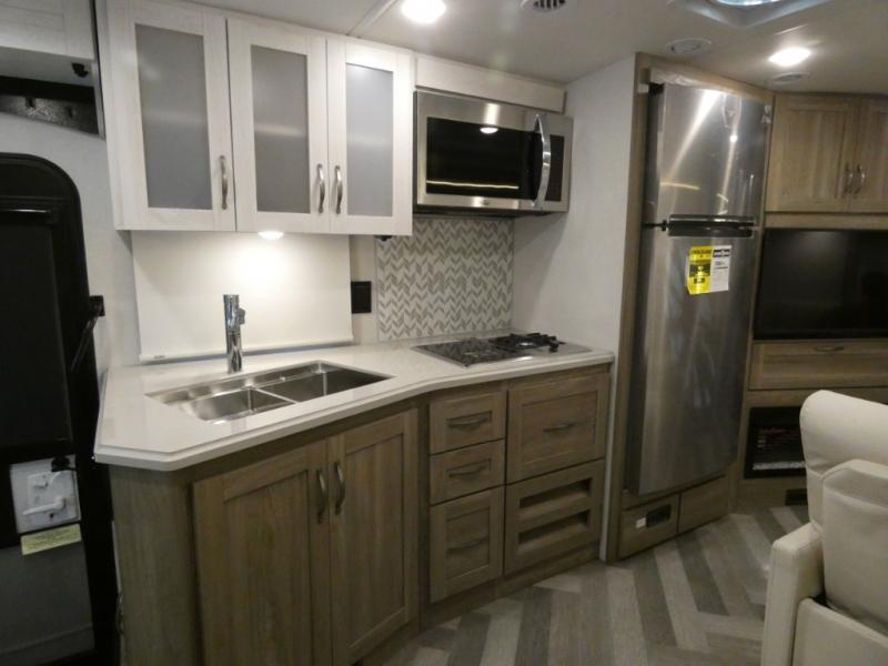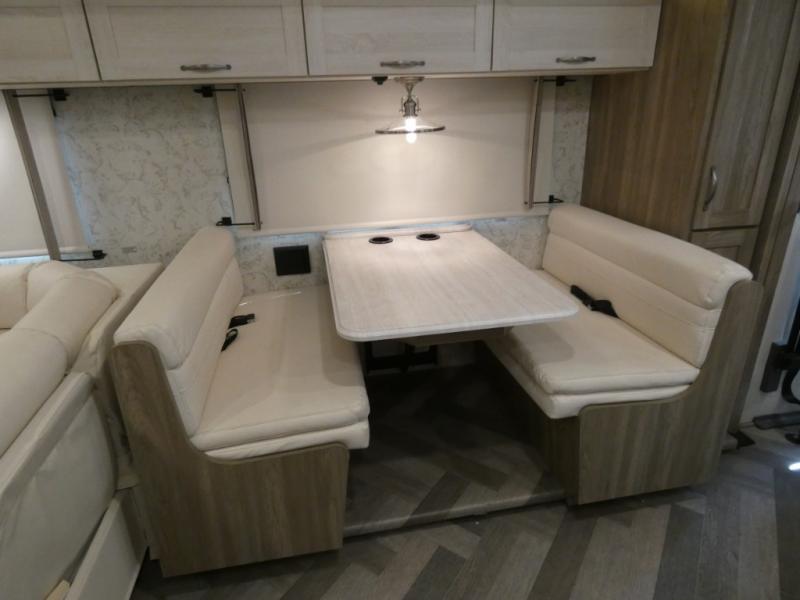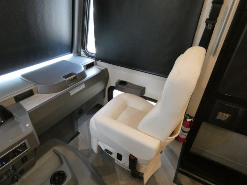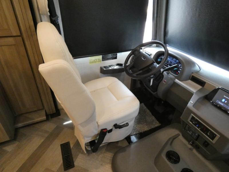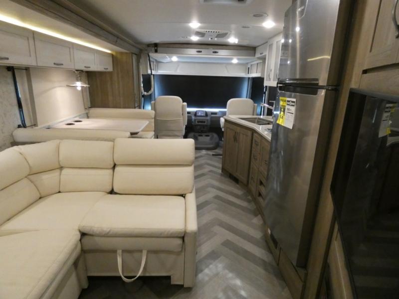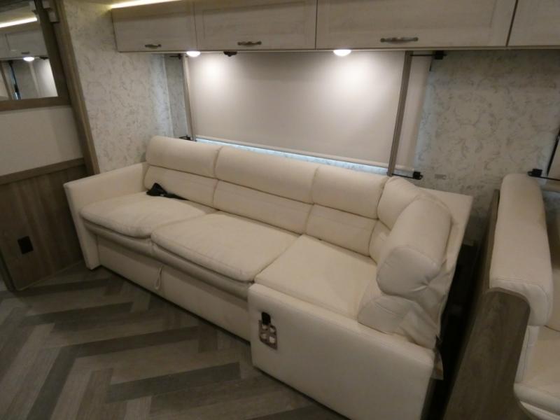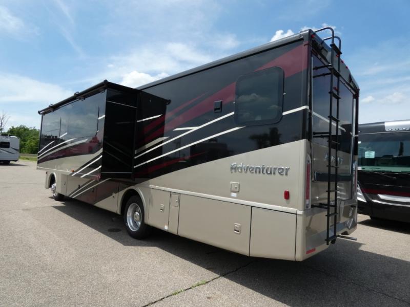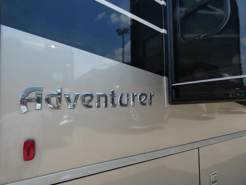The family-friendly Adventurer Class A gas motorhome by Winnebago is the ultimate family getaway for your trips near and far. The swivel captain's seats include fixed lumbar support and multi-adjustable slide/recline for a truly comfortable ride. You will appreciate the Sony 9" TS radio with Bluetooth, a rearview and sideview monitor system with a color touch screen, SiriusXM ready, and more to make the drive easier than ever. There is also a Driver Confidence Package with added safety features for an overall better driving experience. The powered blackout roller visor/shade on the front windshield will provide privacy when you stop for lunch, and the dash workstation will come in handy when you've got a deadline. Each model includes residential vinyl flooring throughout, a soft vinyl ceiling, a Corian galley countertop, and ceramic tile backsplash. The under-bed storage will provide a place for your luggage, and you'll find lighted storage compartments outside for all your larger gear.