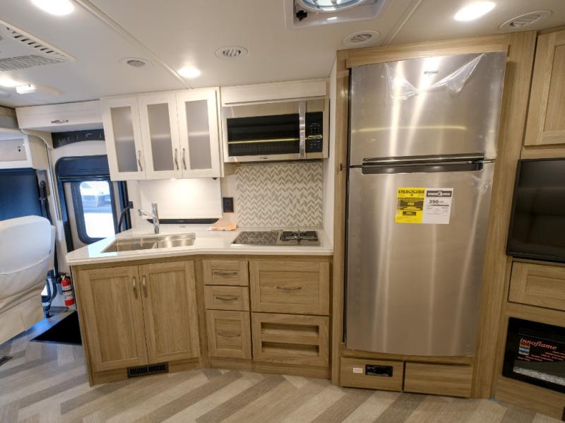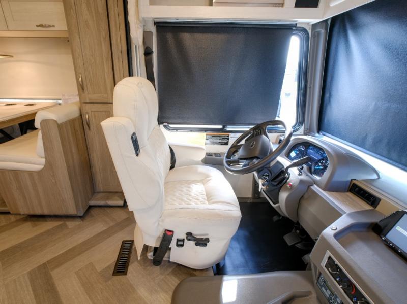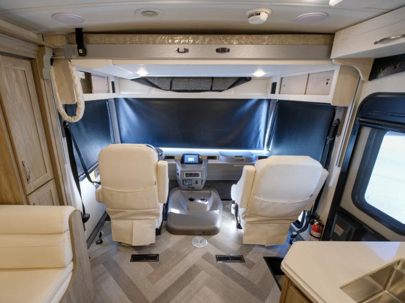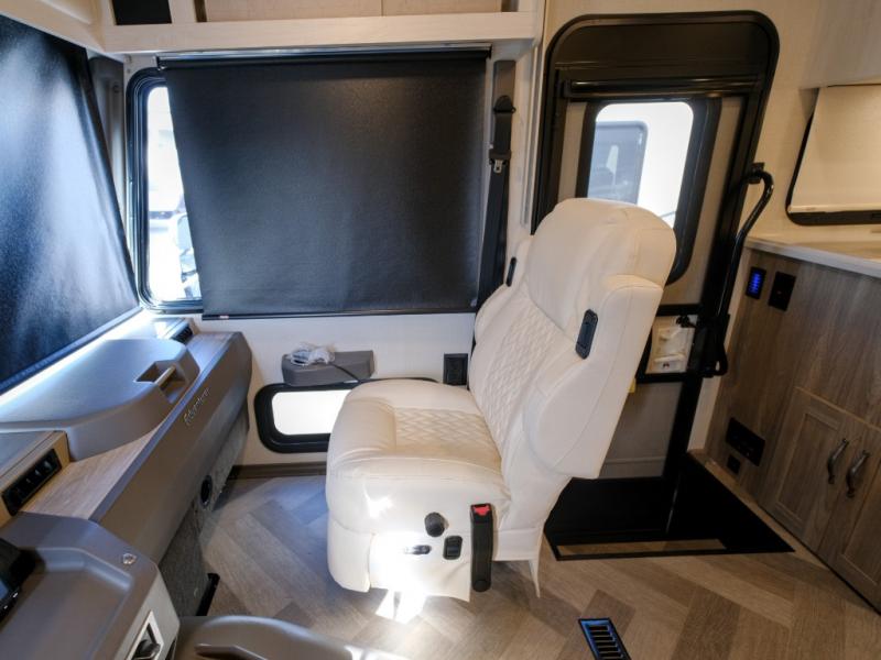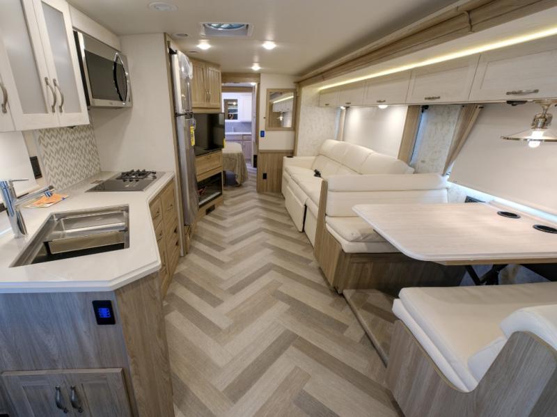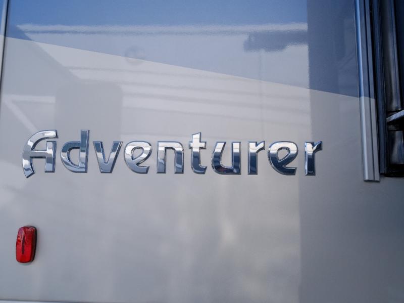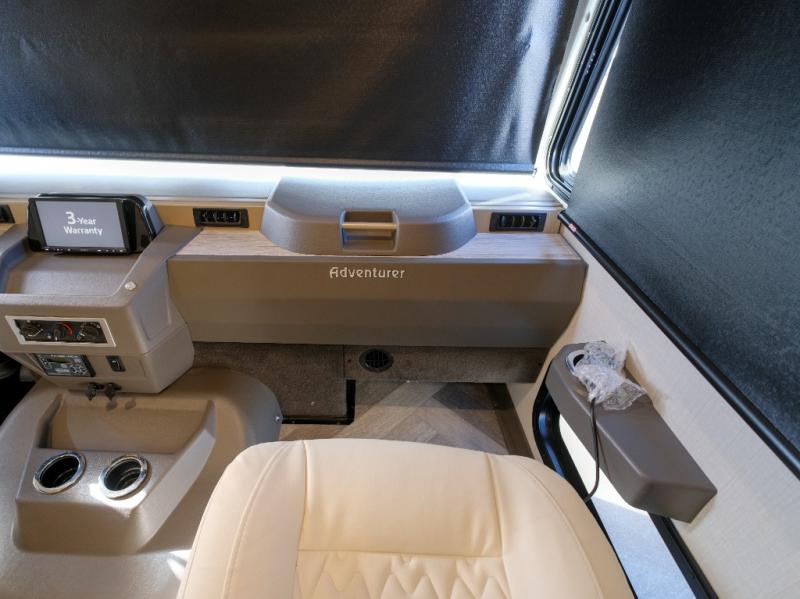 The family-friendly Adventurer Class A gas motorhome by Winnebago is the ultimate family getaway for your trips near and far. The swivel captain's seats include fixed lumbar support and multi-adjustable slide/recline for a truly comfortable ride. You will appreciate the Sony 9" TS radio with Bluetooth, a rearview and sideview monitor system with a color touch screen, SiriusXM ready, and more to make the drive easier than ever. There is also a Driver Confidence Package with added safety features for an overall better driving experience. The powered blackout roller visor/shade on the front windshield will provide privacy when you stop for lunch, and the dash workstation will come in handy when you've got a deadline. Each model includes residential vinyl flooring throughout, a soft vinyl ceiling, a Corian galley countertop, and ceramic tile backsplash. The under-bed storage will provide a place for your luggage, and you'll find lighted storage compartments outside for all your larger gear.