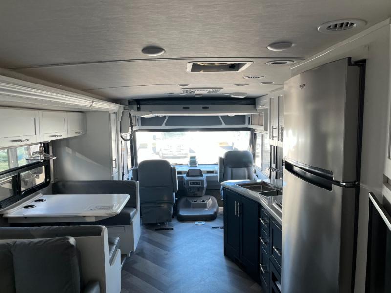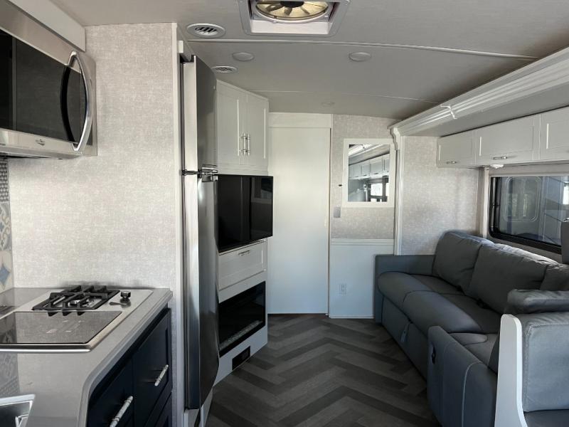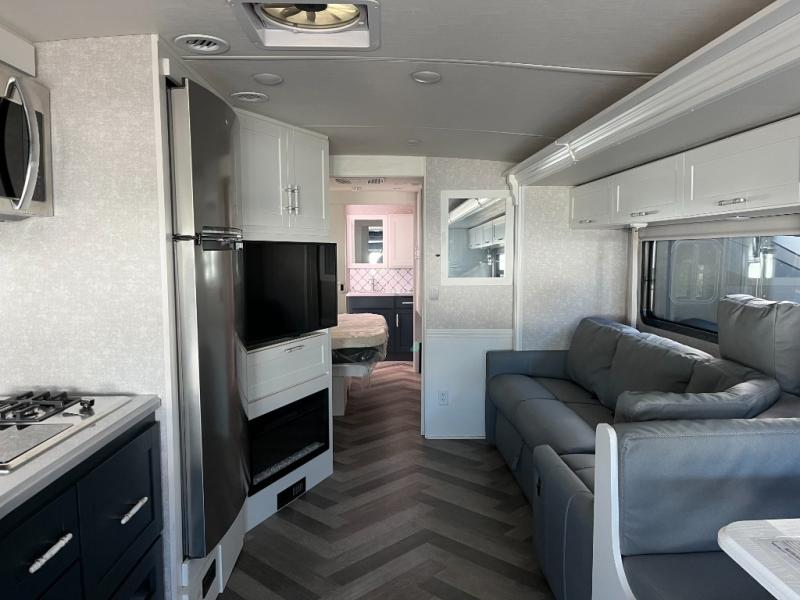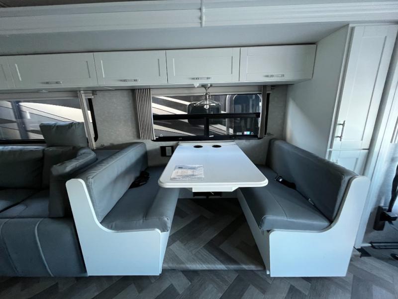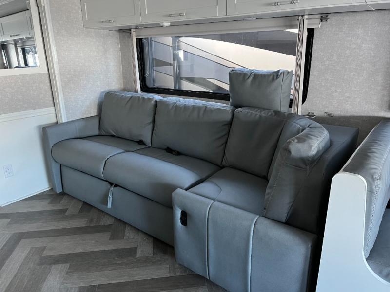 Step inside the Winnebago Adventurer 35F and be welcomed by an open, inviting living space designed for relaxation and connection. The well-appointed interior features comfortable seating, stylish décor, and panoramic windows that fill the cabin with natural light and beautiful views.