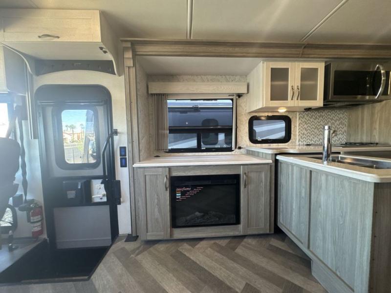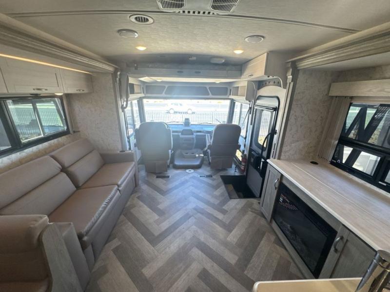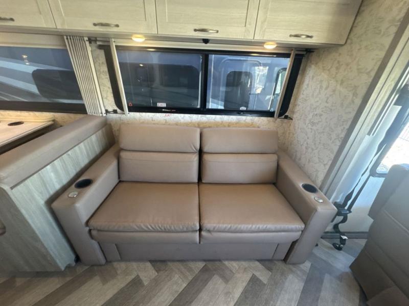 The family-friendly Adventurer Class A gas motorhome by Winnebago is the ultimate family getaway for your trips near and far. The swivel captain's seats include fixed lumbar support and multi-adjustable slide/recline for a truly comfortable ride. You will appreciate the Sony 9" TS radio with Bluetooth, a rearview and sideview monitor system with a color touch screen, SiriusXM ready, and more to make the drive easier than ever. There is also a Driver Confidence Package with added safety features for an overall better driving experience. The powered blackout roller visor/shade on the front windshield will provide privacy when you stop for lunch, and the dash workstation will come in handy when you've got a deadline. Each model includes residential vinyl flooring throughout, a soft vinyl ceiling, a Corian galley countertop, and ceramic tile backsplash. The under-bed storage will provide a place for your luggage, and you'll find lighted storage compartments outside for all your larger gear. The optional SumoSprings suspension system and steering stabilizing system can be added to make the drive even smoother, and the optional WinnSleep Premium Serene mattress is another option you may want to add for all-around comfort!