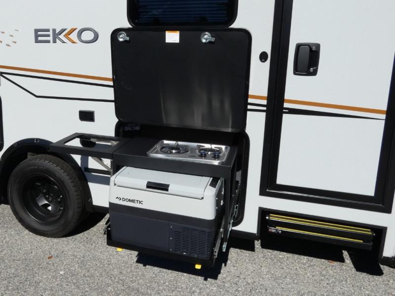 With the efficiency of a camper van, the capacity of a Class C coach, and the enhanced capability of AWD, the Winnebago Ekko Class C gas motorhome is ready to change the way you travel! You will be ready for all sorts of weather with the insulated water service center and heated holding tank compartment, and you will also be ready to camp just about anywhere with the three solar panels and Cummins Onan® QG 2,800i gas generator. The heated gear garage has an L-track cargo tie-down system, and the RAM Tough-Track mount is an innovative way to mount a variety of different devices. The Ekko also has some very accommodating features that are included in its list of options, like the optional batwing awning, pop-top sleeping area with FROLI sleep system, luggage rack, and exterior kitchen.