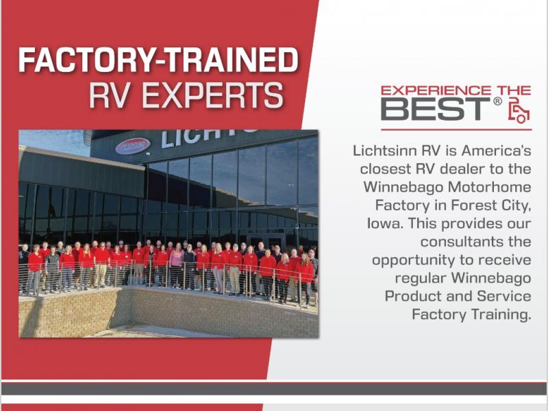 At Lichtsinn RV our website has full video walkarounds on each RV, making it easy for you to purchase. On our website you can go for a virtual test drive, purchase your RV over the phone or the internet, and then take delivery at our dealership, which is only 1 Mile from the Winnebago Motorhome Factory here in Forest City, Iowa!