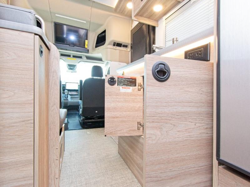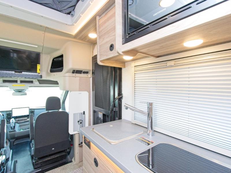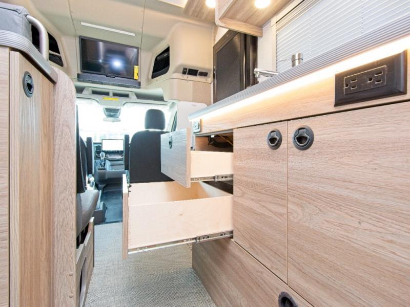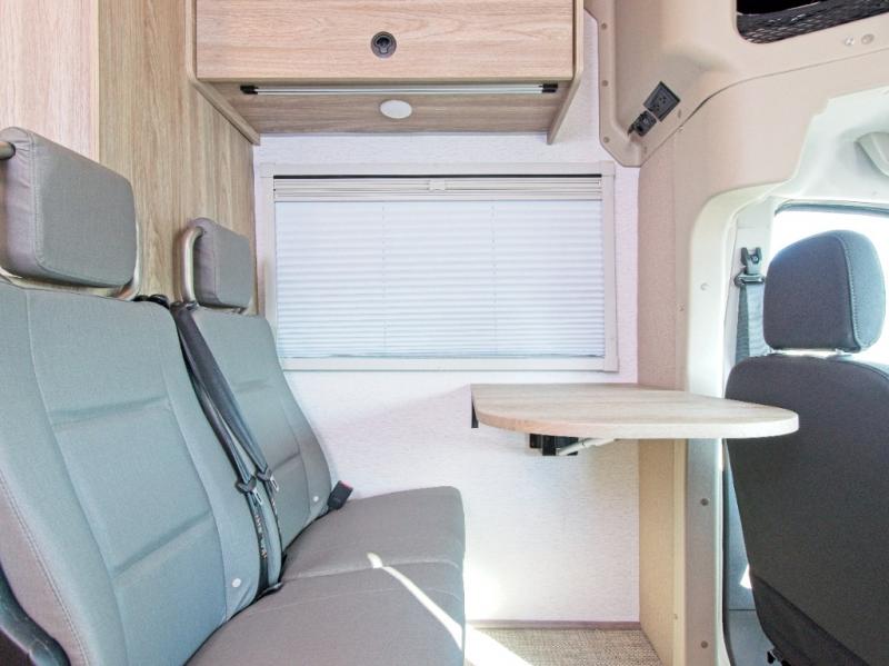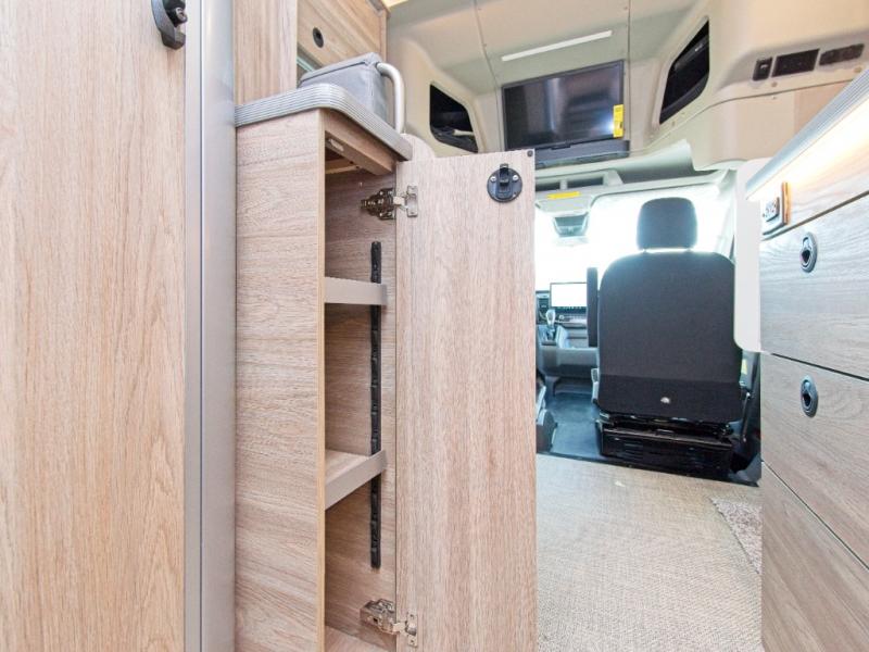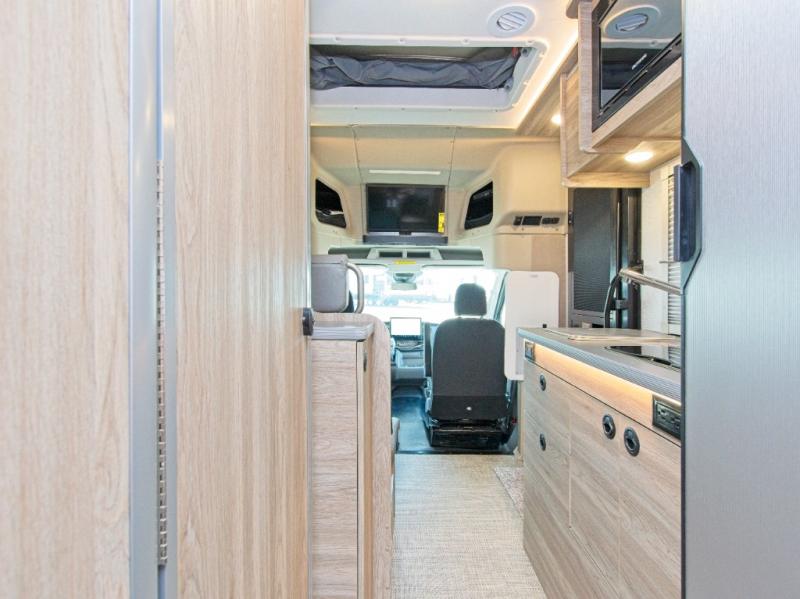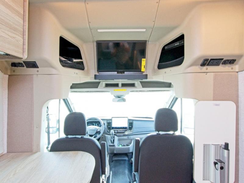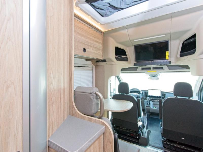 Inside, you'll find a thoughtfully designed layout that maximizes every inch of space. The 24" x 30" wet bath features a pivoting lavatory wall, offering a full bathroom experience without sacrificing room. The swivel cab seats double as dining chairs, while the adjustable work table serves as a workstation or extra kitchen counter space.