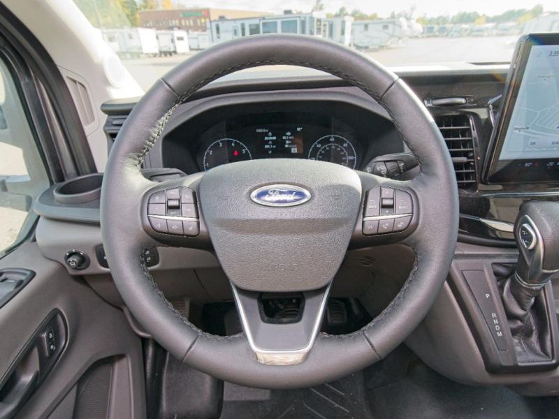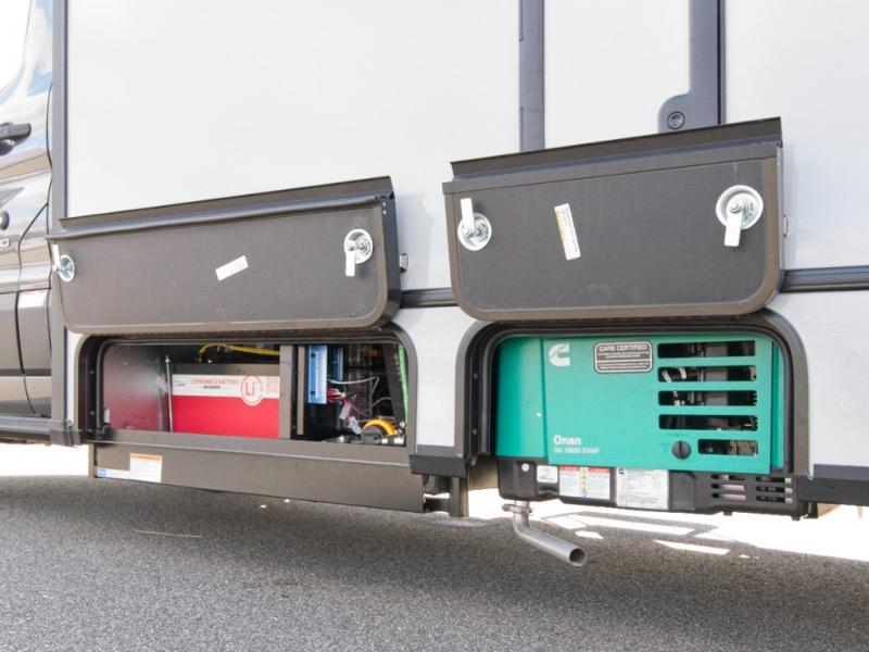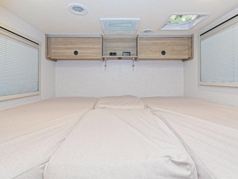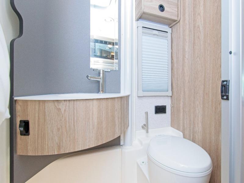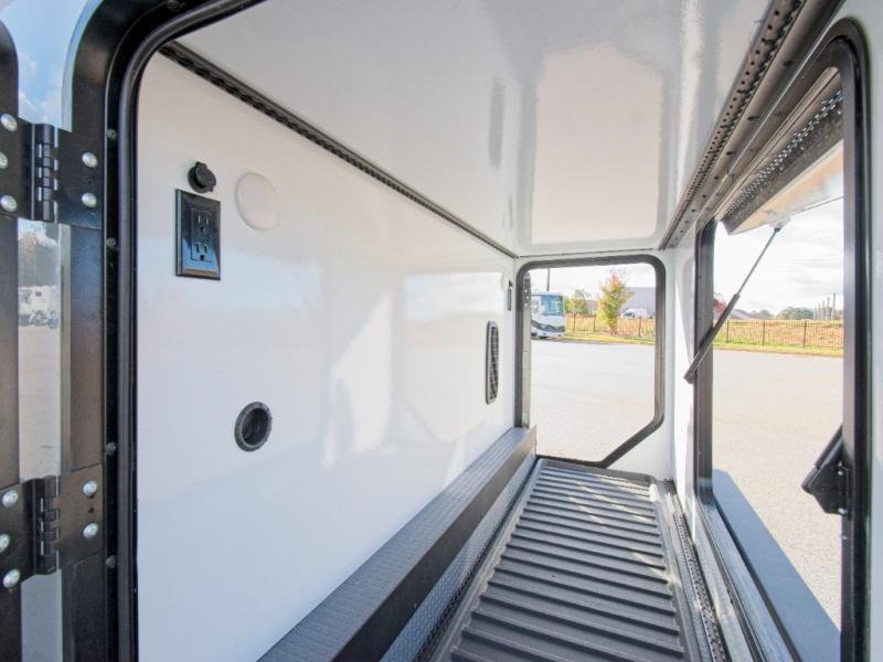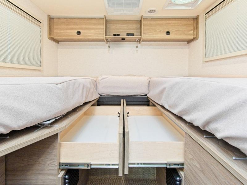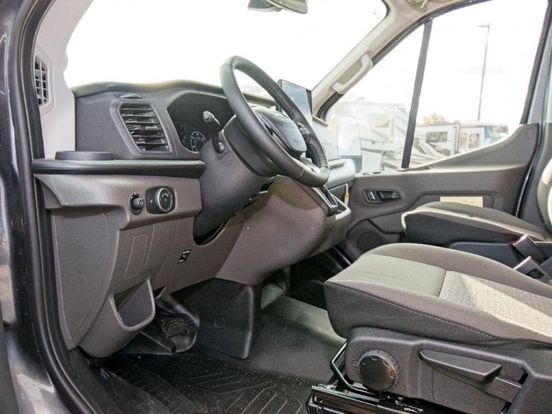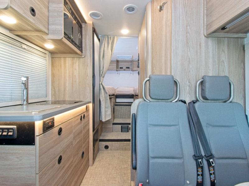 Inside, you'll find a thoughtfully designed layout that maximizes every inch of space. The 24" x 30" wet bath features a pivoting lavatory wall, offering a full bathroom experience without sacrificing room. The swivel cab seats double as dining chairs, while the adjustable work table serves as a workstation or extra kitchen counter space.