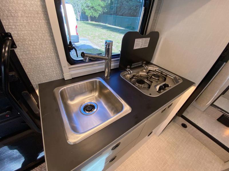 This EKKO all-wheel drive Class C gas motorhome is just unbelievably functional! Not only do you have plenty of storage space for all of your gear with the gear garage, under-bed storage, pantry, and 5.3-cubic foot refrigerator, but you also have a 24" x 30" wet bath with a pivoting lavatory wall so you can stay clean without having to stop at rest areas along the way. The cab area is excellently appointed with a radio/rearview monitor system, swivel/recline cab seats, and many driving safety features. Since the cab seats can swivel, you can use them as another place to sit down and eat at the fold-down table, and you can also use the swivel/adjustable work table for the passenger cab seat or as an extended countertop in the kitchen. Above the dining area is an access point to the optional pop-top sleeping area which would come in handy if you travel with multiple people.