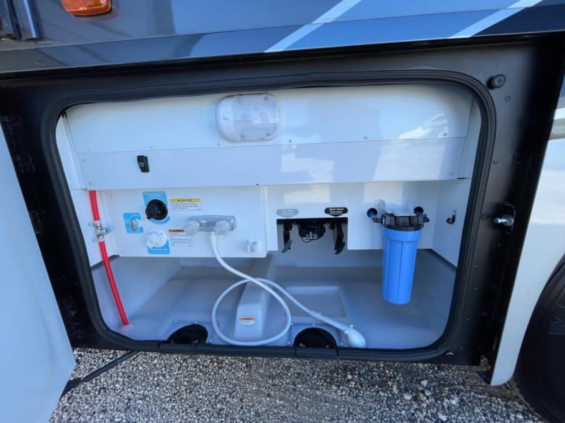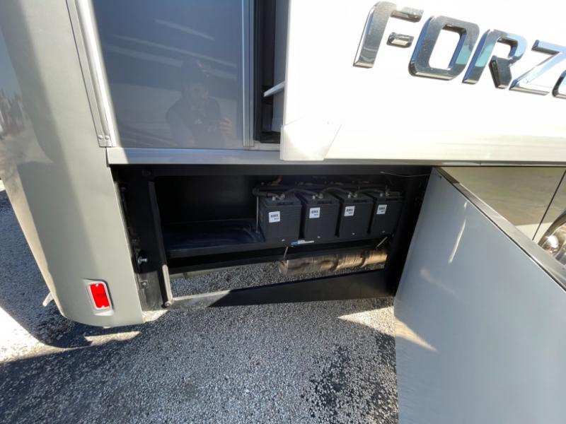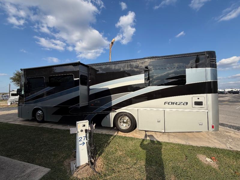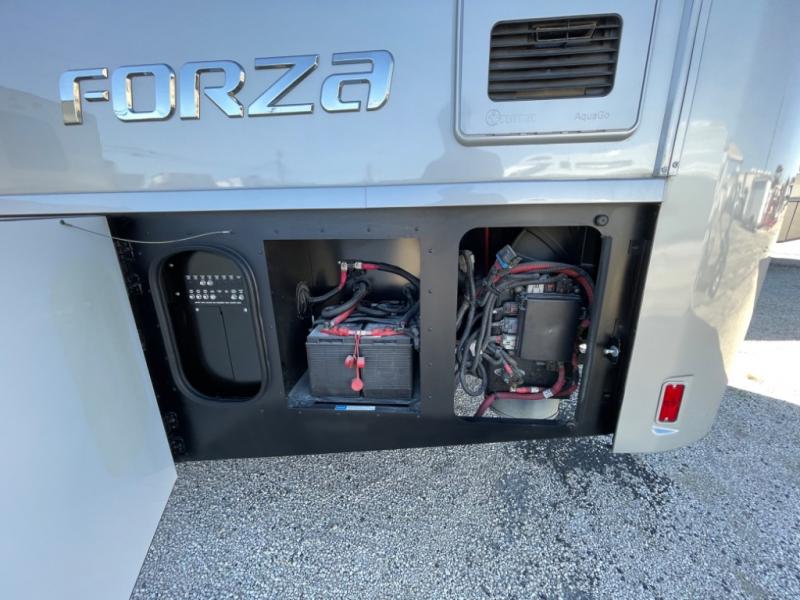 There isn't a thing you won't love about the Winnebago Forza Class A diesel motorhome! These powerful and practical coaches have excellent quality in their construction, and the undercarriage lighting is quite stylish and impressive. You'll find NeWay air suspension with V-Ride, automatic hydraulic leveling jacks, a 10,000-lb. hitch, and automatic entrance steps. Sitting in the cab will be enjoyable with the multi-adjustable swivel and recline seats, the radio/rearview monitor system with 9" LCD color touchscreen, the cellphone interface to radio, and the TRW® tilt/telescopic steering column with foot-actuated pedal. The interior has a Firefly switch panel that lights up when it's dark, and the 6,000W Cummins Onan generator is what you need to power your coach. You will also find vinyl flooring throughout, blackout roller shades, Corian countertops, a textured glass shower door, and many more comforts you'd expect to find at home!