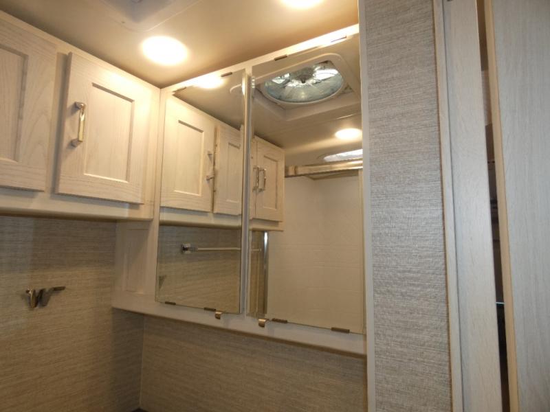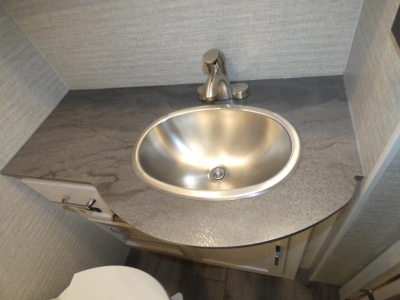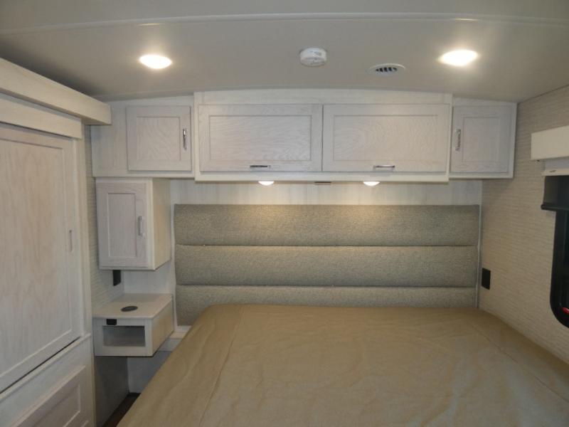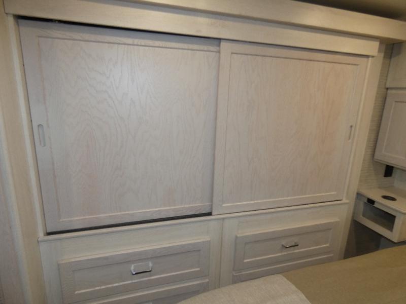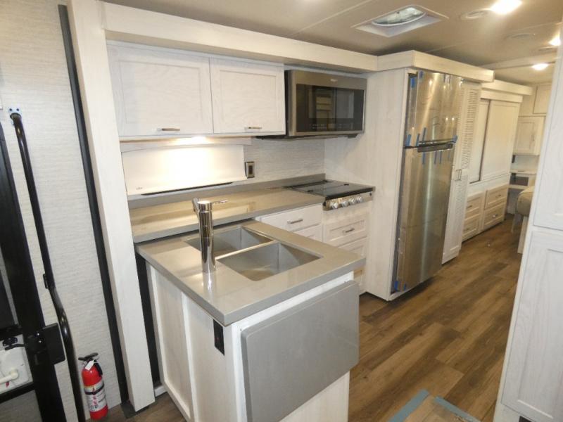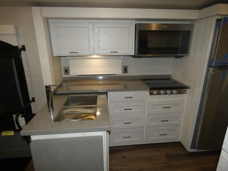 With this Forza Class A diesel motorhome, you won't even need to plan a destination because this coach is the only getaway you need! You could park it in your backyard and still feel as if you've gone away on a retreat. The interior has great accommodations with its BenchMark dinette, theater seating, and swivel/recline cab seats, and the large slide provides extra space for you to spread out and relax. The kitchen is fully equipped with the best tools, and the flip-up countertop extension is going to be helpful for providing extra counter space when it is pulled out into place. You will find another large slide that carries over from the kitchen into the bedroom, and the bedroom even has its very own 32" HDTV so that you can watch your favorite shows while lying down on the king-size bed.
