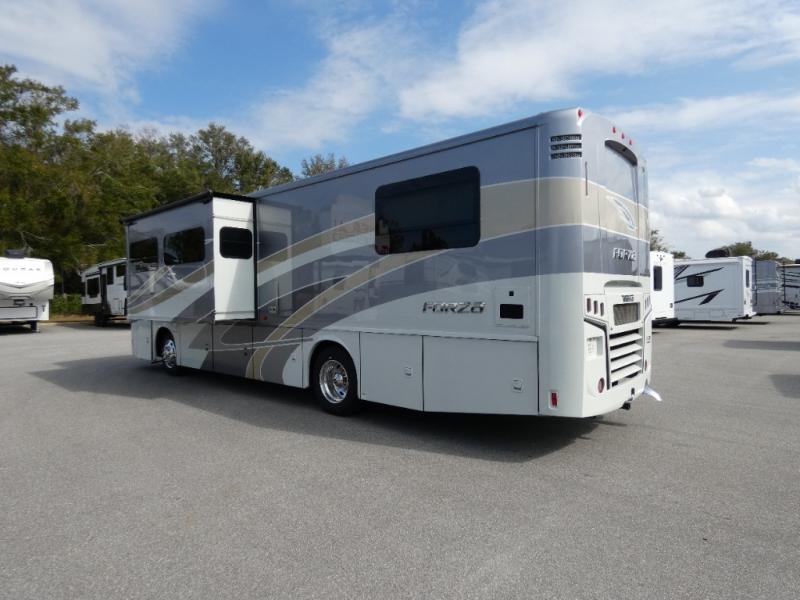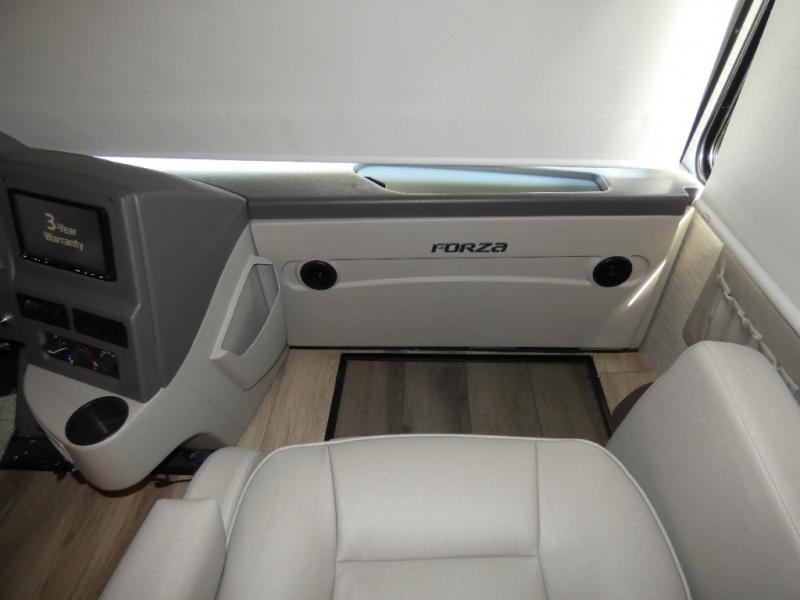 There isn't a thing you won't love about the Winnebago Forza Class A diesel motorhome! These powerful and practical coaches have excellent quality in their construction, and the undercarriage lighting is quite stylish and impressive. You'll find NeWay air suspension with V-Ride, automatic hydraulic leveling jacks, a 10,000-lb. hitch, and automatic entrance steps. Sitting in the cab will be enjoyable with the multi-adjustable swivel and recline seats, the radio/rearview monitor system with 9" LCD color touchscreen, the cellphone interface to radio, and the TRW® tilt/telescopic steering column with foot-actuated pedal. The interior has a Firefly switch panel that lights up when it's dark, and the 6,000W Cummins Onan generator is what you need to power your coach. You will also find vinyl flooring throughout, blackout roller shades, Corian countertops, a textured glass shower door, and many more comforts you'd expect to find at home!