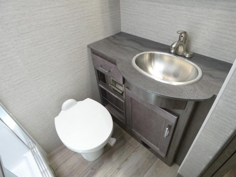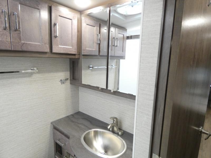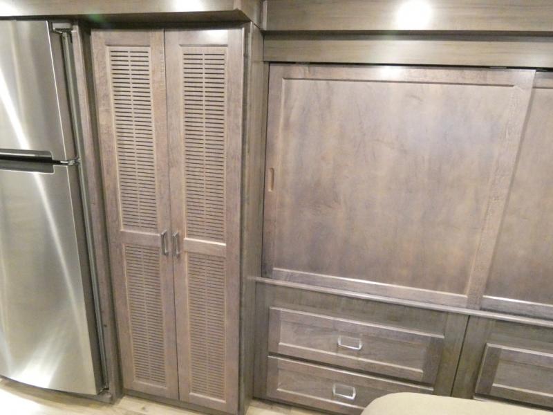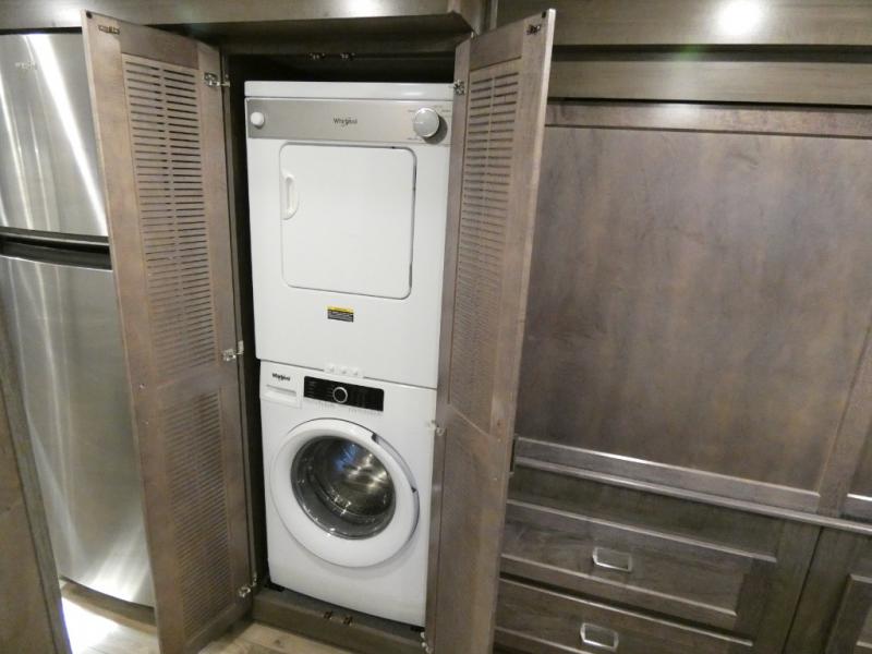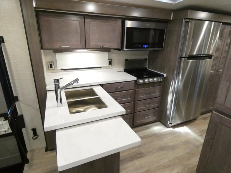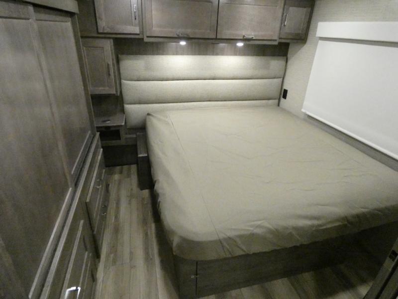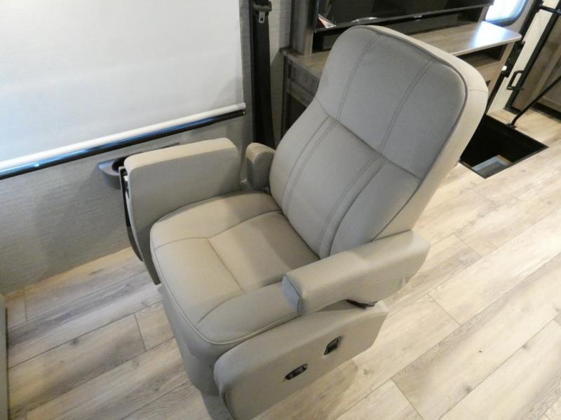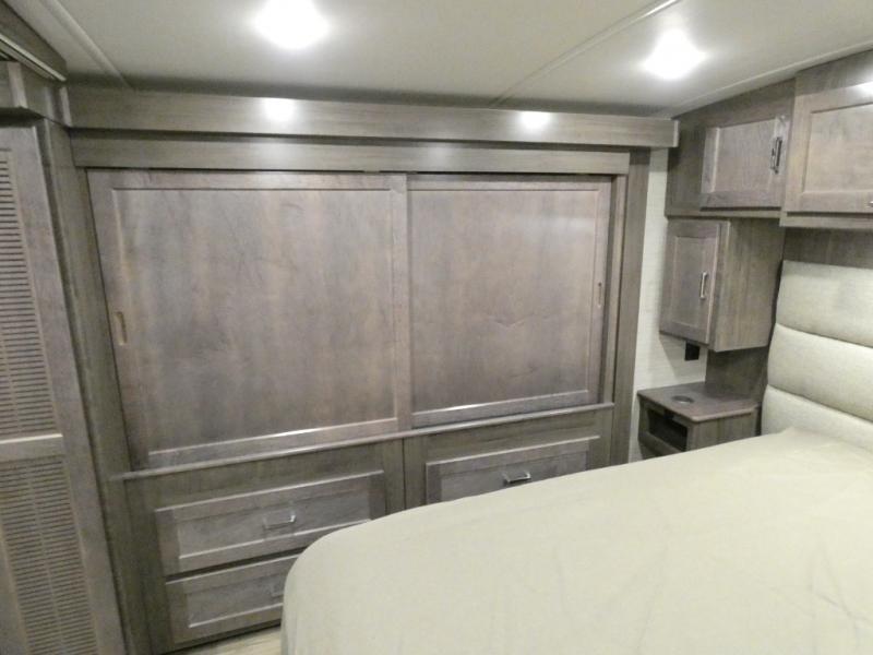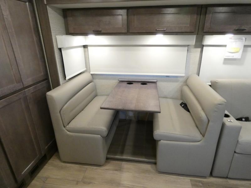 With this Forza Class A diesel motorhome, you won't even need to plan a destination because this coach is the only getaway you need! You could park it in your backyard and still feel as if you've gone away on a retreat. The interior has great accommodations with its BenchMark dinette, theater seating, and swivel/recline cab seats, and the large slide provides extra space for you to spread out and relax. The kitchen is fully equipped with the best tools, and the flip-up countertop extension is going to be helpful for providing extra counter space when it is pulled out into place. You will find another large slide that carries over from the kitchen into the bedroom, and the bedroom even has its very own 32" HDTV so that you can watch your favorite shows while lying down on the king-size bed.
