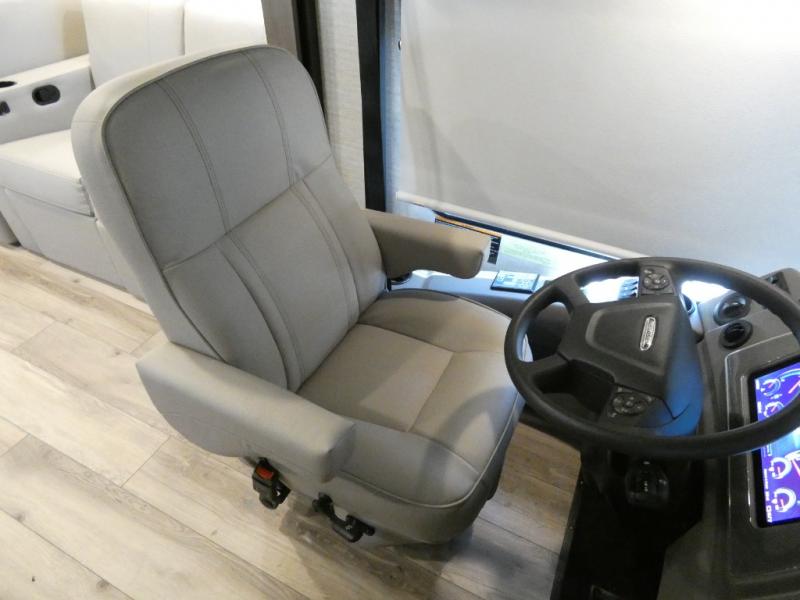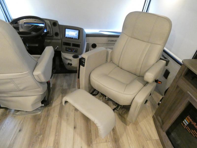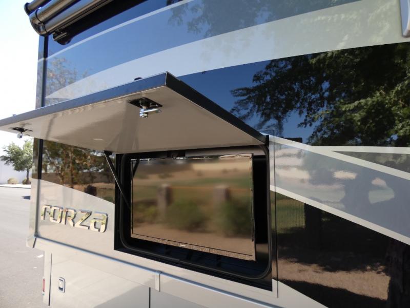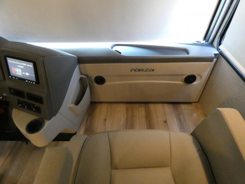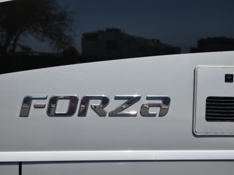 There isn't a thing you won't love about the Winnebago Forza Class A diesel motorhome! These powerful and practical coaches have excellent quality in their construction, and the undercarriage lighting is quite stylish and impressive. You'll find NeWay air suspension with V-Ride, automatic hydraulic leveling jacks, a 10,000-lb. hitch, and automatic entrance steps. Sitting in the cab will be enjoyable with the multi-adjustable swivel and recline seats, the radio/rearview monitor system with 9" LCD color touchscreen, the cellphone interface to radio, and the TRW® tilt/telescopic steering column with foot-actuated pedal. The interior has a Firefly switch panel that lights up when it's dark, and the 6,000W gas generator is what you need to power your coach. You will also find vinyl flooring throughout, blackout roller shades, Corian countertops, a textured glass shower door, and many more comforts you'd expect to find at home!