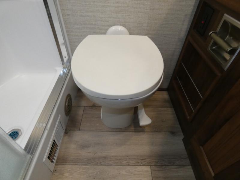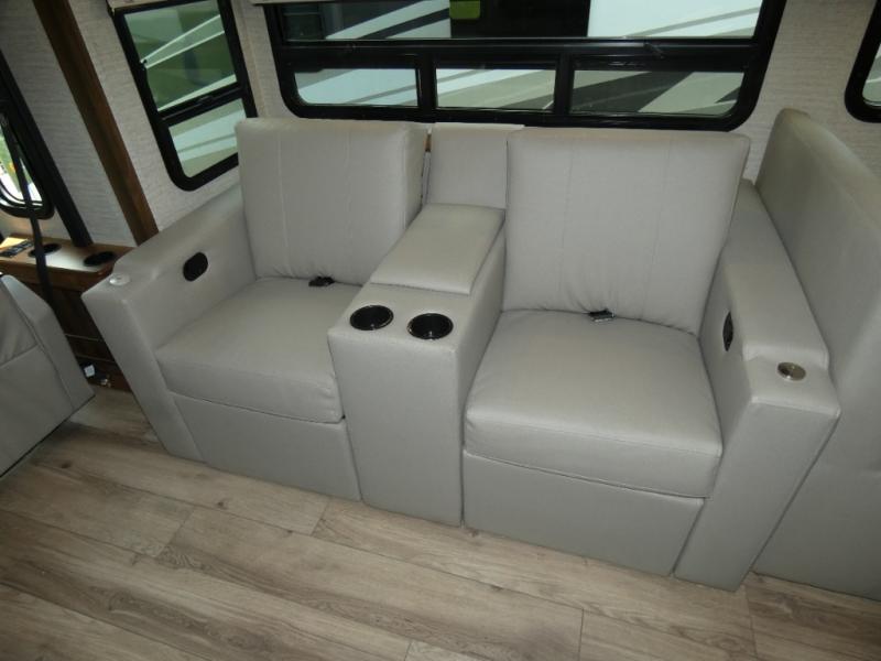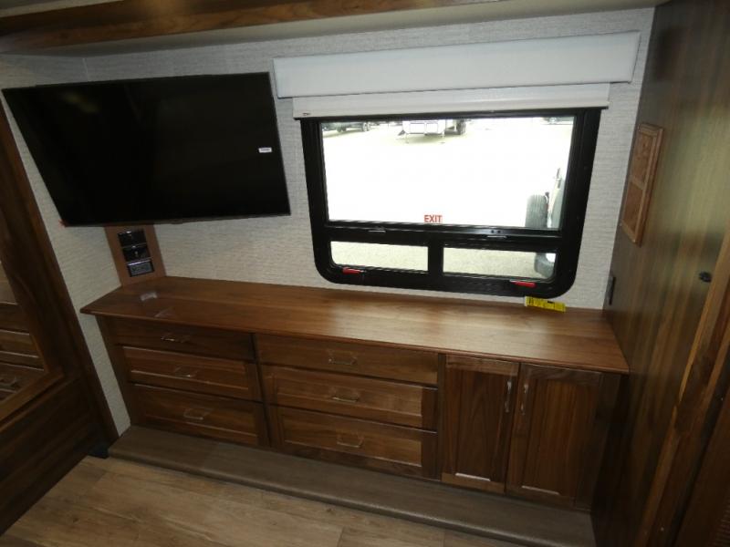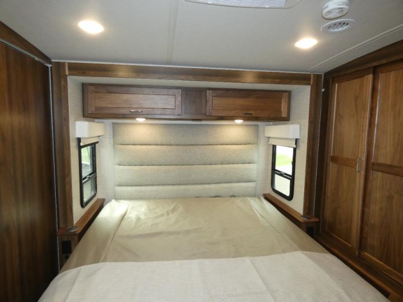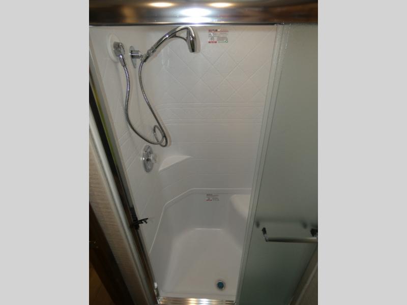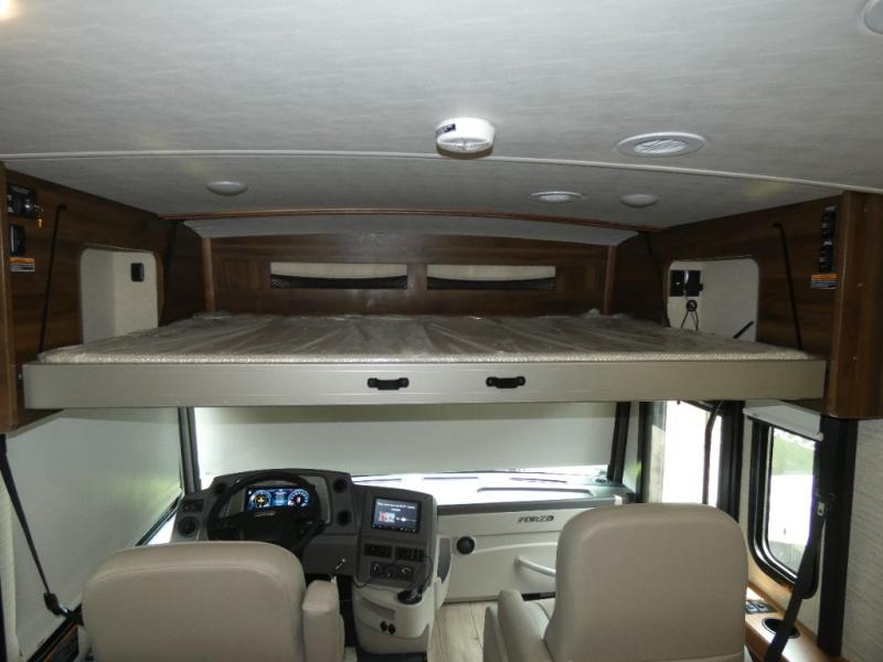 You can have many adventures of all sorts with this Forza Class A diesel motorhome! There is so much interior living space because of the three large slides, and there is also great relaxation found with the swivel/reclining cab seats, the BenchMark dinette, and the TrueComfort+ sofa. The private bedroom has quite a bit of storage space with its chest of drawers and full-width wardrobe, and there is also a 40" HDTV and queen-size bed with nightstands on either side. The kitchen is going to be amazingly helpful with its residential refrigerator, convection microwave, flip-up countertop extension, and pantry, and you will also love having a full bathroom with a 38" x 30" shower with seat, a textured glass shower door, and a bath skylight.
